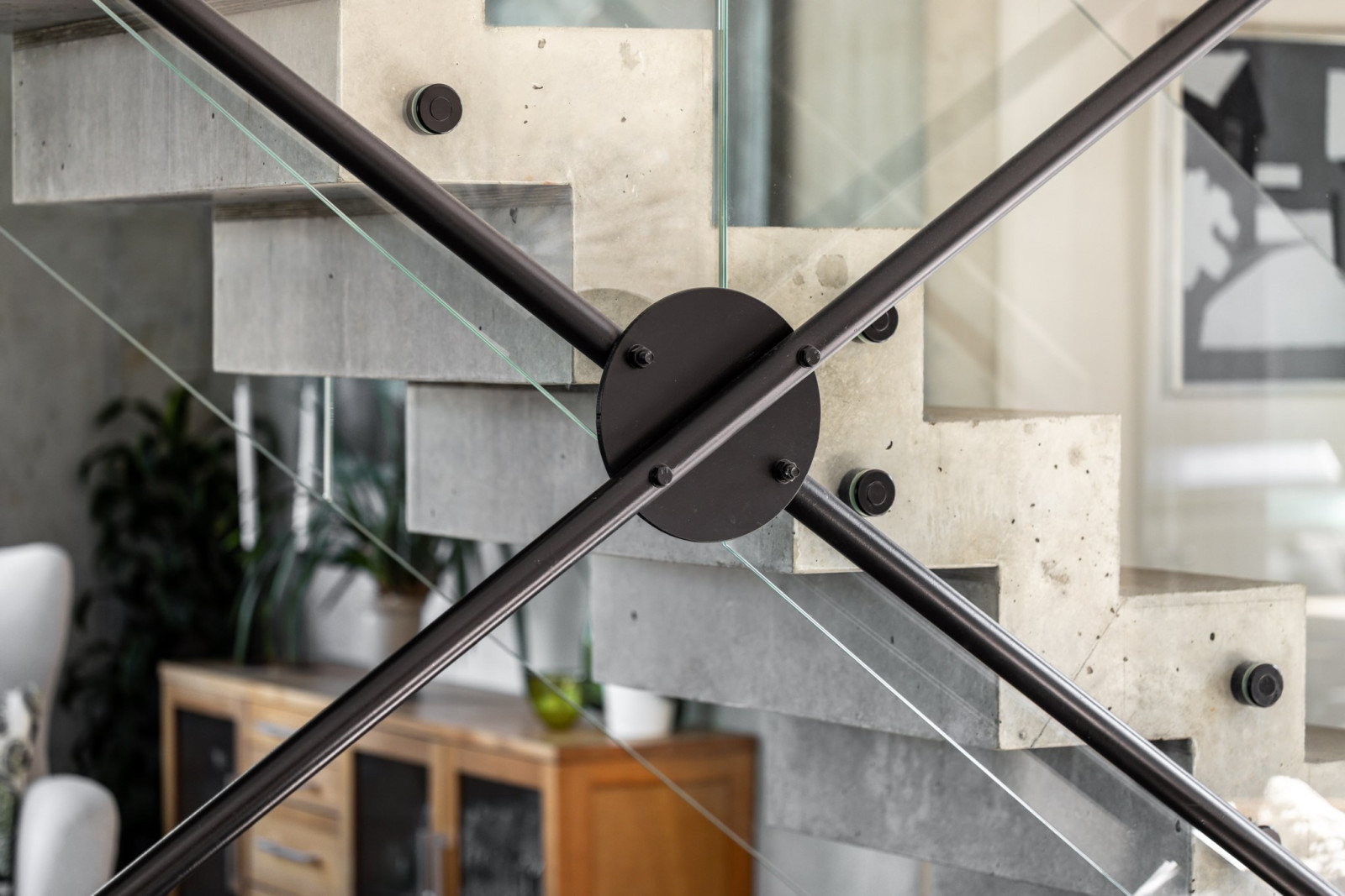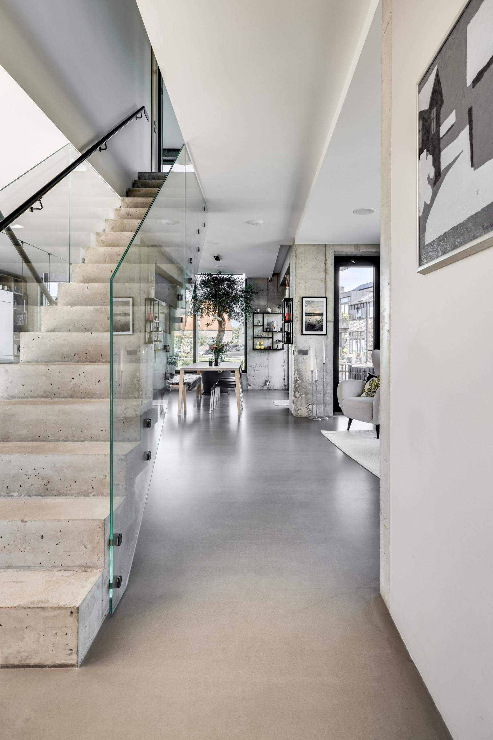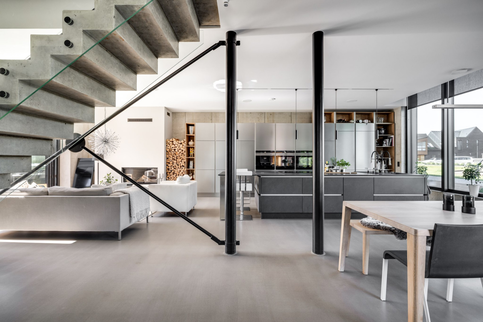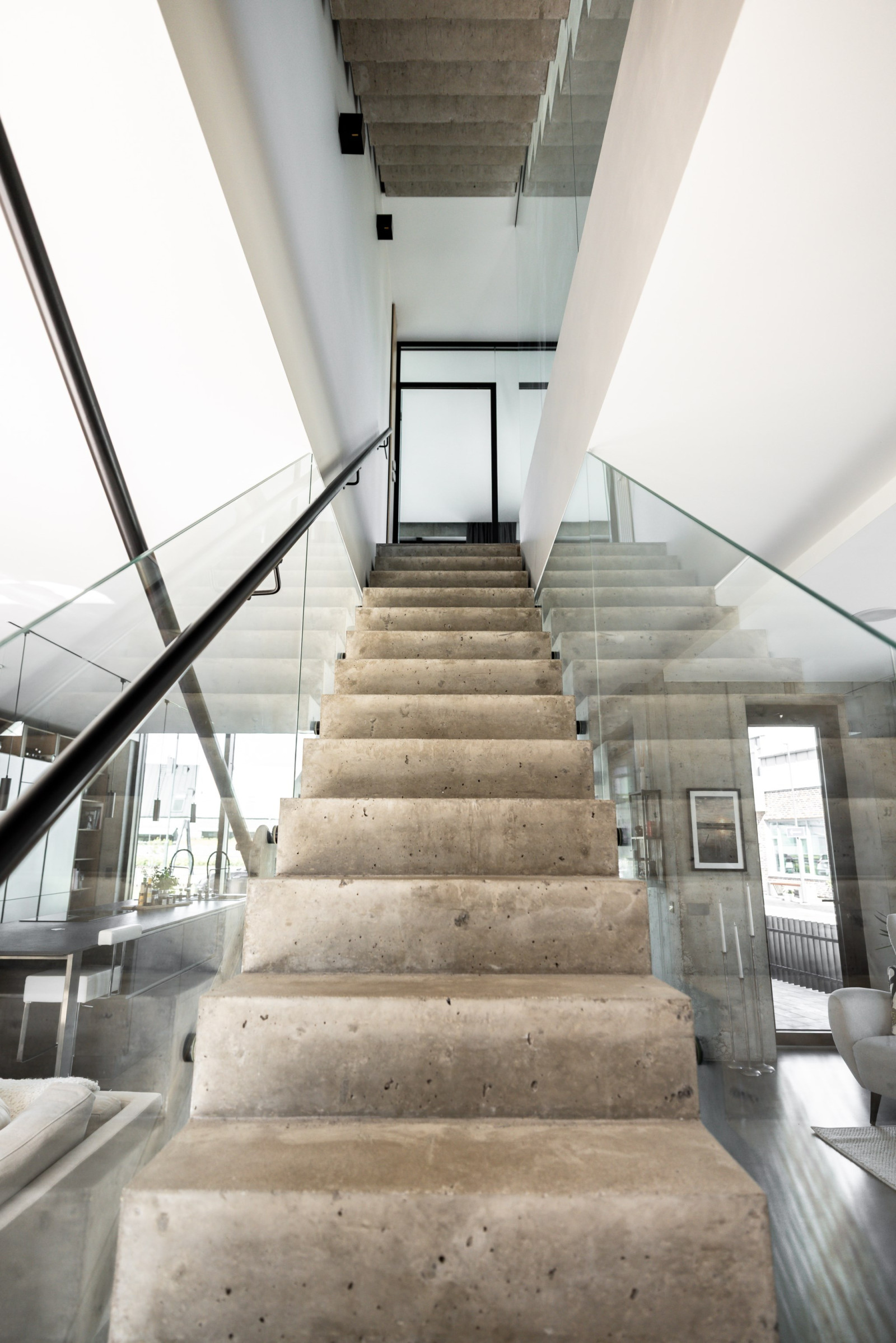 Mitt i rummet reser sig en skulptural betongtrappa med glasräcken som förbinder de två våningsplanen och samtidigt fungerar som ett arkitektoniskt statement. Elektriska gardiner styrs via Somfy, inbyggda takskenor ger flexibel belysning och integrerade takhögtalare, förhöjer helhetsupplevelsen.