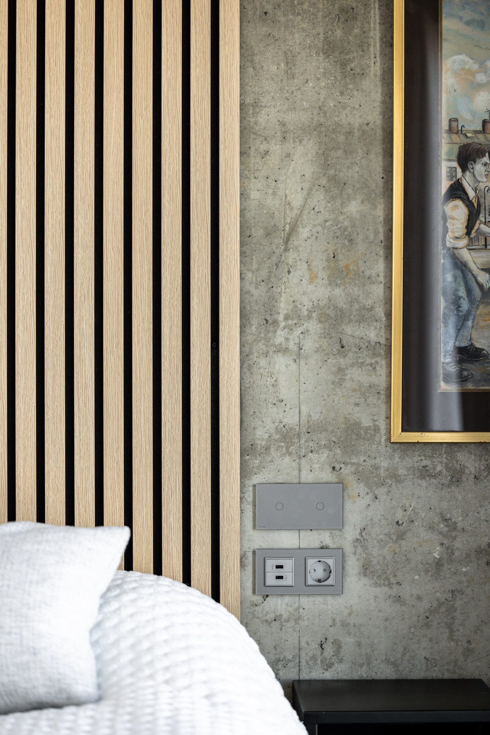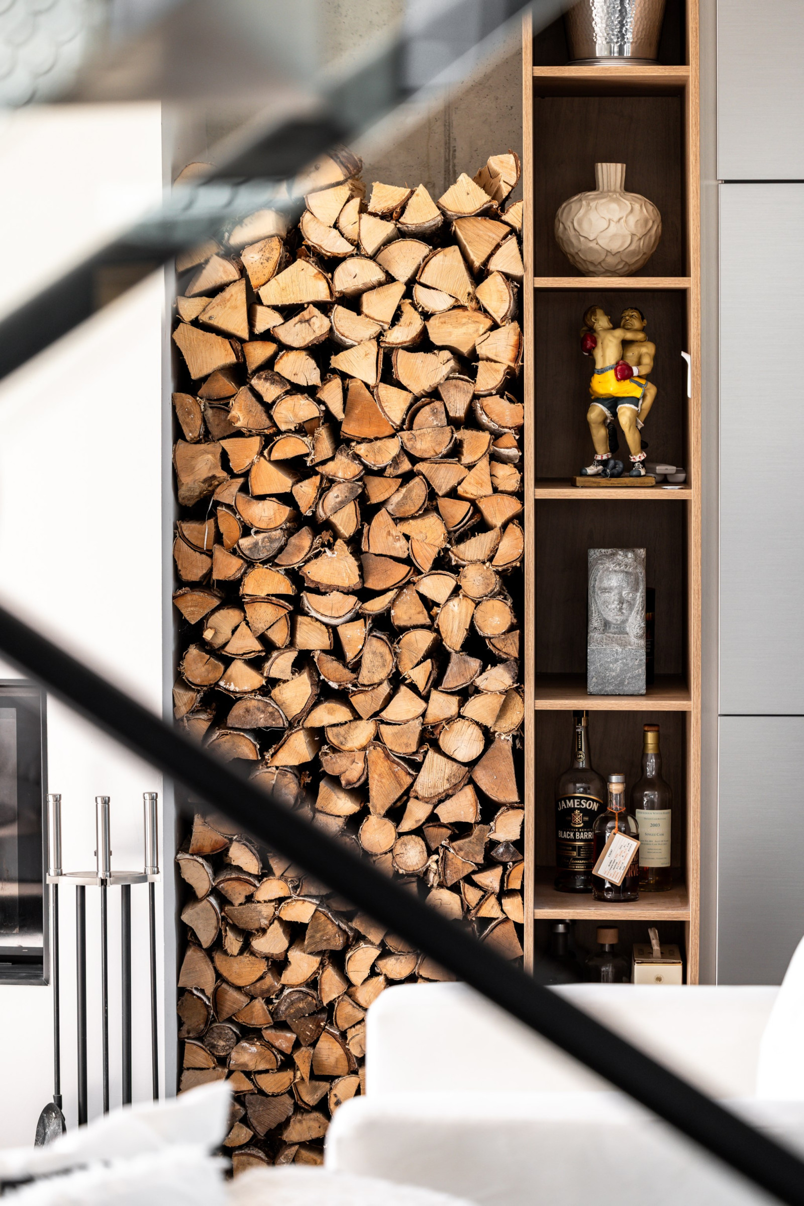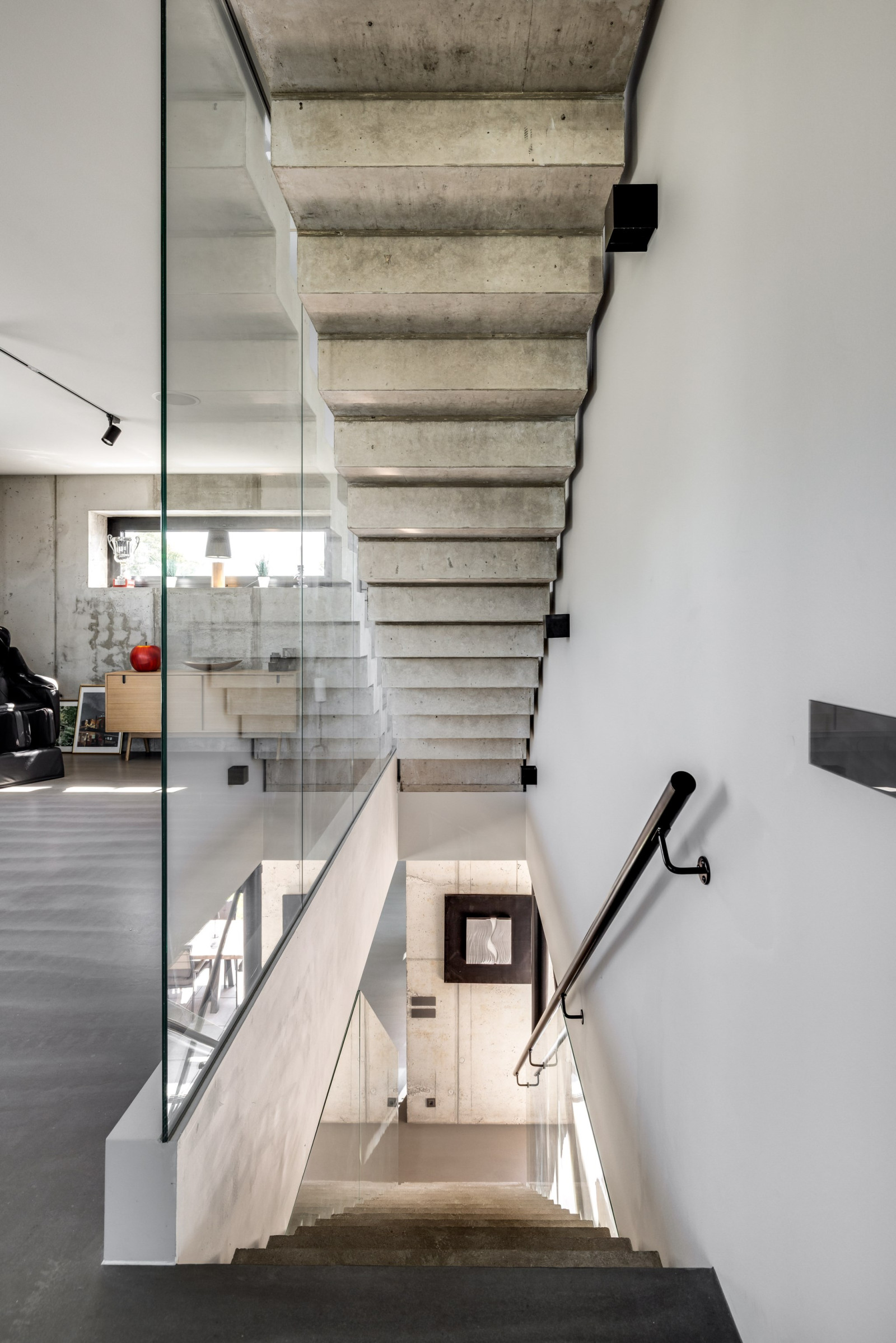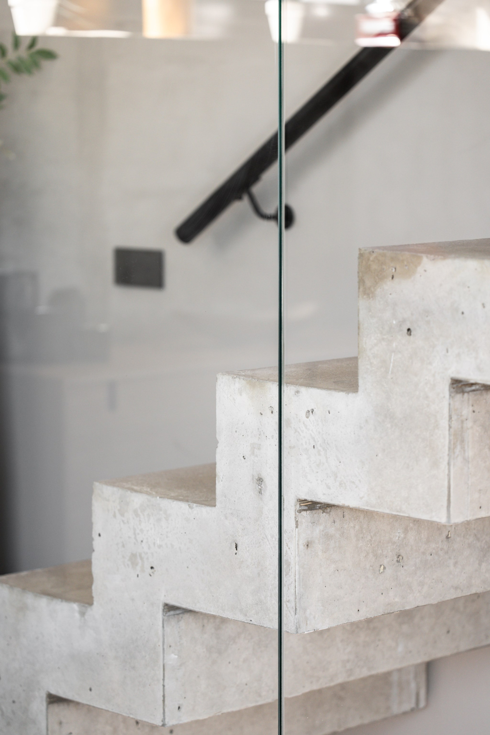 Mitt i rummet reser sig en skulptural betongtrappa med glasräcken som förbinder de två våningsplanen och samtidigt fungerar som ett arkitektoniskt statement. Elektriska gardiner styrs via Somfy, inbyggda takskenor ger flexibel belysning och integrerade takhögtalare, förhöjer helhetsupplevelsen.