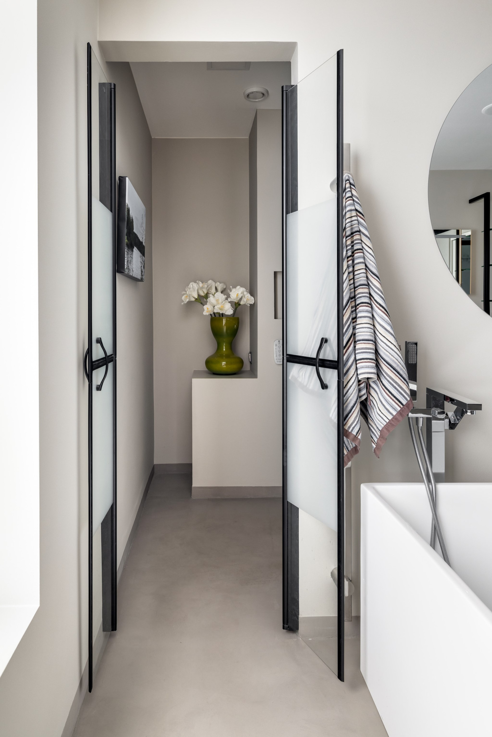 Huvudentrén är utrustad med en hel elektronisk ytterdörr som öppnas diskret med ett knapptryck – en detalj som sätter tonen för den avancerade teknik som präglar hela bostaden. I direkt anslutning till hallen finns en gästtoalett med beröringsfri blandare för en extra bekväm vardag.