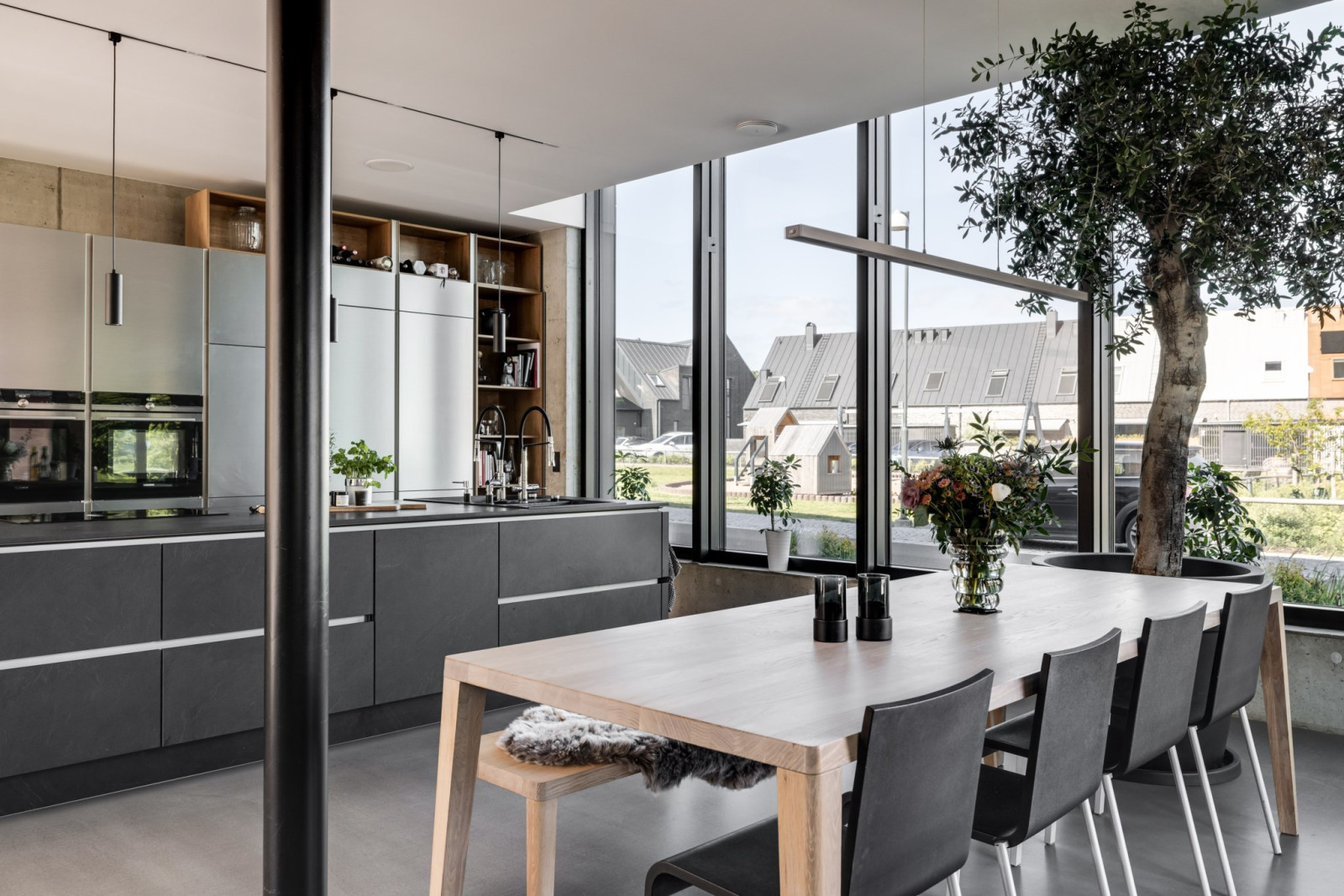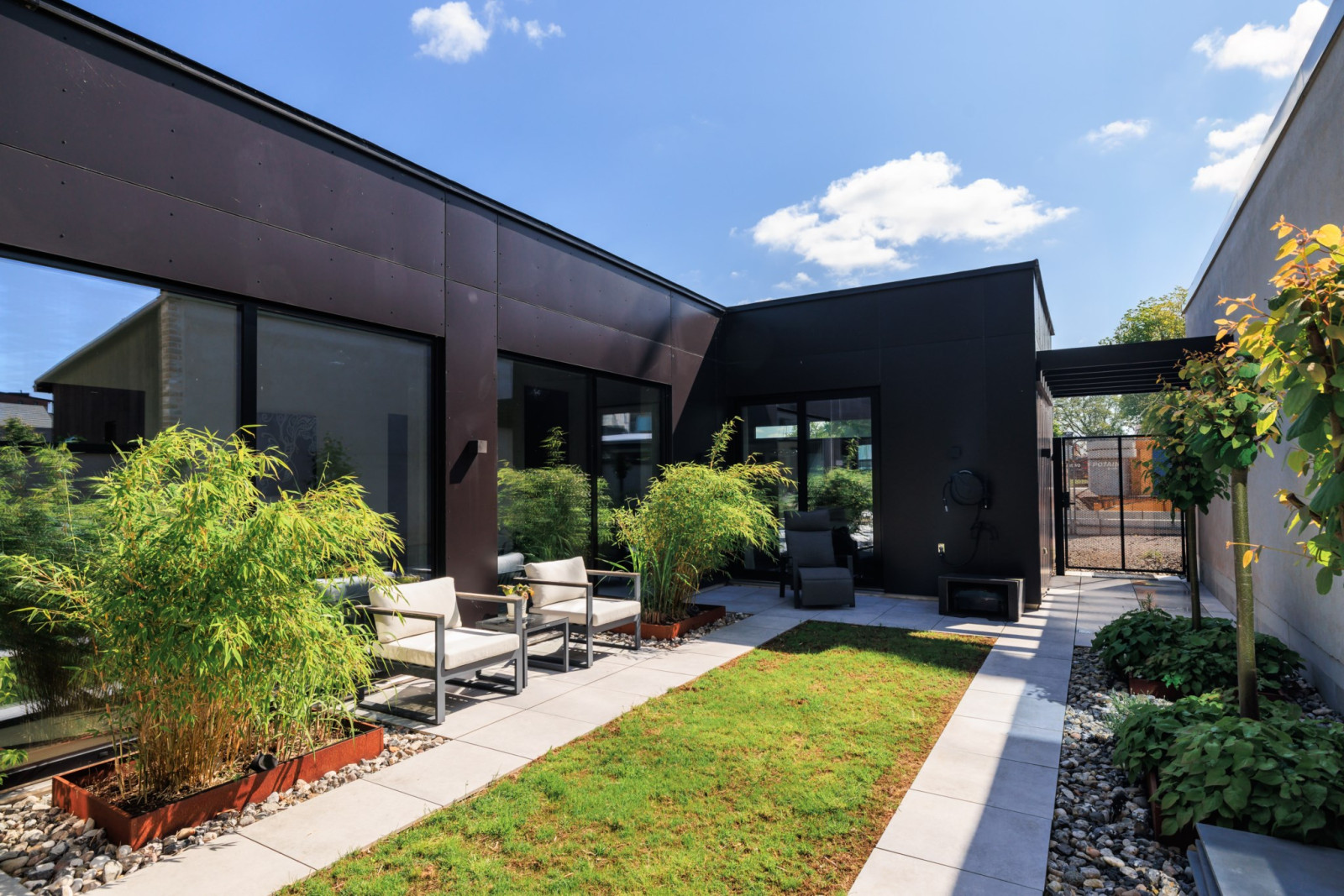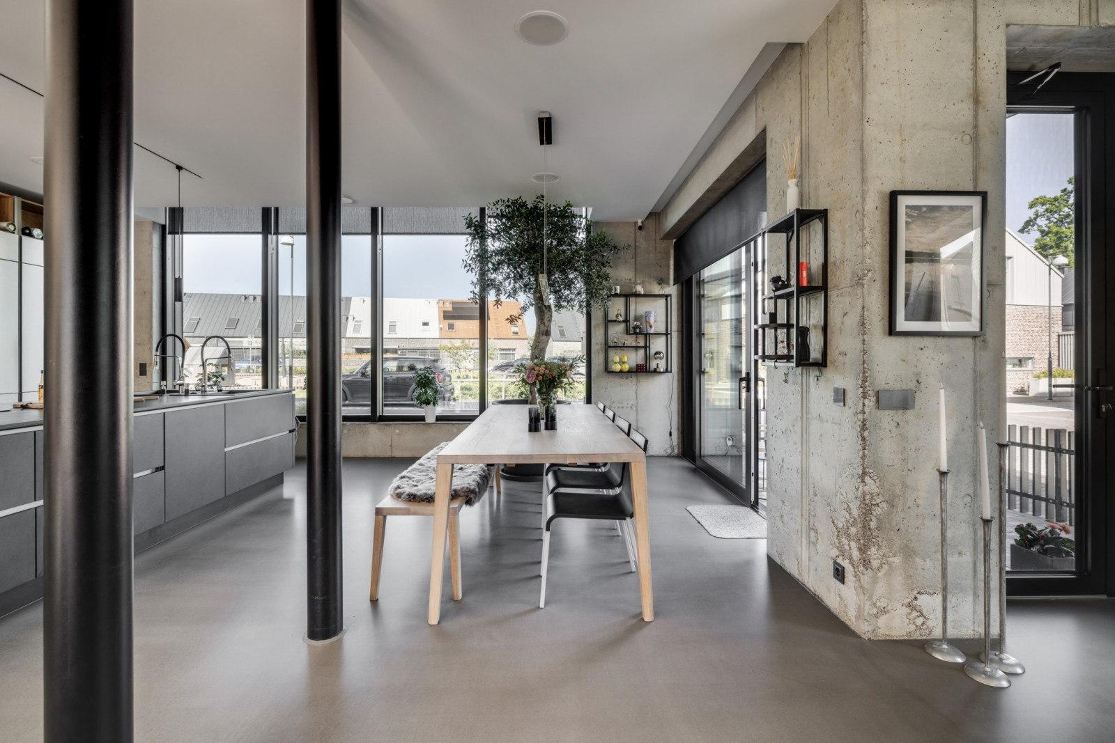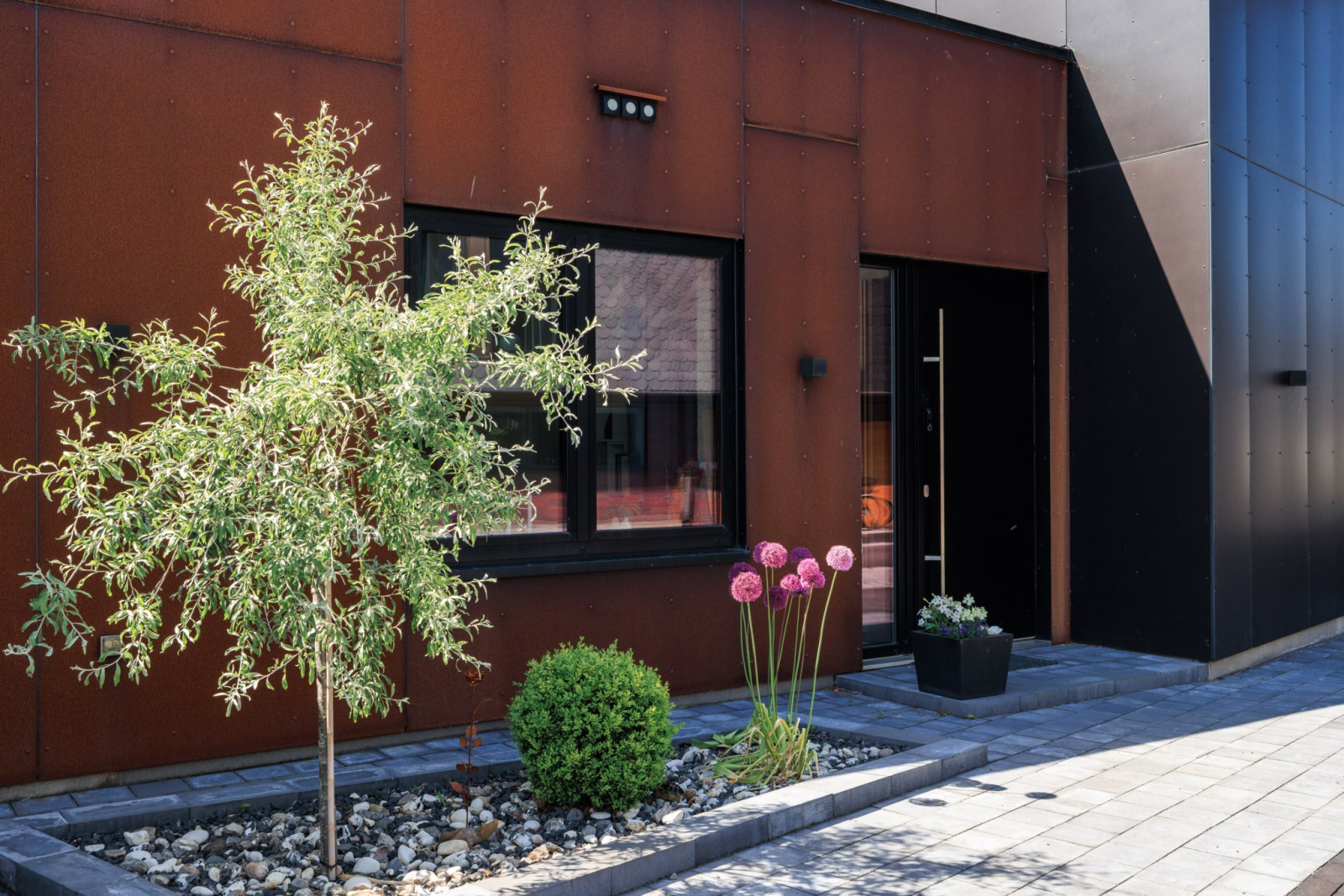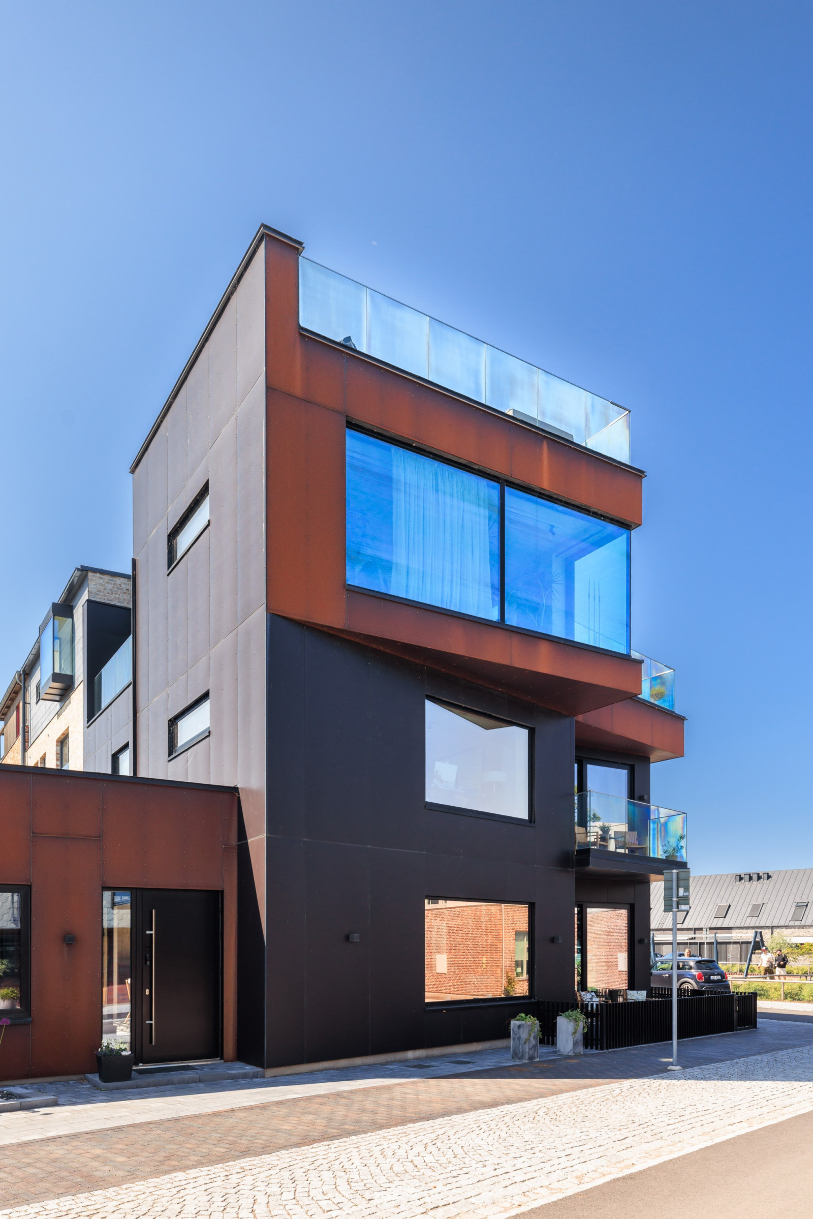 Huset är klätt i svart plåt och rostfärgad cortenstål – ett självsäkert uttryck som direkt fångar blicken. Råa, synliga betongväggar möter stora fönsterpartier som suddar ut gränsen mellan inne och ute, ljusflödet är konstant och rymden enorm.