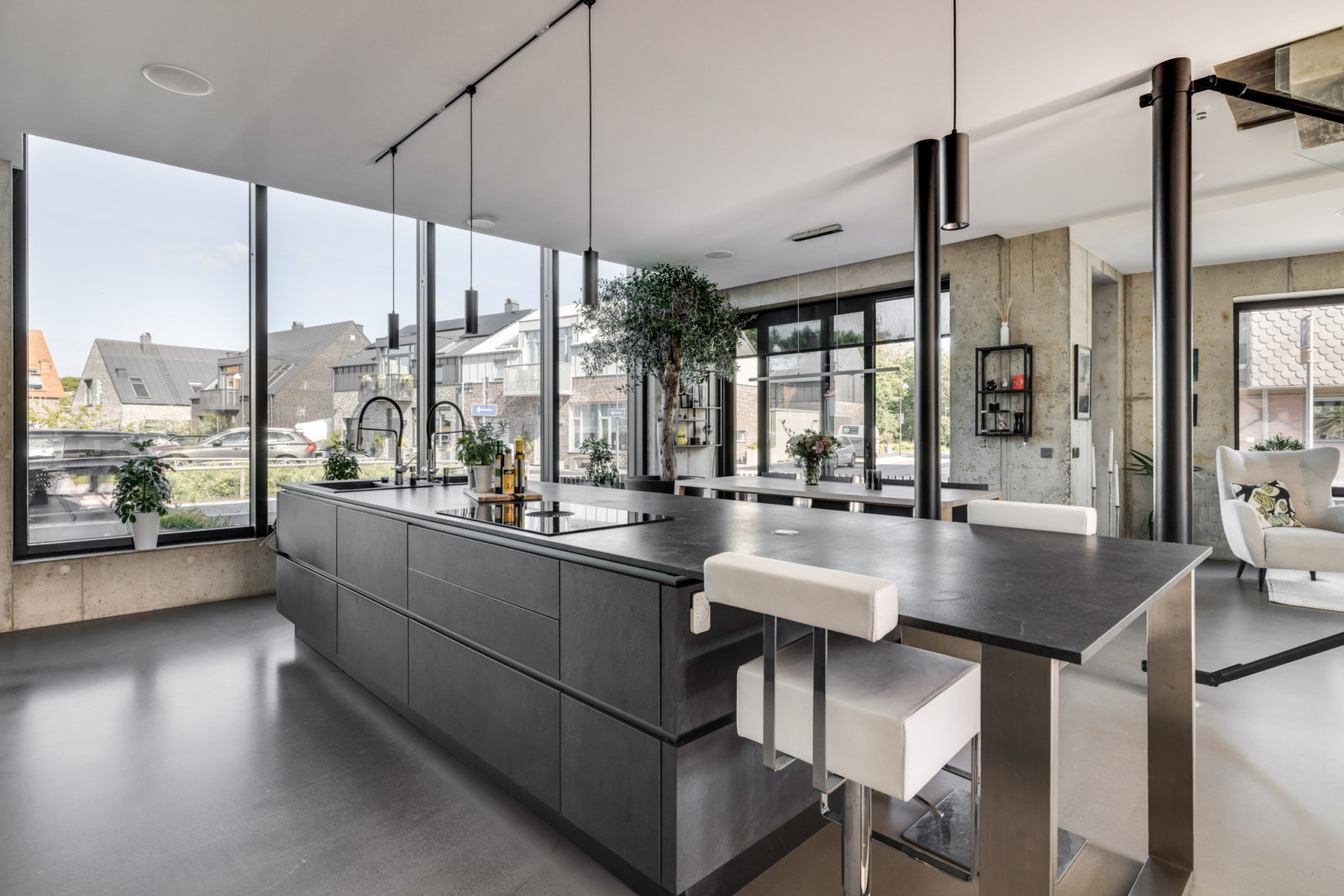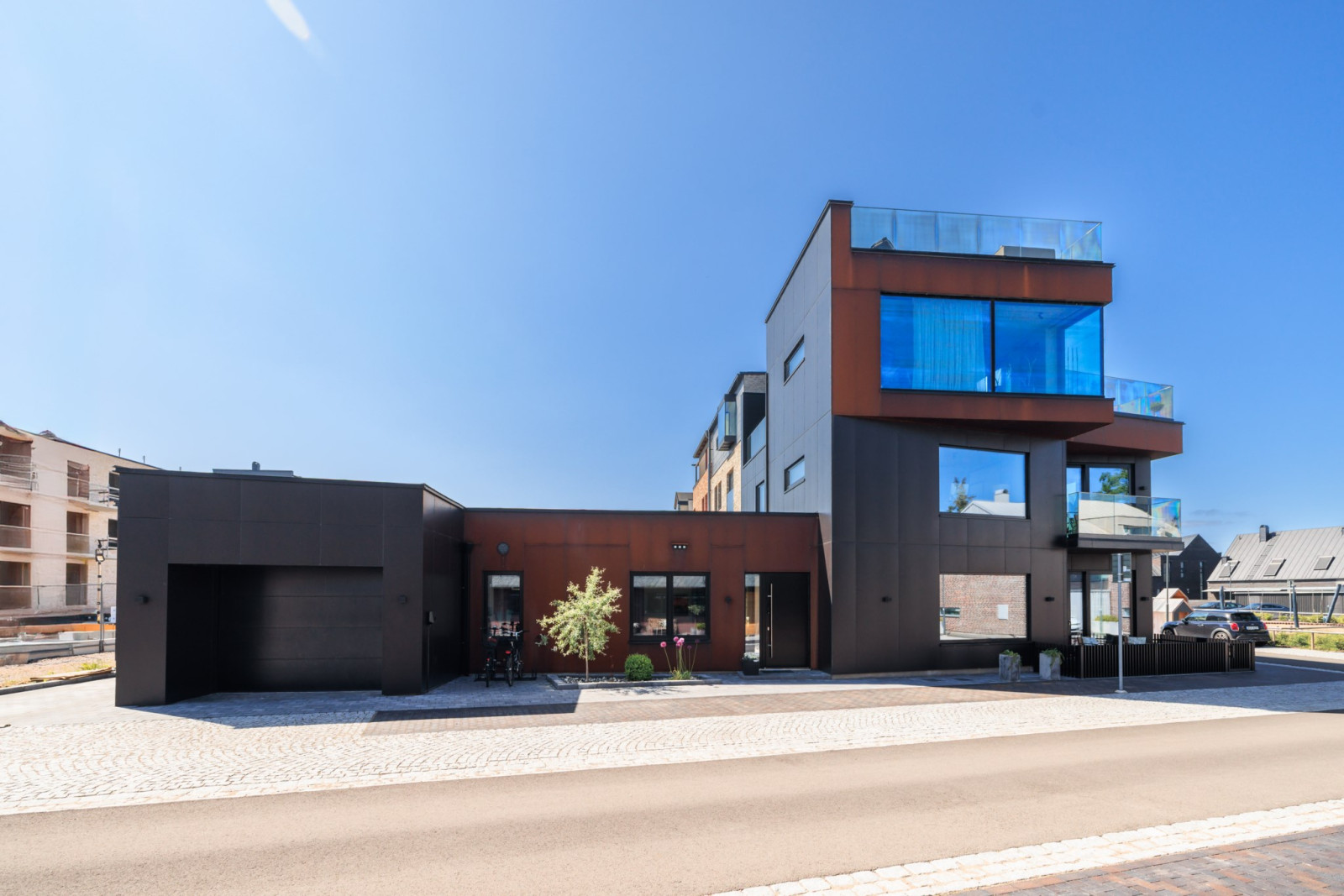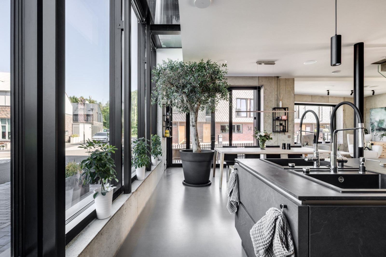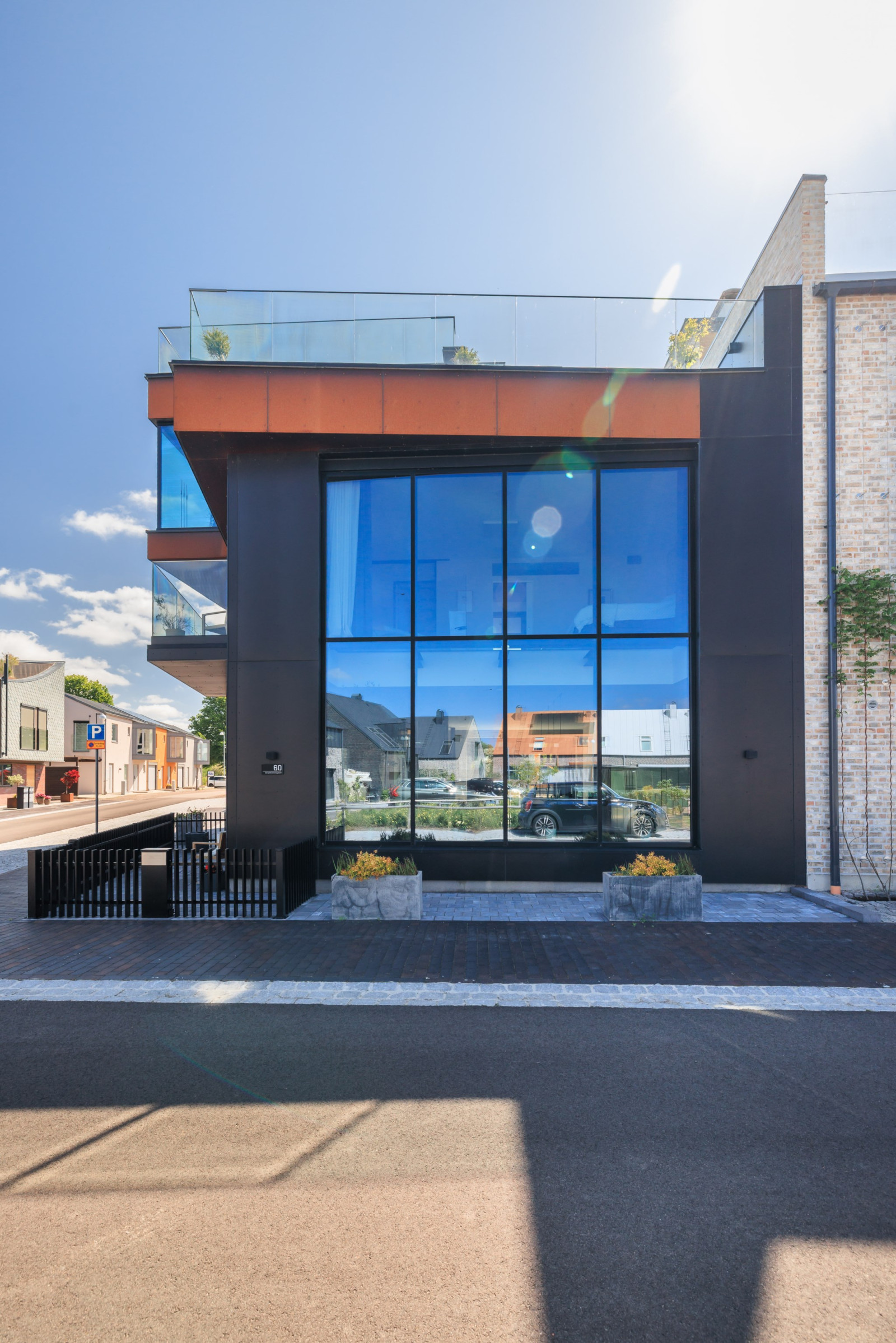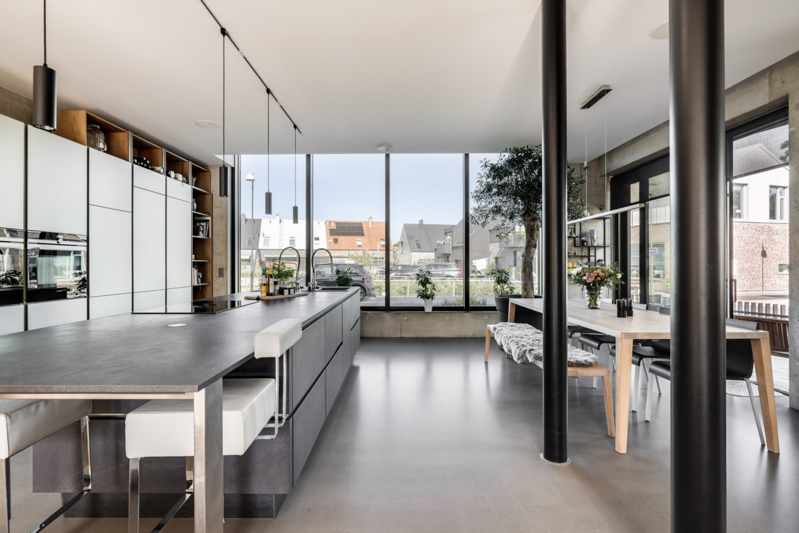Huset är klätt i svart plåt och rostfärgad cortenstål – ett självsäkert uttryck som direkt fångar blicken. Råa, synliga betongväggar möter stora fönsterpartier som suddar ut gränsen mellan inne och ute, ljusflödet är konstant och rymden enorm.