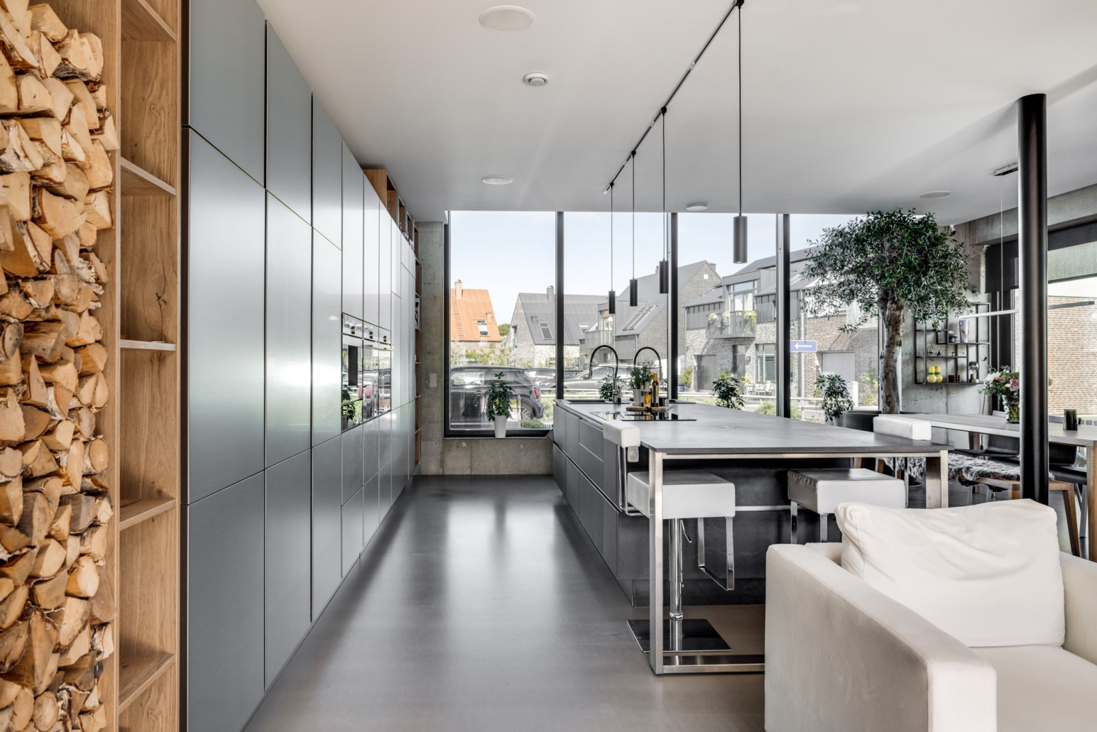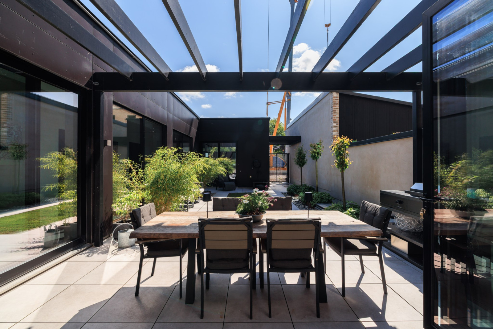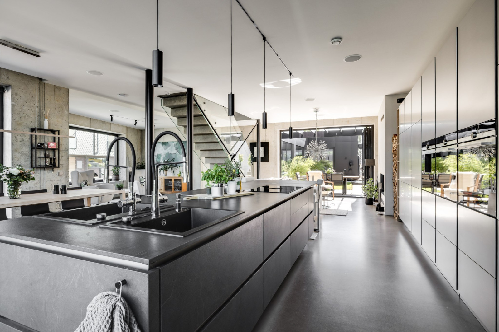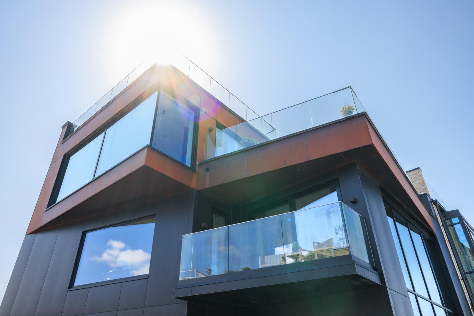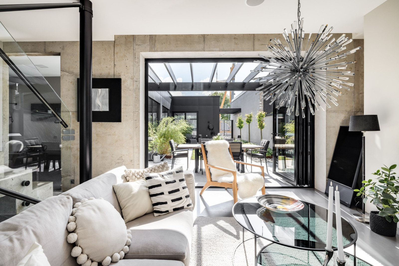 Huset är klätt i svart plåt och rostfärgad cortenstål – ett självsäkert uttryck som direkt fångar blicken. Råa, synliga betongväggar möter stora fönsterpartier som suddar ut gränsen mellan inne och ute, ljusflödet är konstant och rymden enorm.