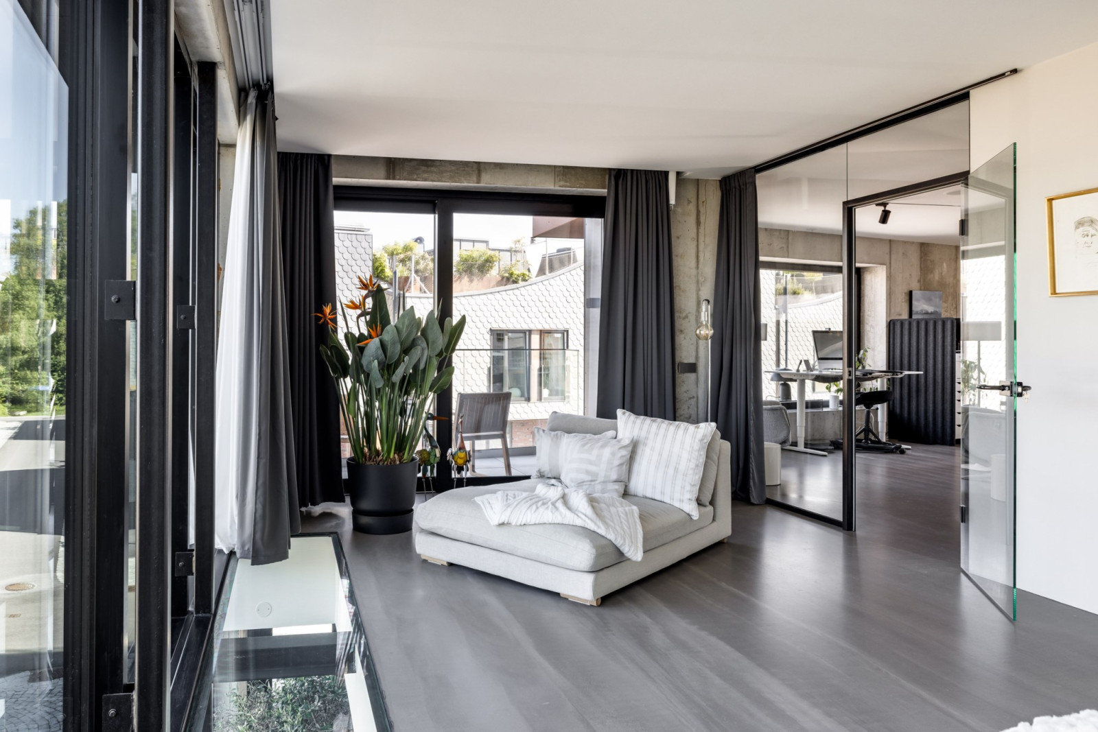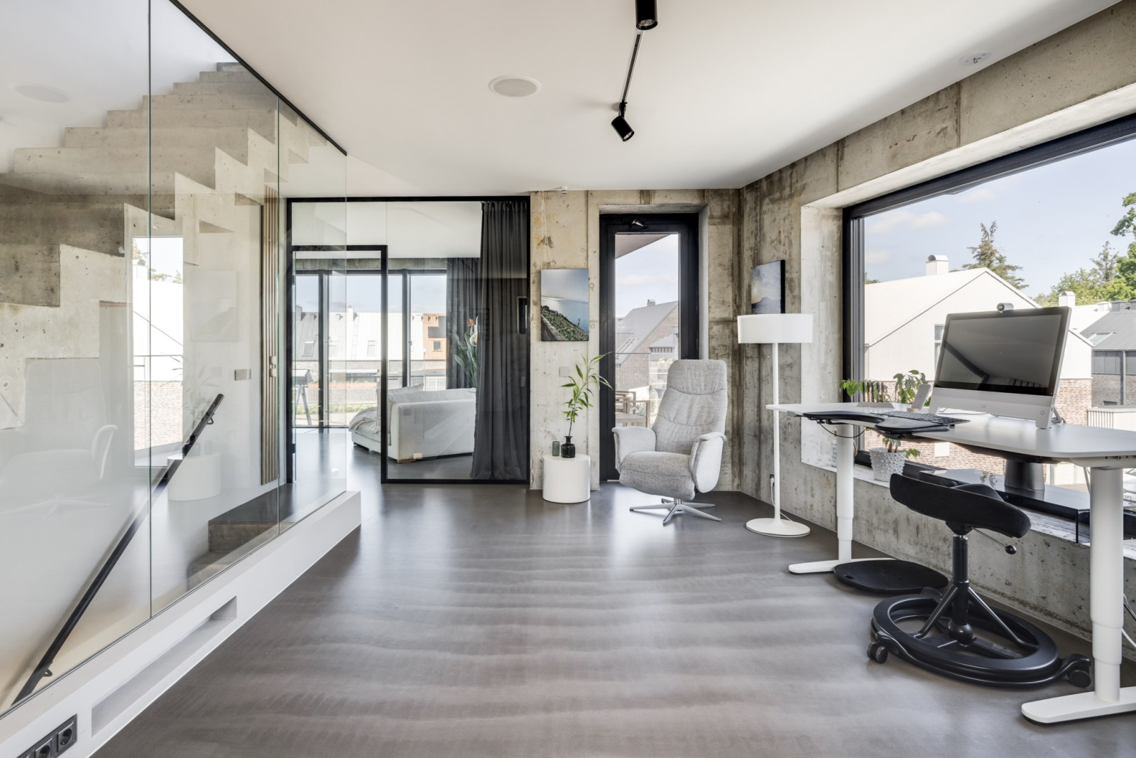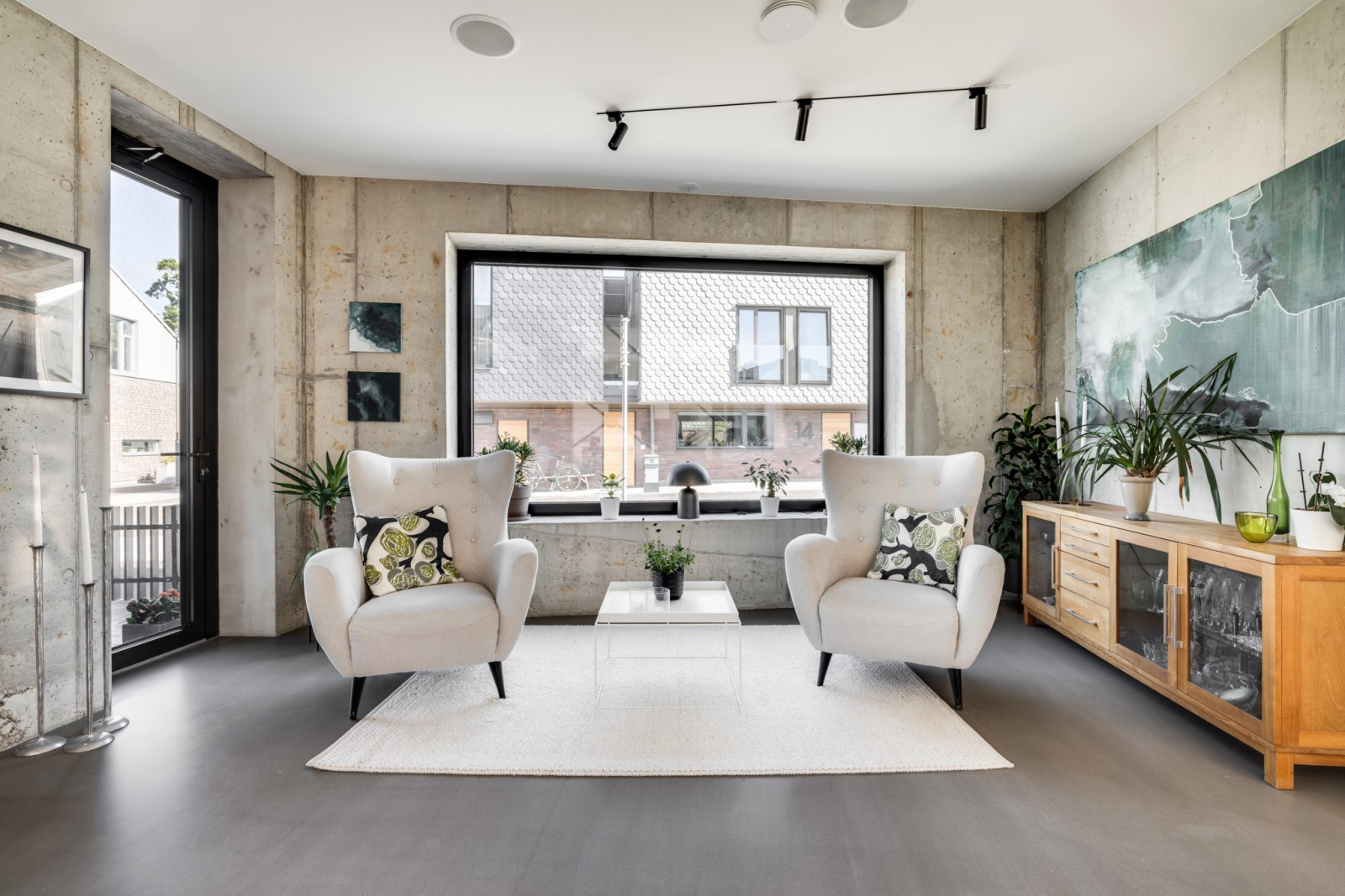 Till vänster om entrén fortsätter bostaden i en ljus passage med stora glaspartier mot den privata trädgården. Här ligger ett rofyllt arbetsrum – perfekt för den som arbetar hemifrån eller önskar ett avskilt gästrum. Utsikten mot gatan och det generösa ljusinsläppet skapar en inspirerande miljö, medan de synliga betongväggarna ger rummet karaktär.