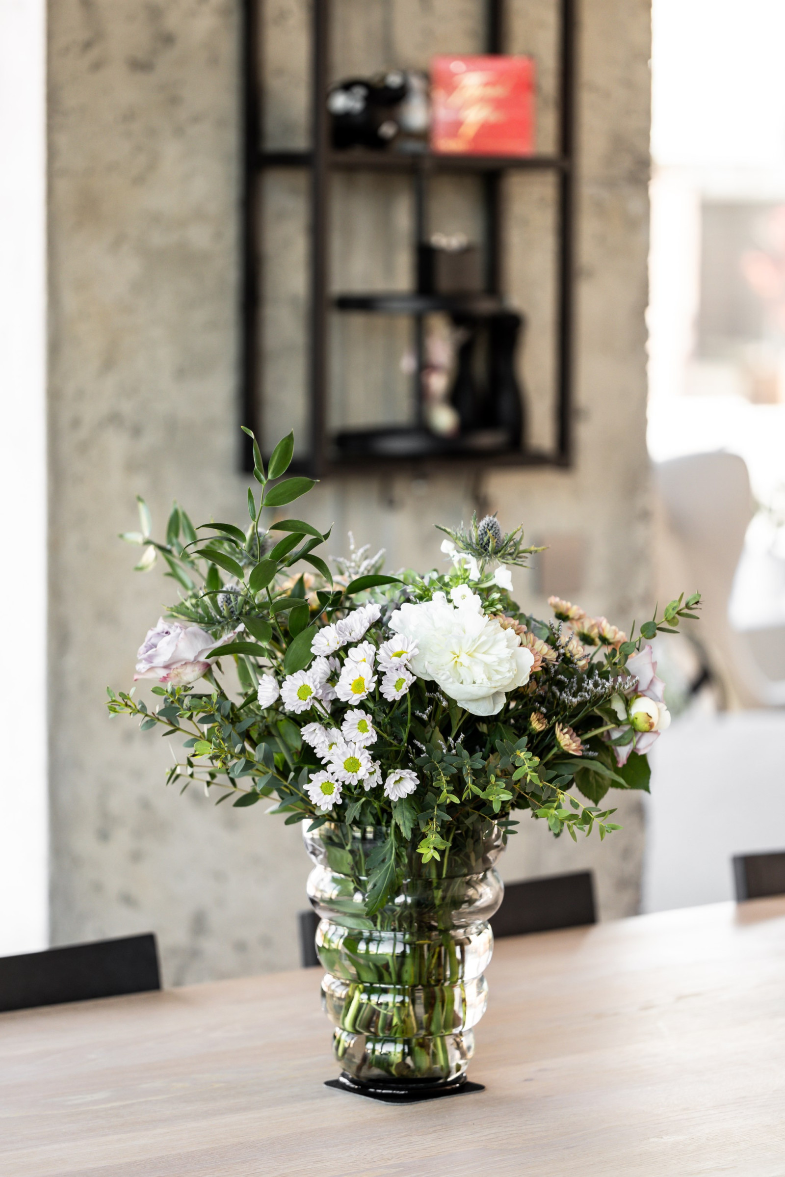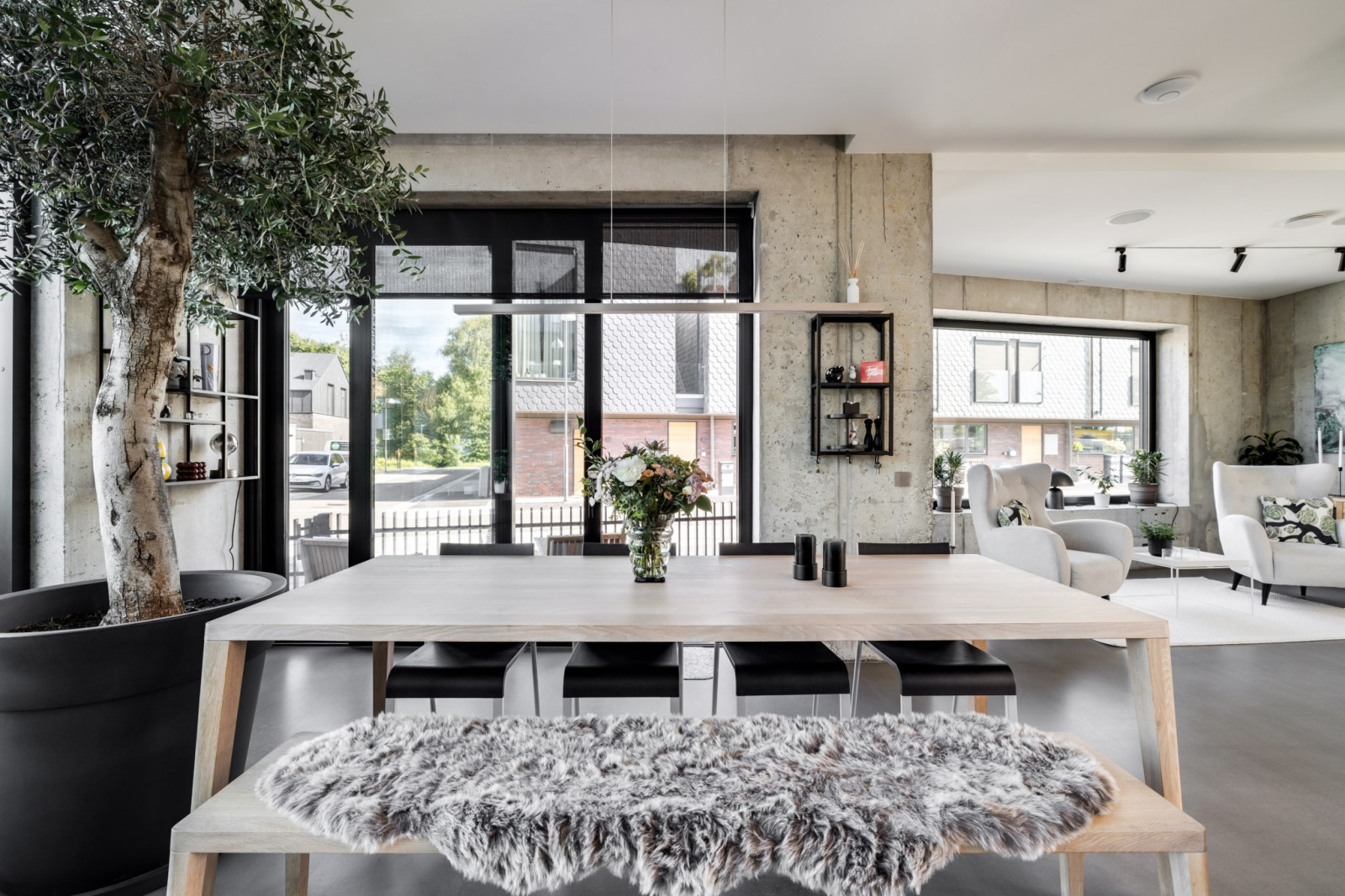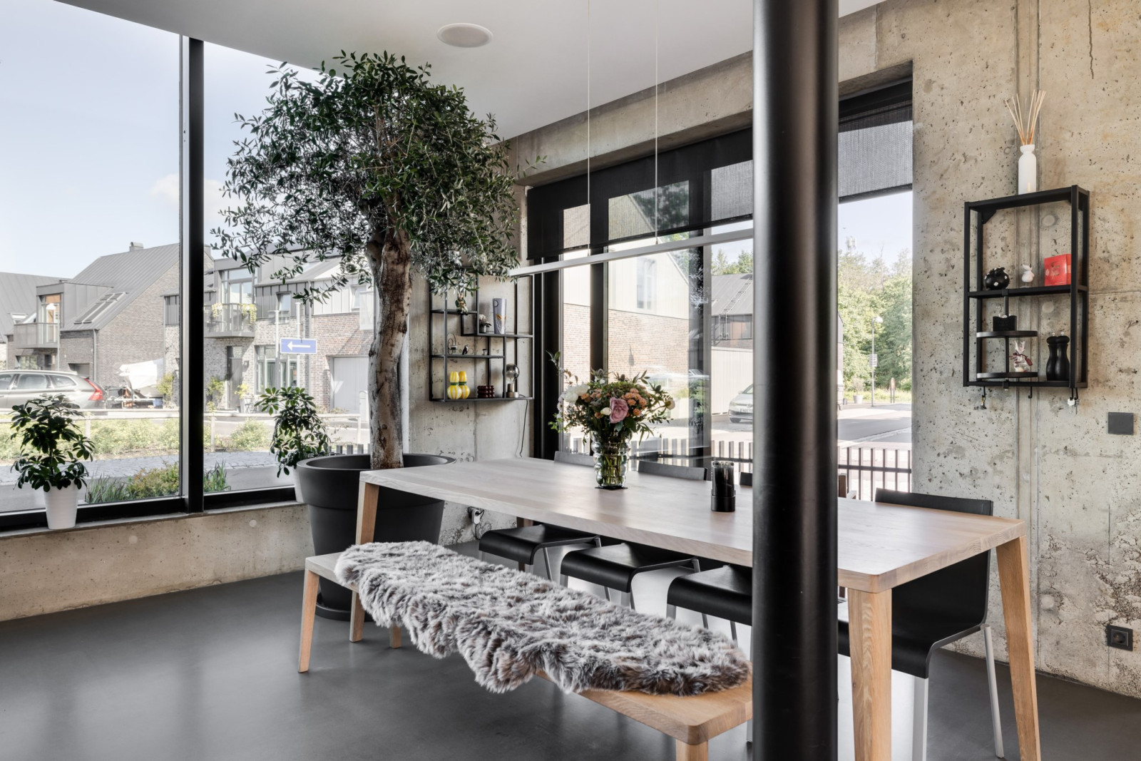 Till vänster om entrén fortsätter bostaden i en ljus passage med stora glaspartier mot den privata trädgården. Här ligger ett rofyllt arbetsrum – perfekt för den som arbetar hemifrån eller önskar ett avskilt gästrum. Utsikten mot gatan och det generösa ljusinsläppet skapar en inspirerande miljö, medan de synliga betongväggarna ger rummet karaktär.