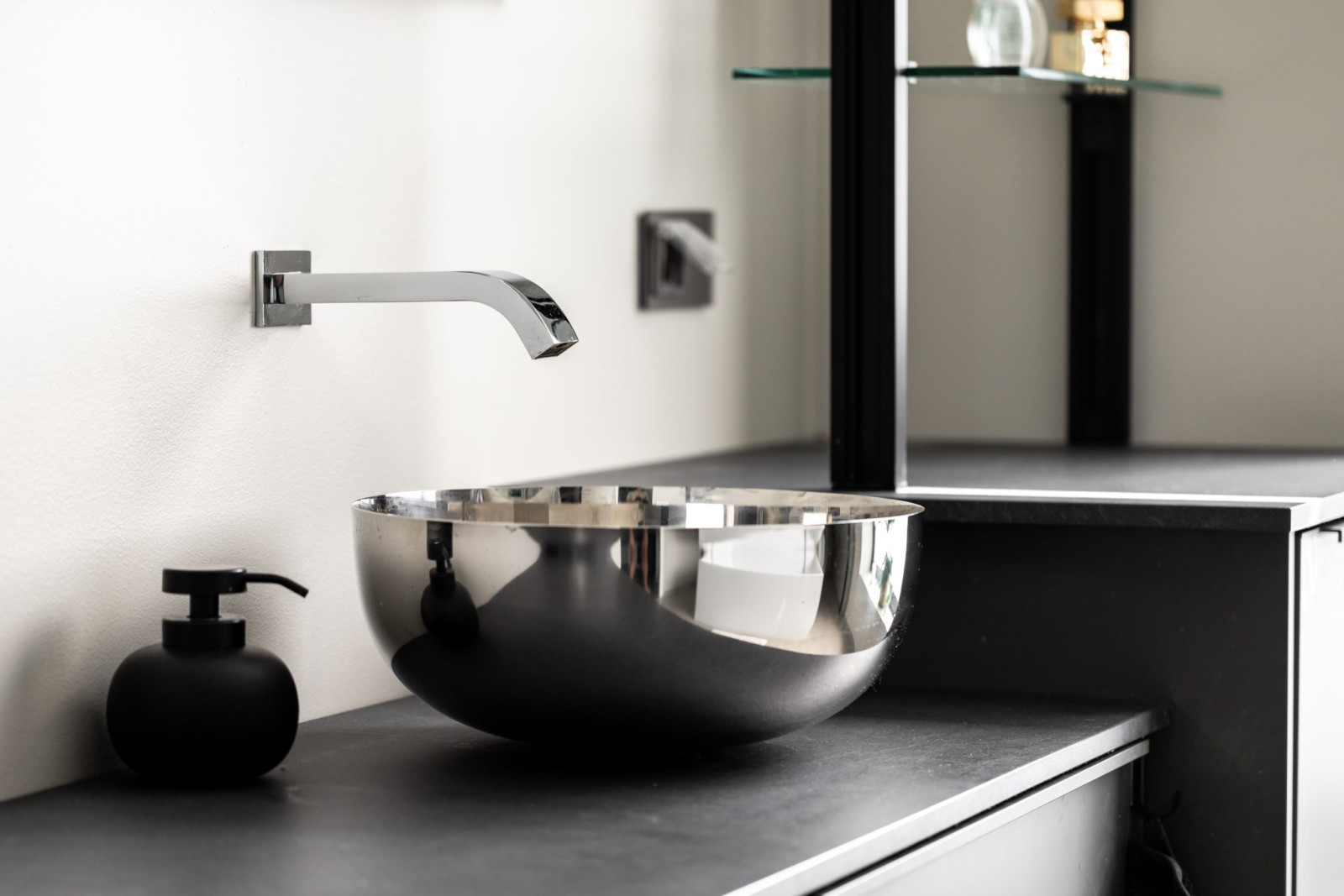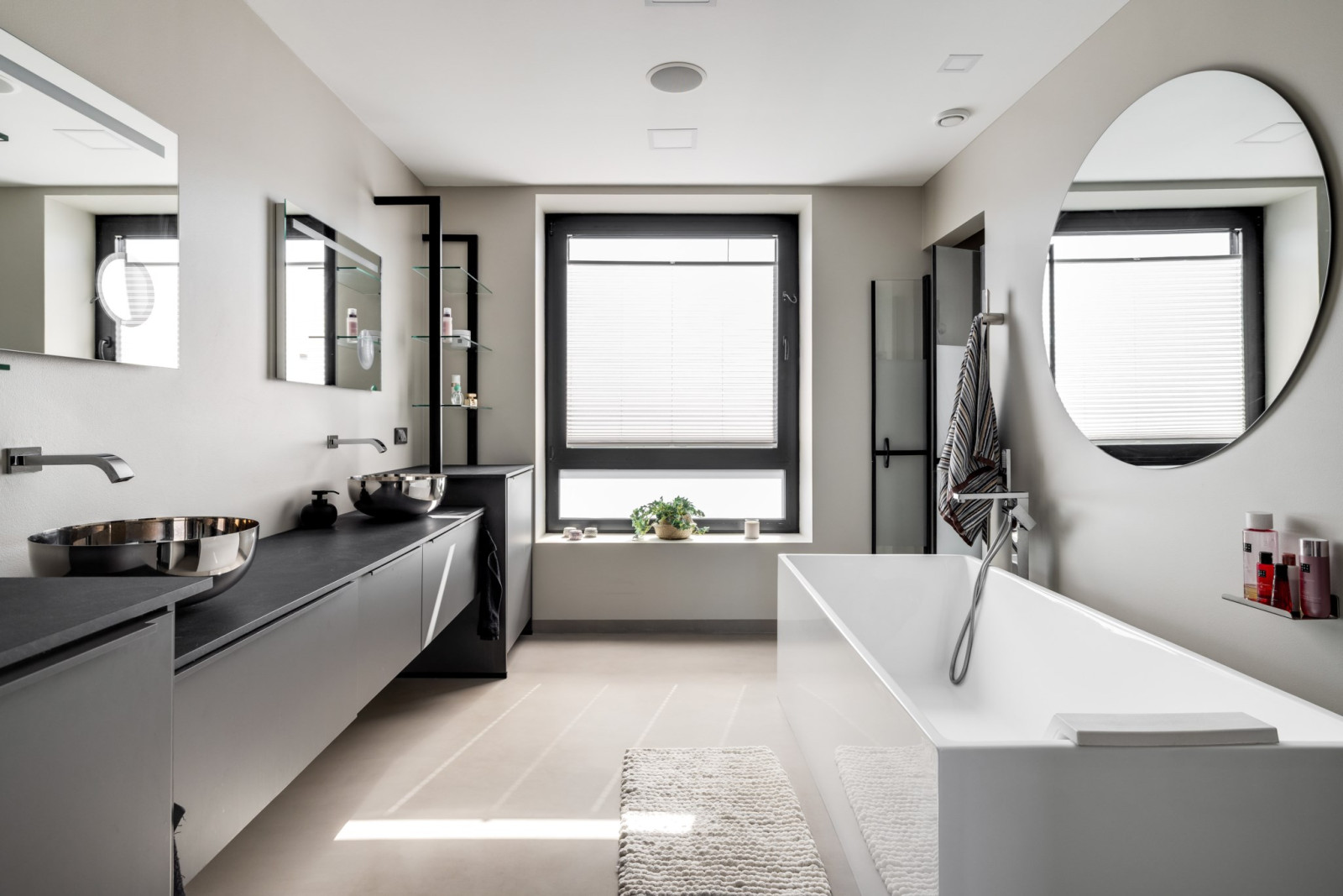 En rymlig walk-in closet med platsbyggd förvaring binder samman sovrummet med det exklusiva badrummet en suite. Här finns dubbla handfat, ett fristående badkar och separata dörrar till både toalett, inbyggd takdusch samt inbyggd kombitvättmaskin– allt med en känsla av diskret lyx och avskildhet. Badrummet är utrustat med beröringsfri kran, japansk toalett med fjärrkontroll och golvvärme, vilket skapar en upplevelse som lika gärna hade kunnat höra hemma på ett femstjärnigt hotell. Självklart finns inbyggda takhögtalare även här.