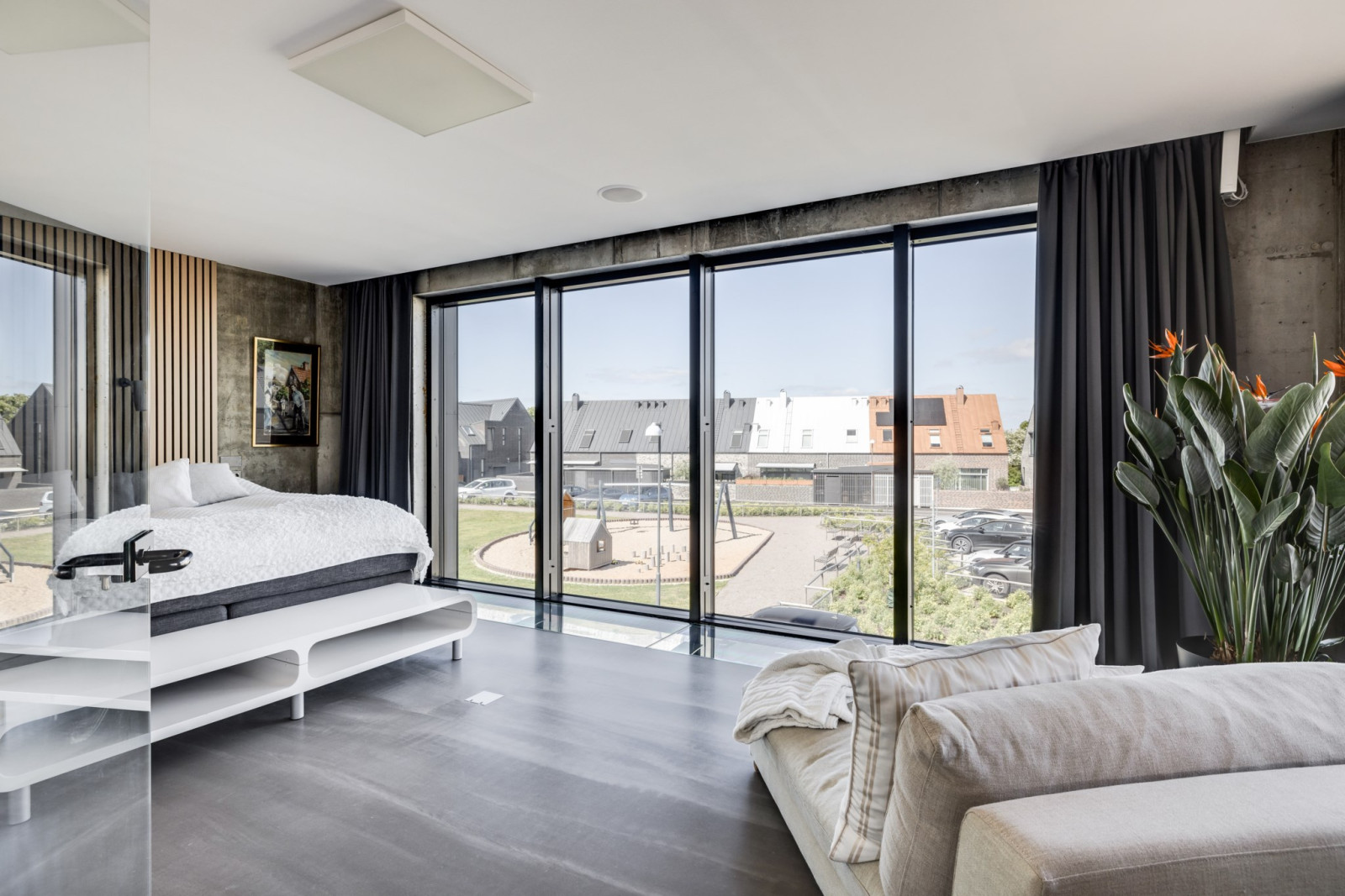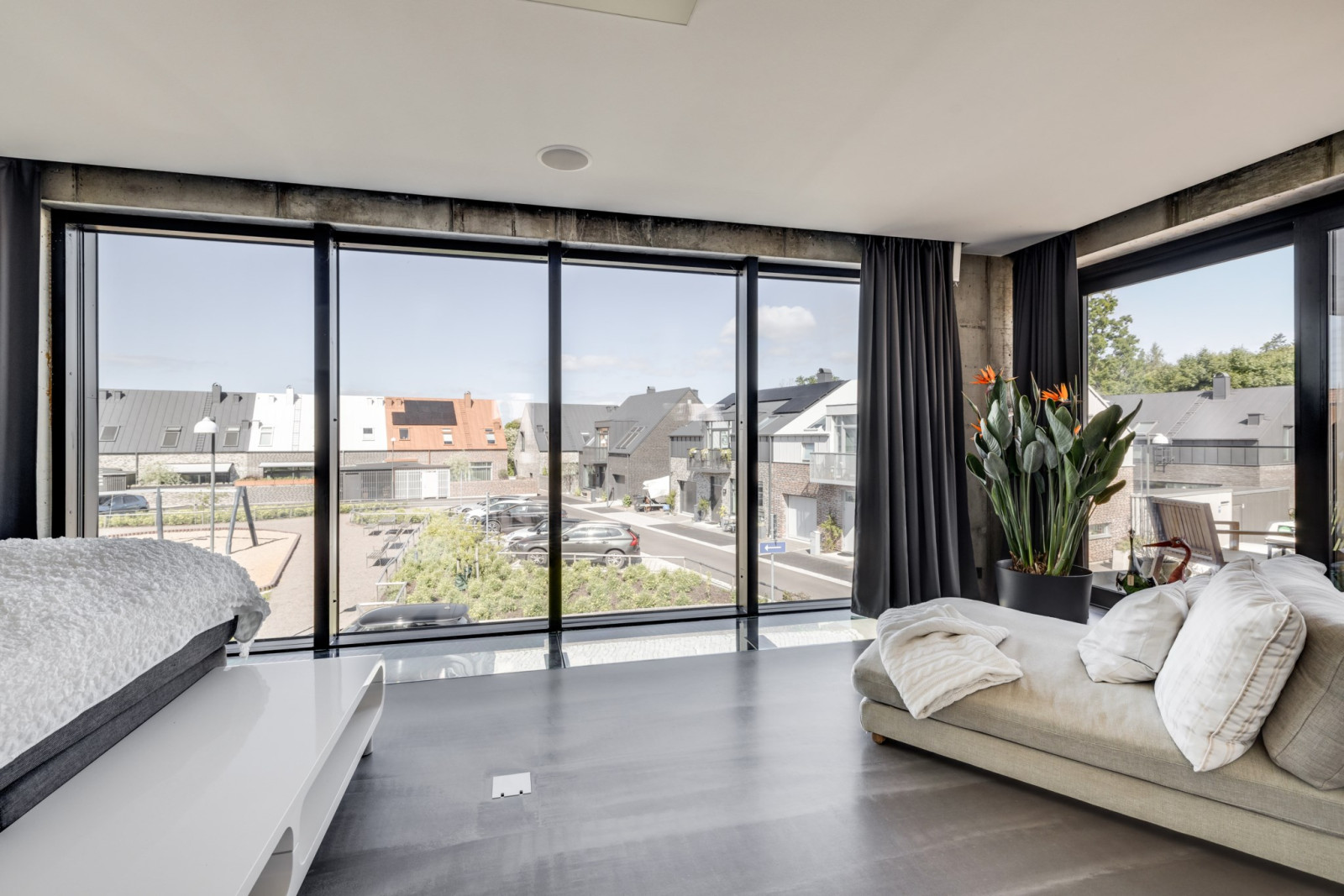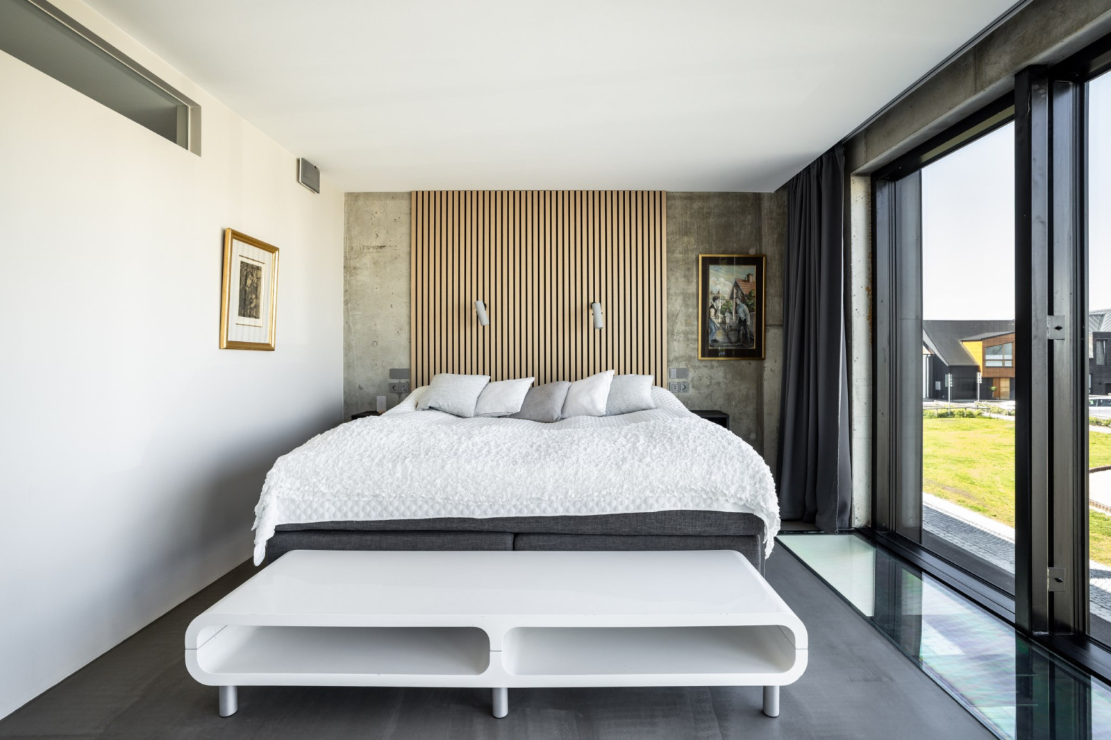 Det övre planet kröns av ett extraordinärt master bedroom där arkitektur, komfort och elegans smälter samman. Rummet är generöst tilltaget och ramas in av golv-till-tak-fönster som bjuder in ljuset och skapar en öppen, luftig atmosfär. En unik detalj är glaspartierna i golvet som erbjuder visuell kontakt ner till kök och vardagsrum – en designlösning som förstärker husets moderna och öppna karaktär.