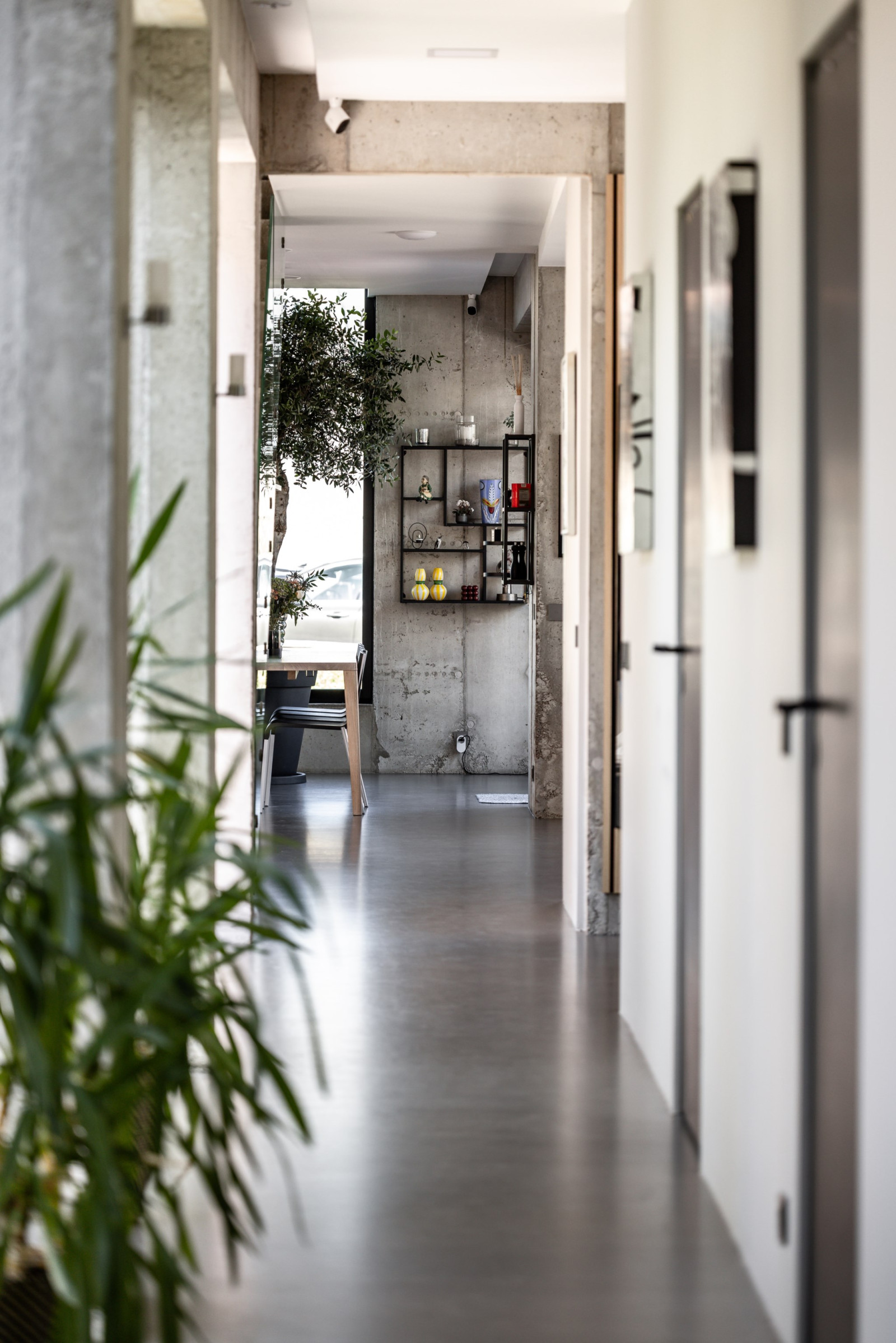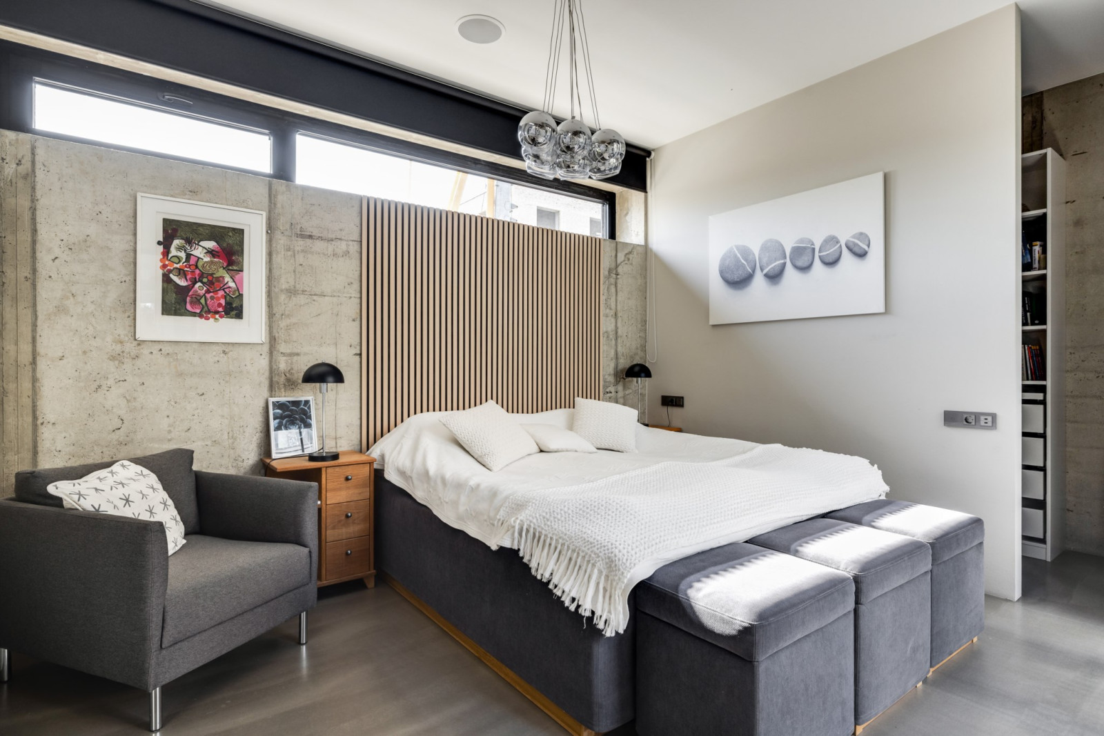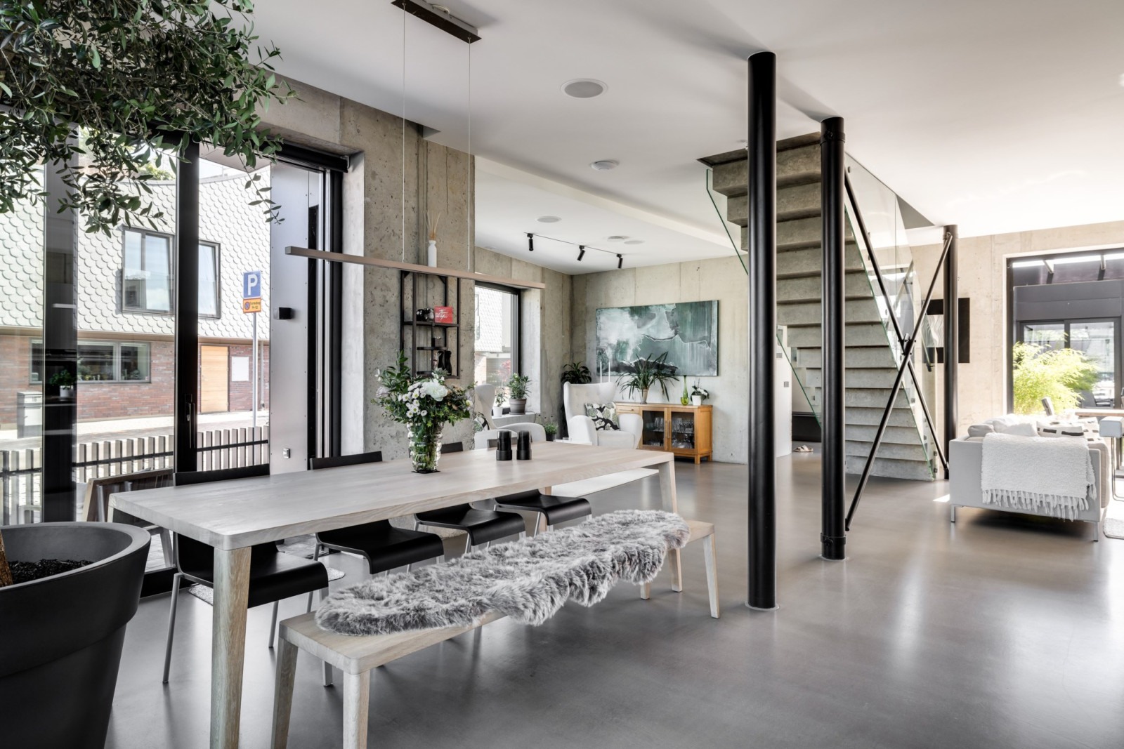 Välkommen in i ett modernt mästerverk i betong där formspråk och funktion går hand i hand. Redan i entrén möts du av en generös hall med gott om plats för förvaring, perfekt för både vardag och gäster. De synliga betongväggarna skapar en stilren och industriell känsla som genomsyrar hela huset.
