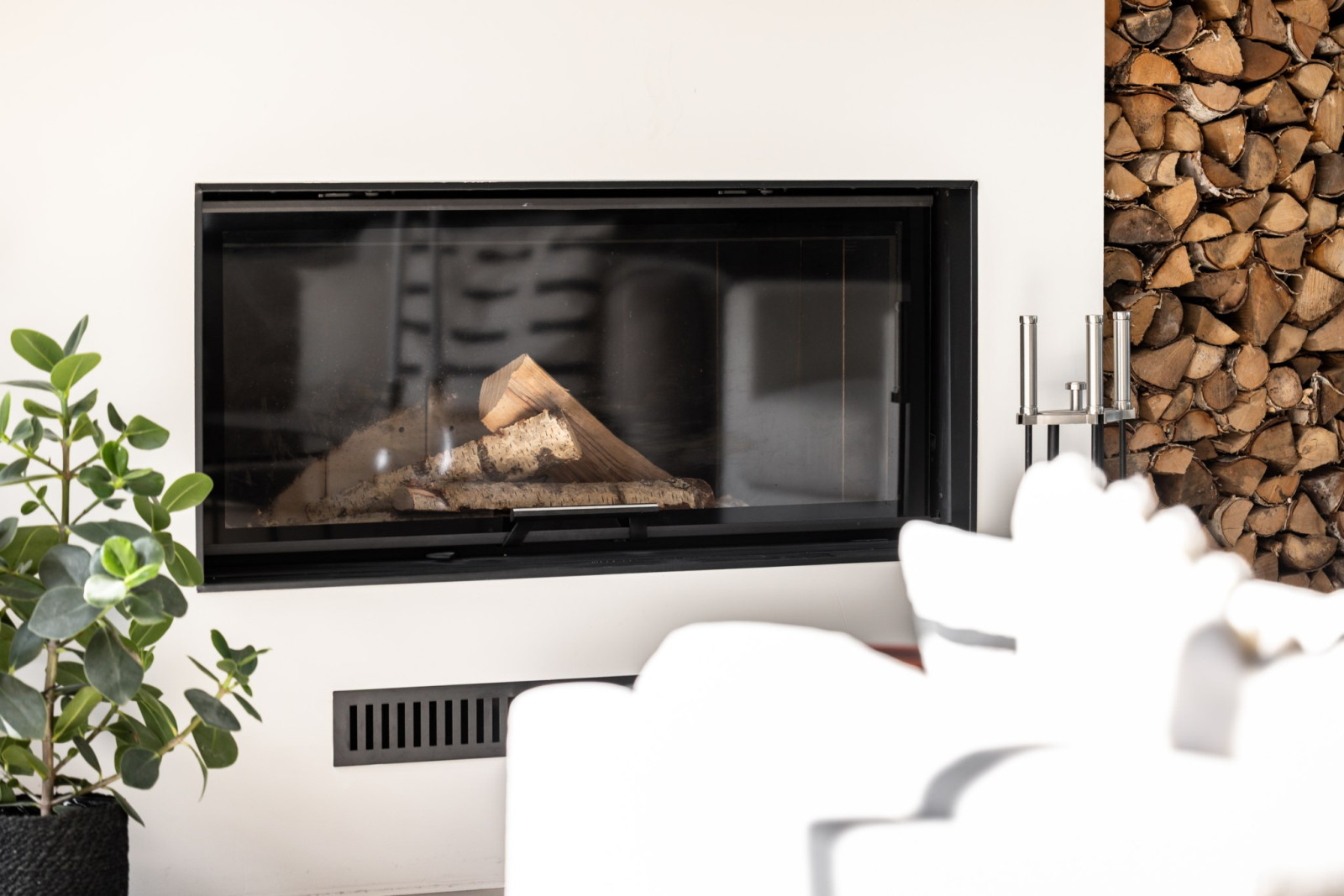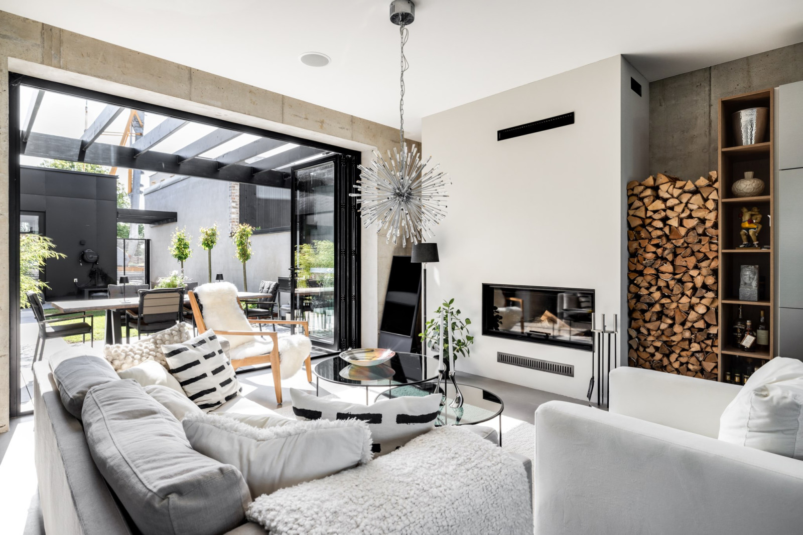 Vardagsrummet är luftigt och elegant, med en stämningsfull eldstad som skapar en varm och inbjudande atmosfär. Från rummet leder en altandörr direkt ut till en solig uteplats – perfekt för sommarens måltider och avkoppling utomhus.