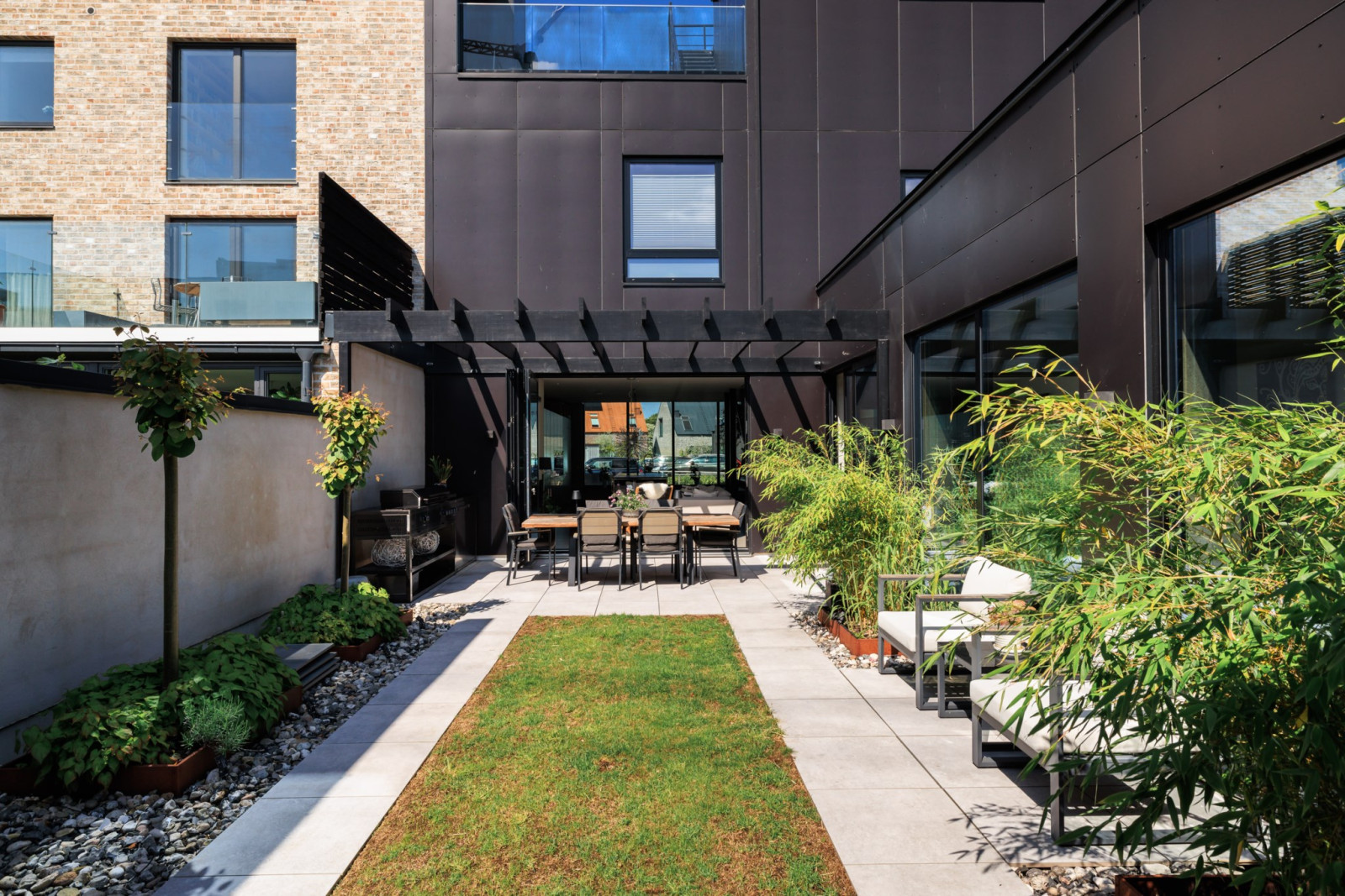 Till höger om entrén öppnar bostaden upp sig i en ljus och öppen social yta där kök och vardagsrum förenas i en modern och stilren helhet. Det stora fönsterpartiet som vetter mot en grönskande allmänning är självrengörande. Mot den privata trädgården finns det ett skjutparti som är helt öppningsbart, vilket ger rummet ett fantastiskt ljusflöde och en stark känsla av rymd.