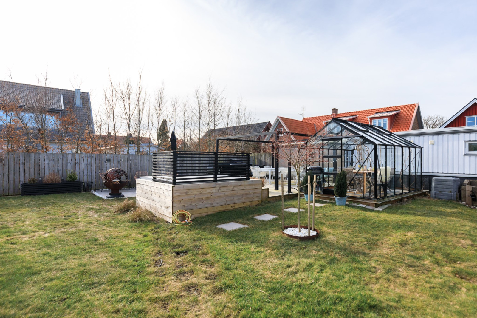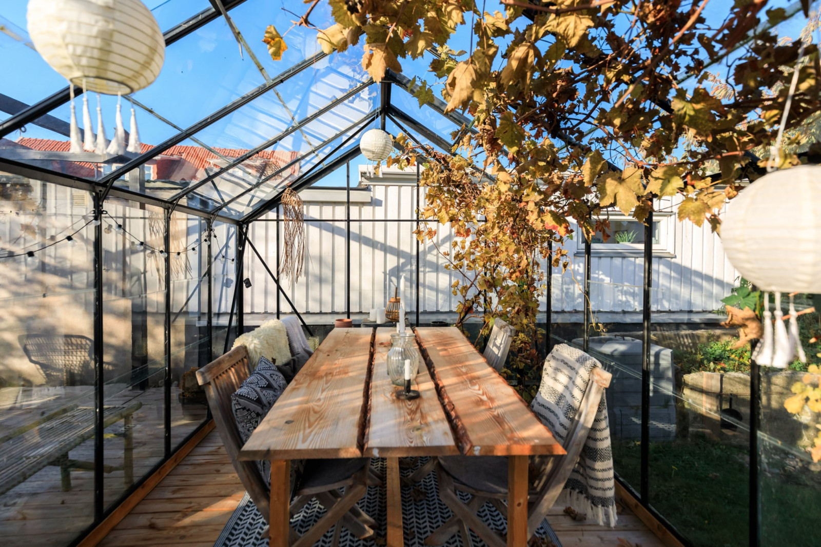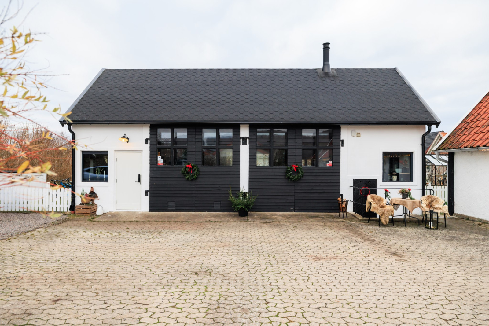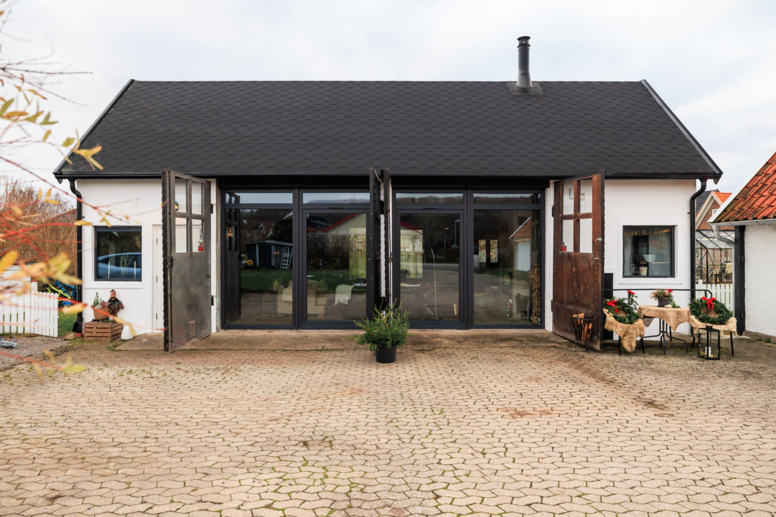 • Med 2 stora skjutdörrspartier mot trädgårdens framsida (Bygatan).