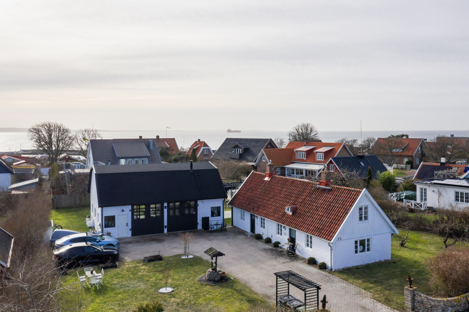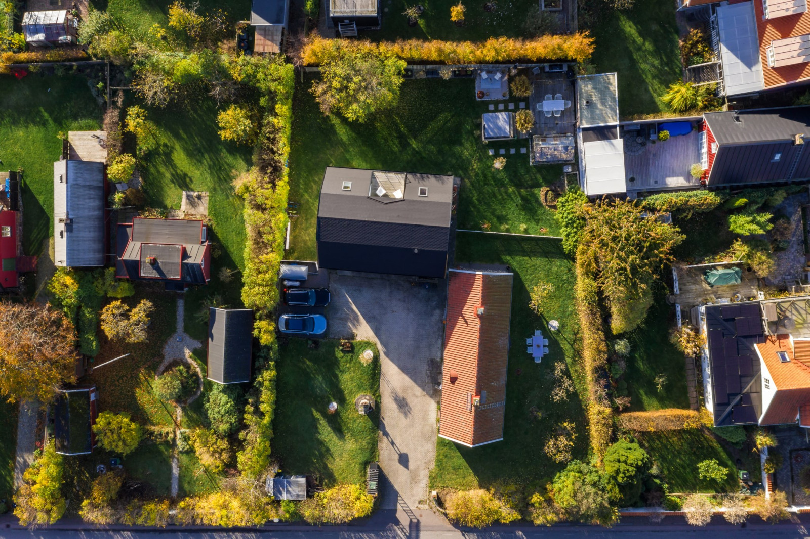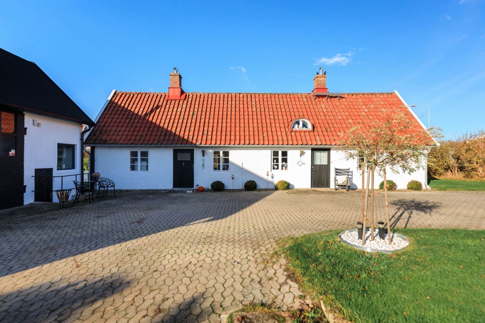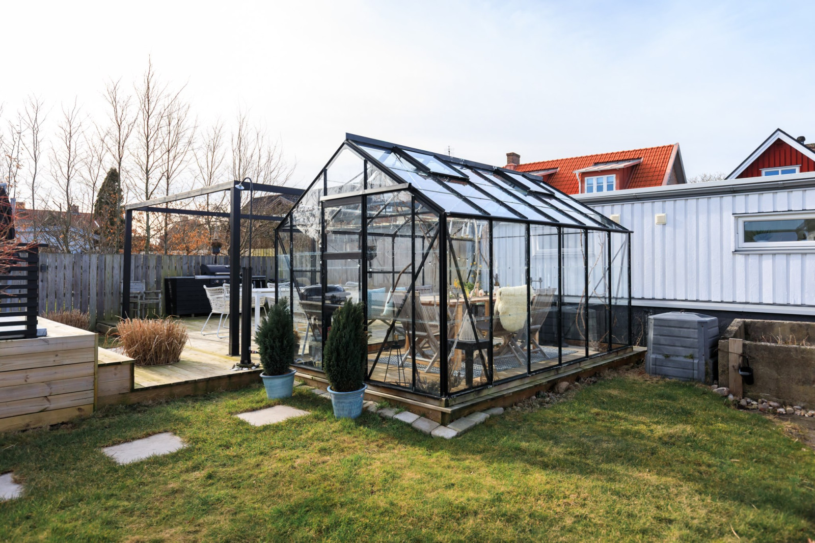 • Med 2 stora skjutdörrspartier mot trädgårdens framsida (Bygatan).
