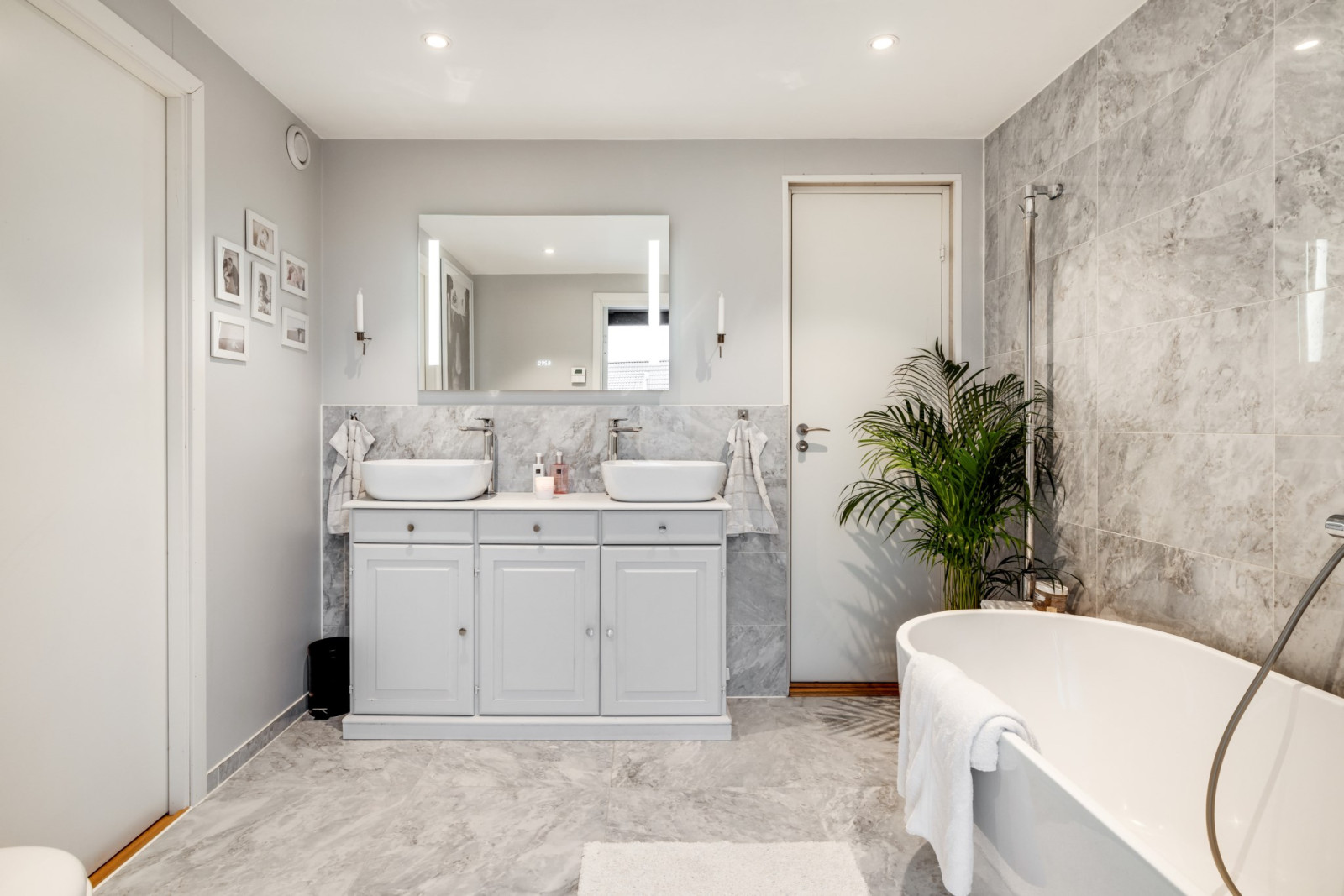 • Två tvättställ, badkar, toalettstol och större spegel