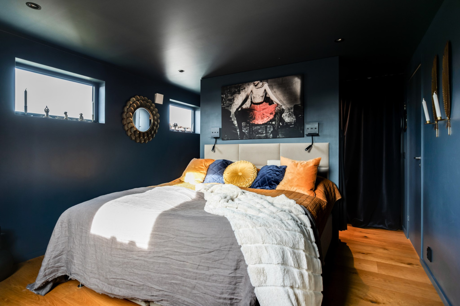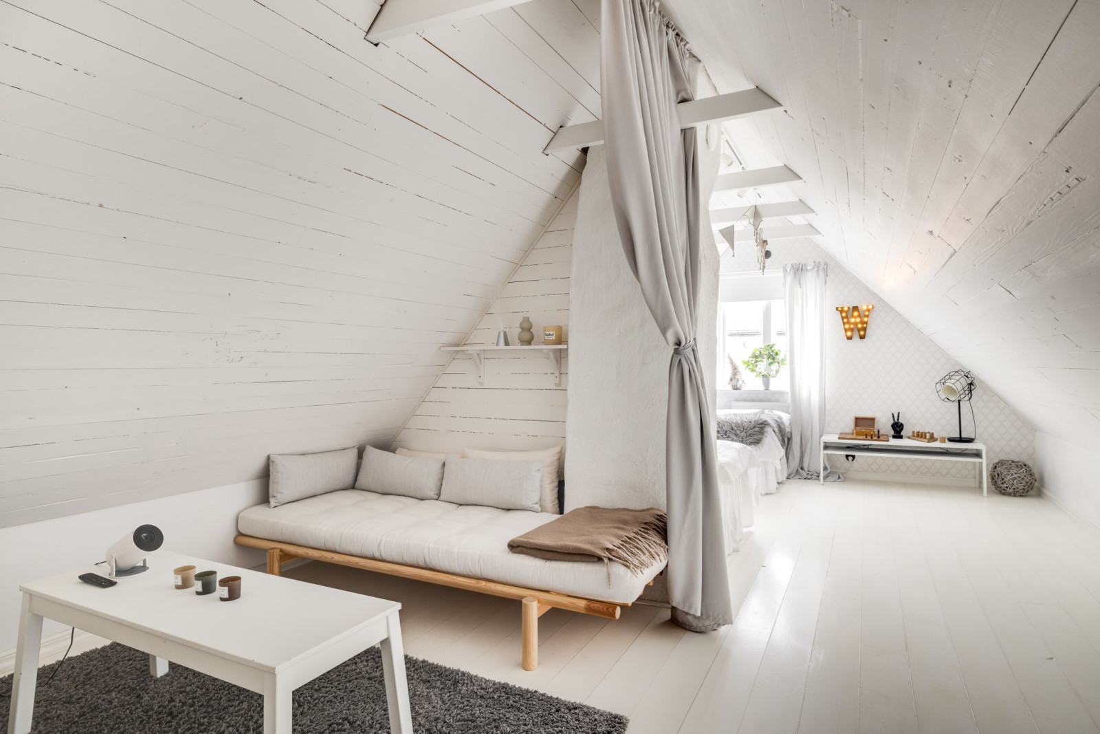 • Rumsavskiljare bakom säng i trä från golv till tak