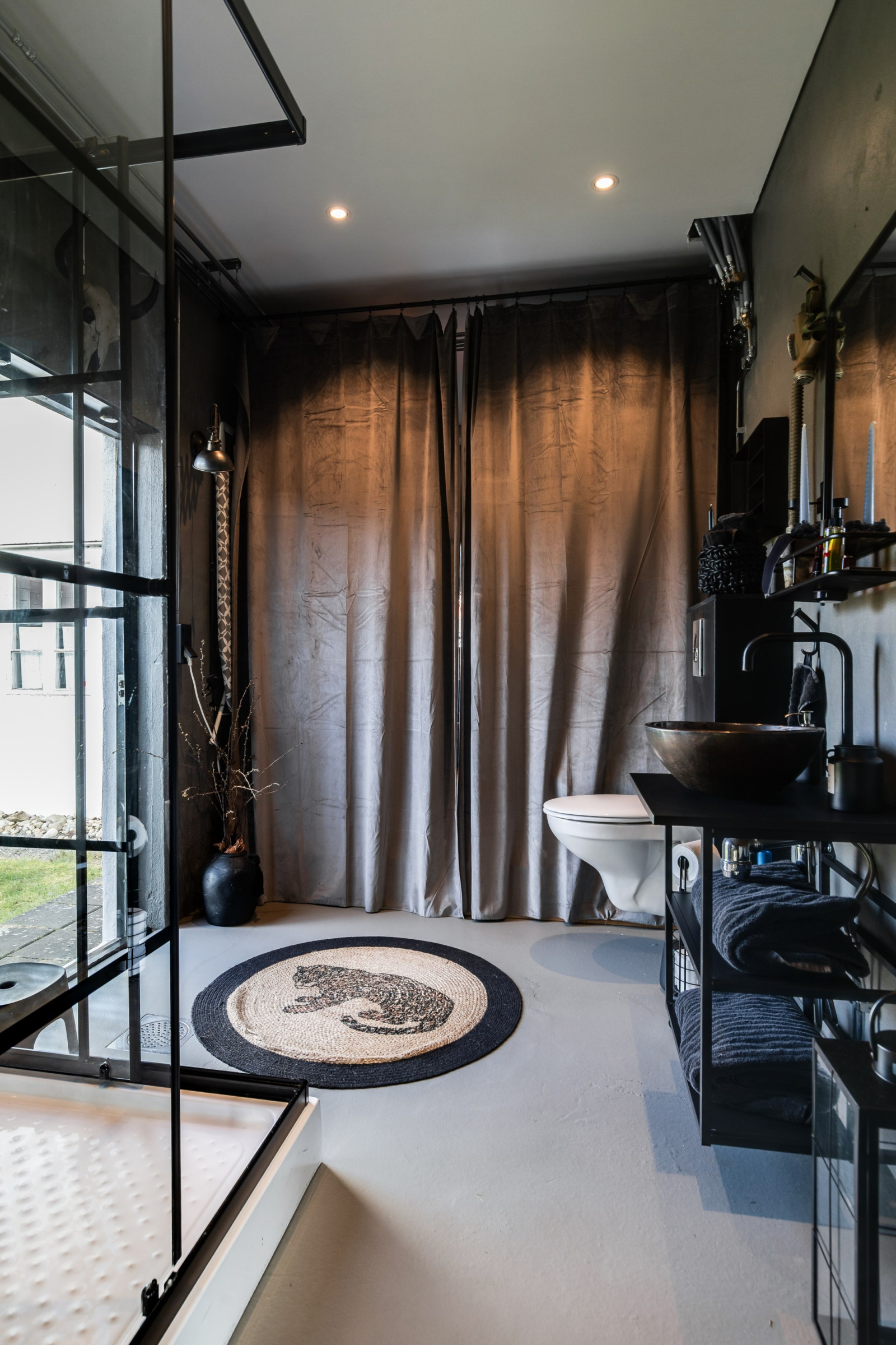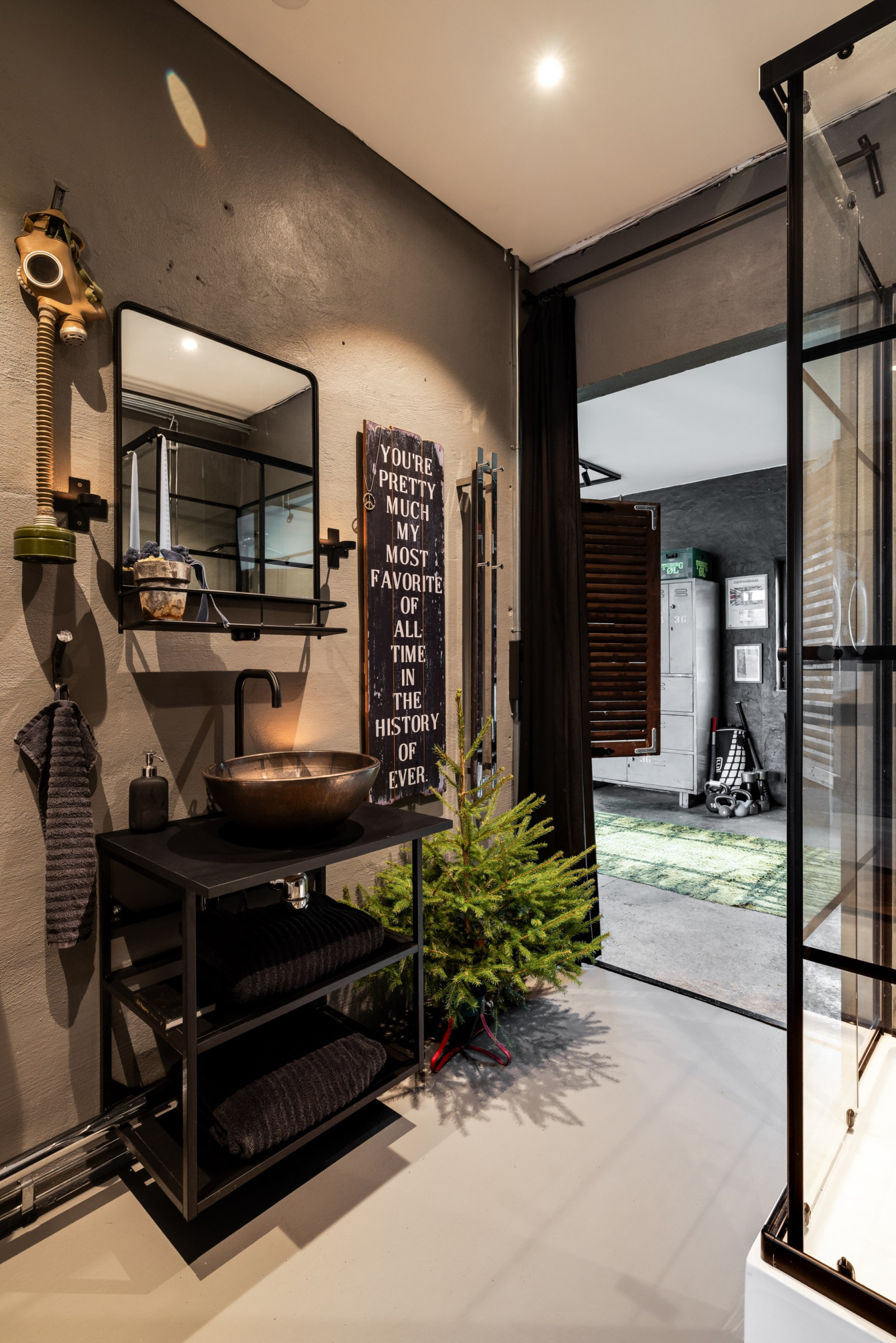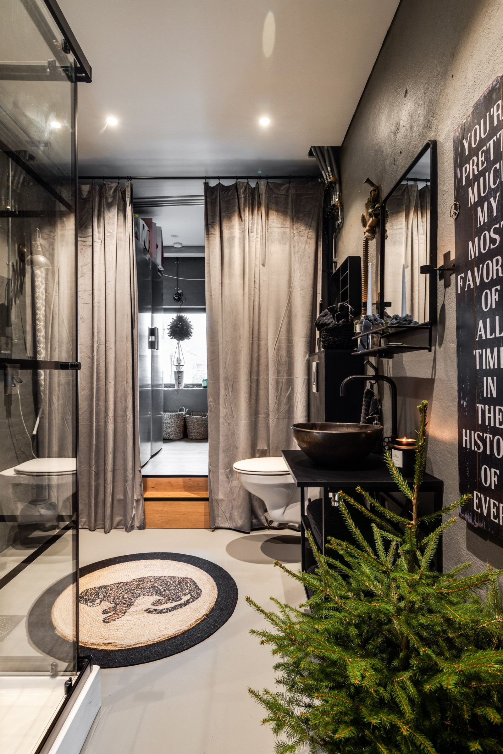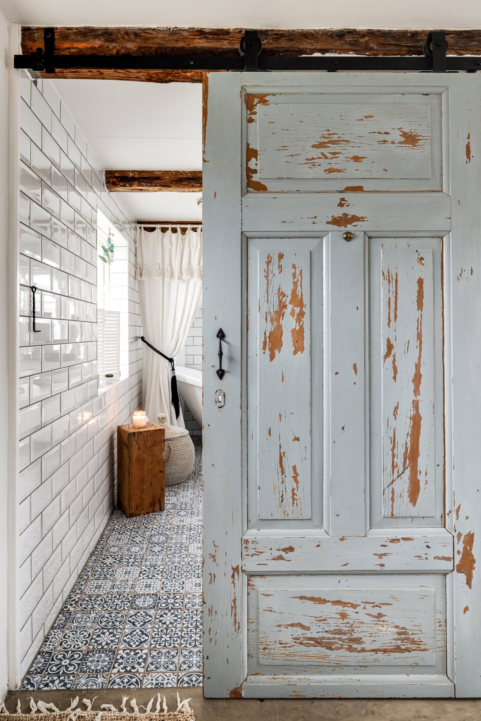 • Skjutdörr in till badrummet, gammal spegeldörr med hake som lås, monterad på vacker skena (2016)