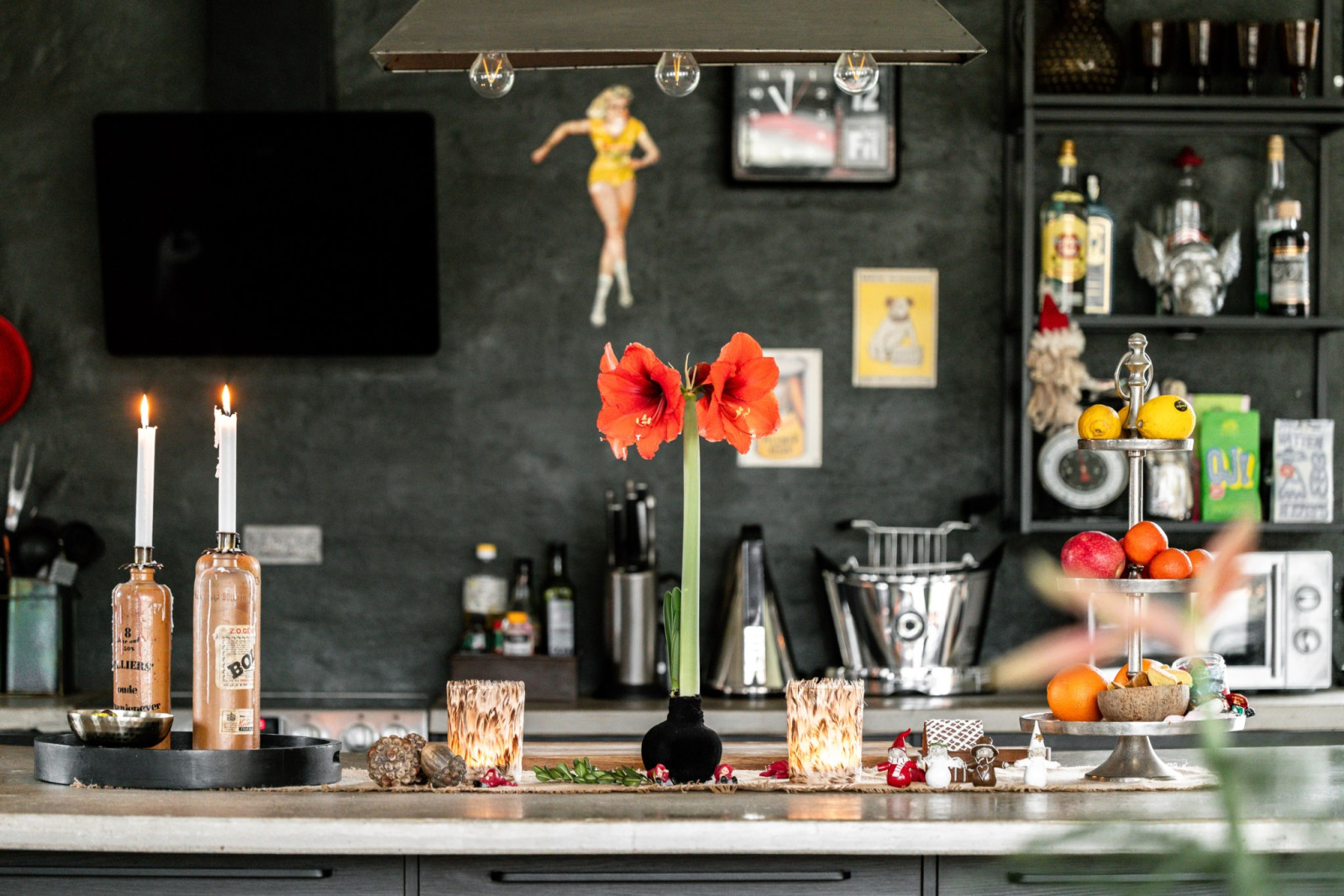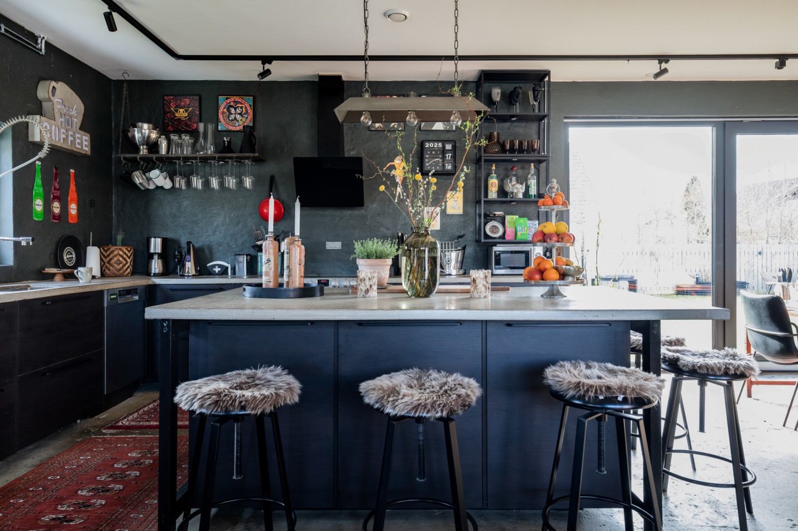 • Bänkskiva med överhäng på köksö; spishäll med fläkt över