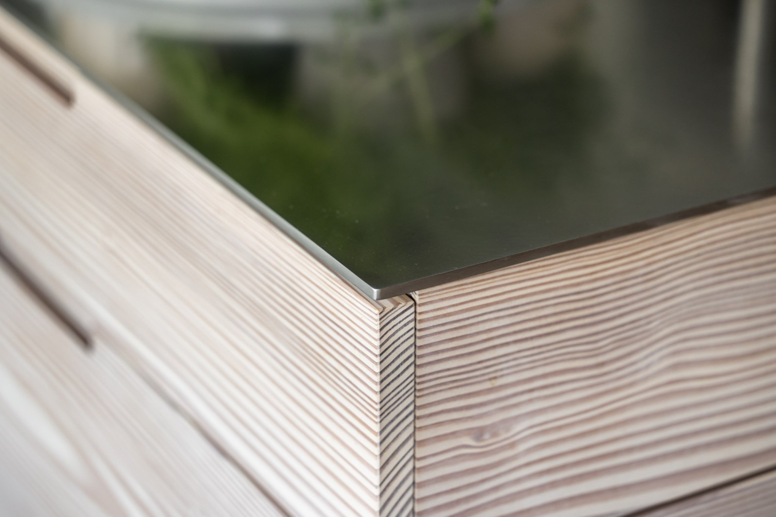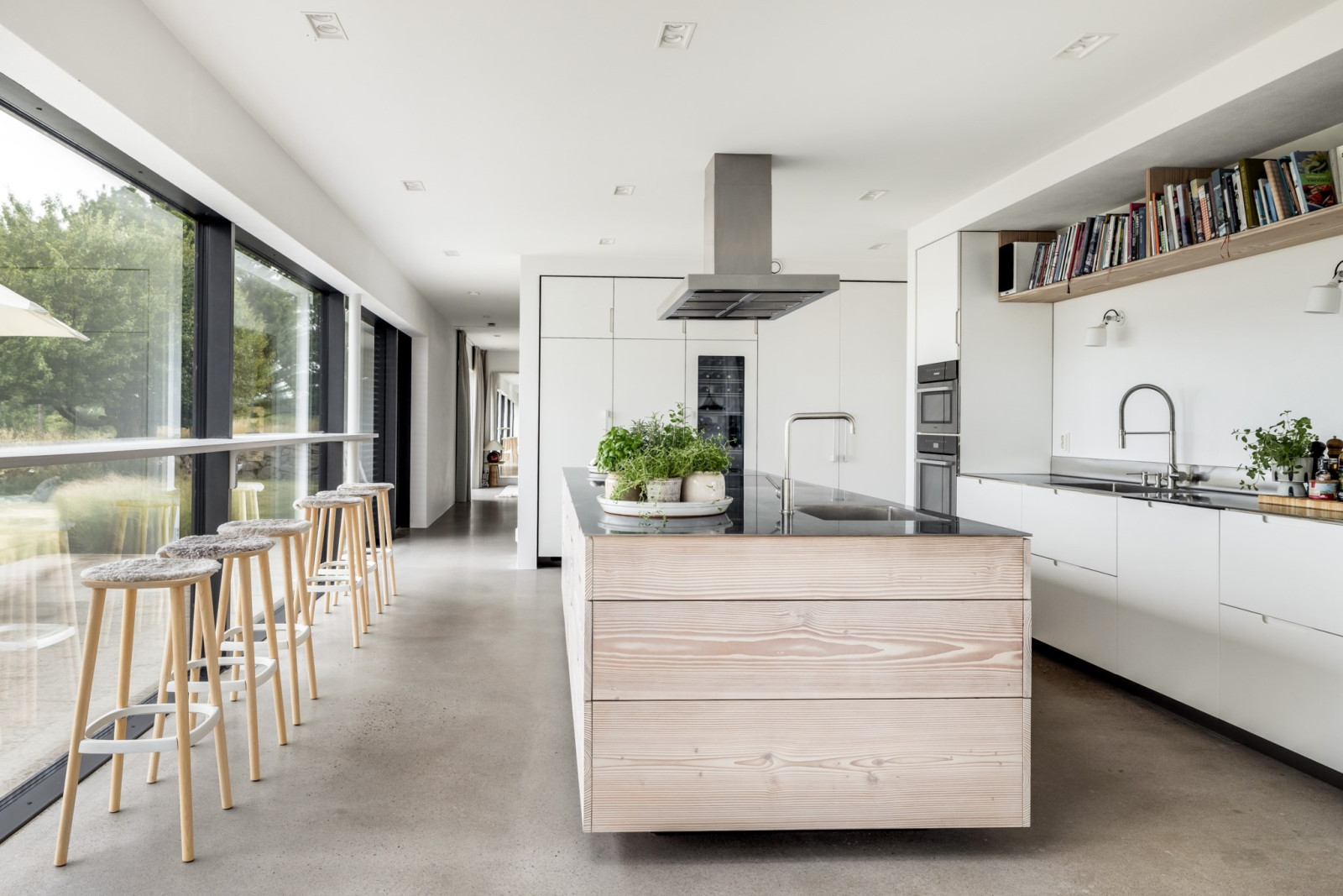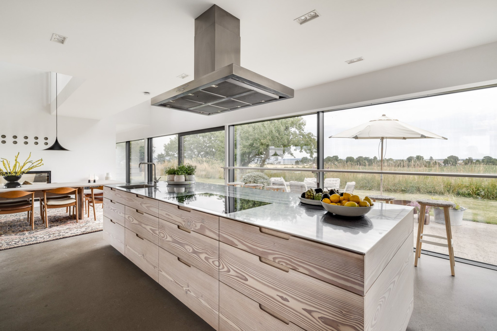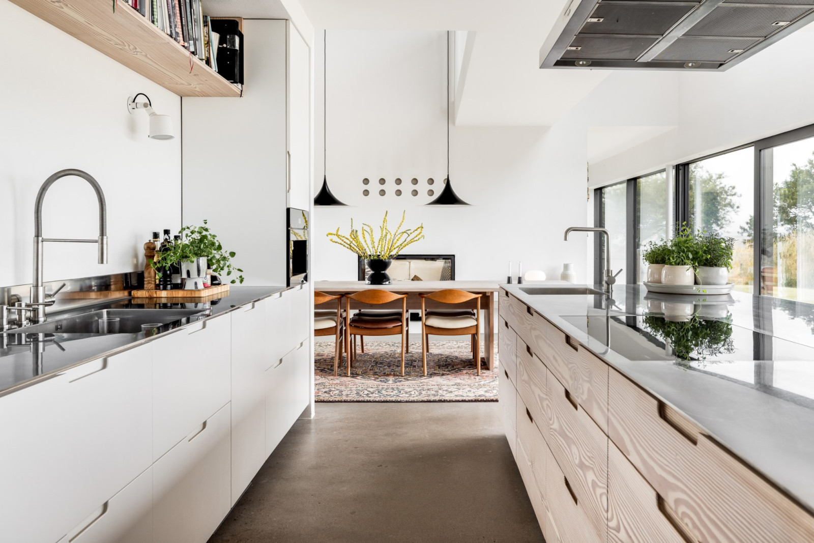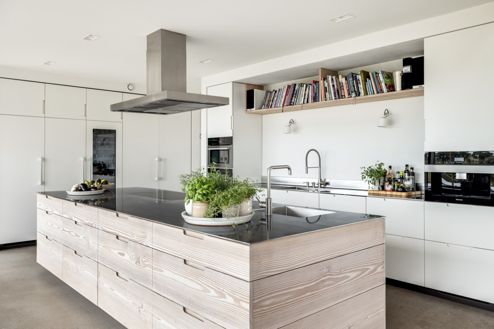 Platsbyggt kök med stommar av vitoljad björkplywood och generösa arbetsytor av 6 mm. rostfritt stål. Bred induktionshäll, spisfläkt, inbyggd ugn, micro och kaffemaskin, integrerad diskmaskin, kyl, frys och vinkyl. Alla vitvaror från Miele. Trivsamt öppet mot matsalen och skjutparti mot uteplatsen. Cirka 28 kvm.