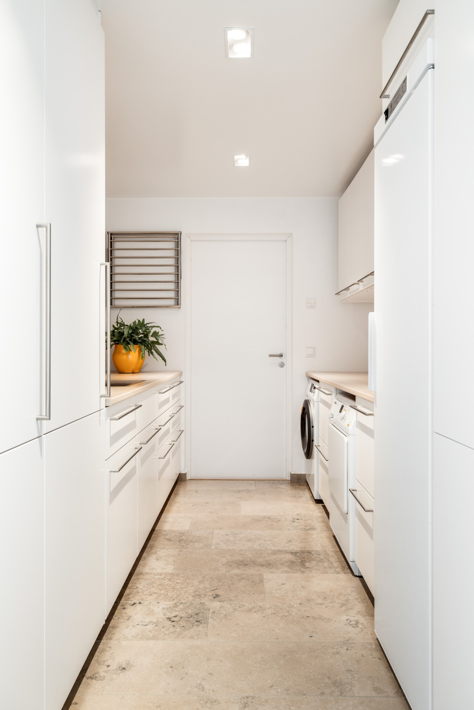 Praktisk tvättstuga med bra arbetsyta och tvättmaskin och torktumlare från Miele. Generöst med garderobsutrymme.