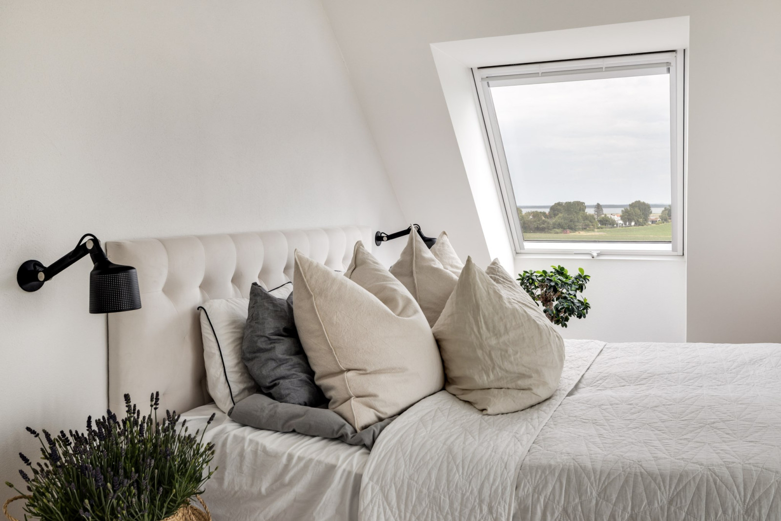 Master bedroom om cirka 26 kvm. Havsutsikt och eget, helkaklat badrum i tidlös design. Platsbyggd inredning av samma höga kvalité som köket. Duschplats, wc och tvättställ.