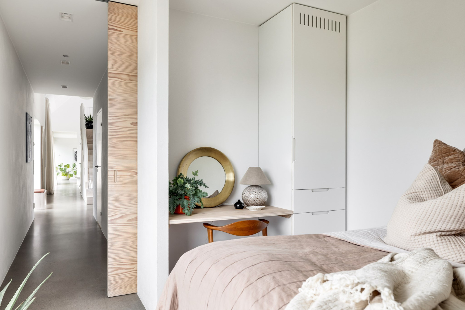 Trevligt sovrum med specialbyggd skjutdörr från golv till tak i douglasgran. Cirka 13 kvm. och utgång till trädgården.