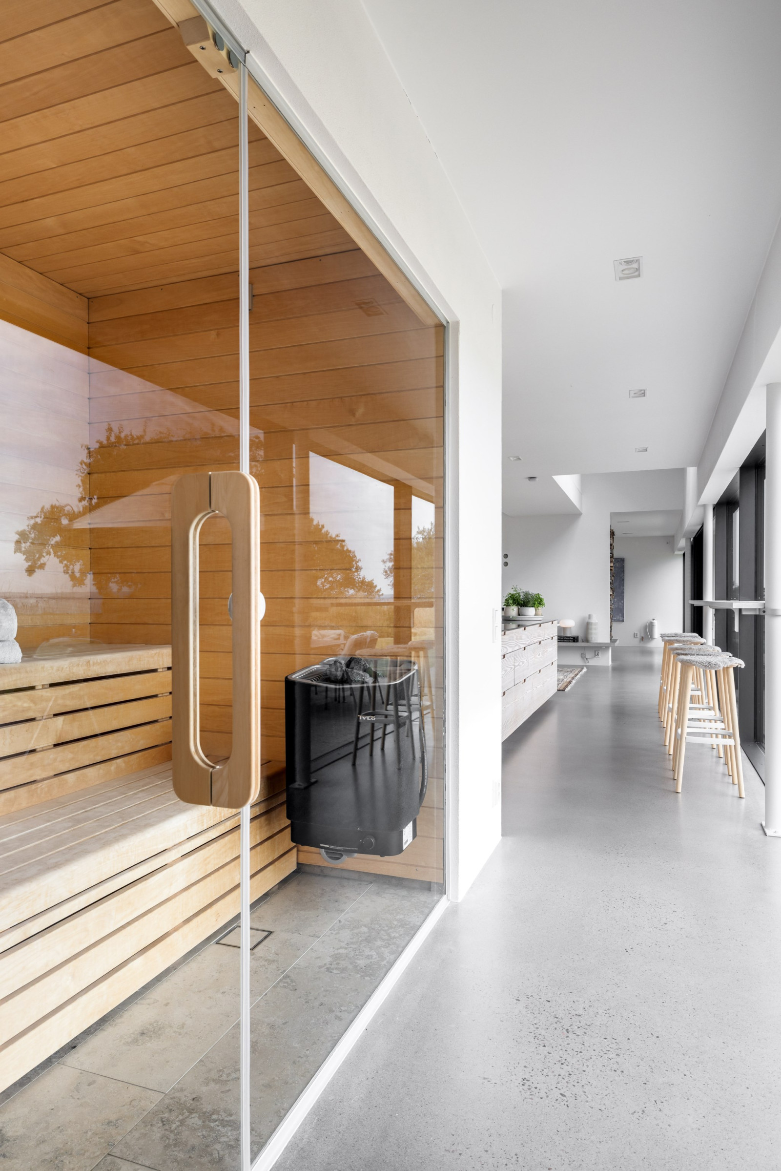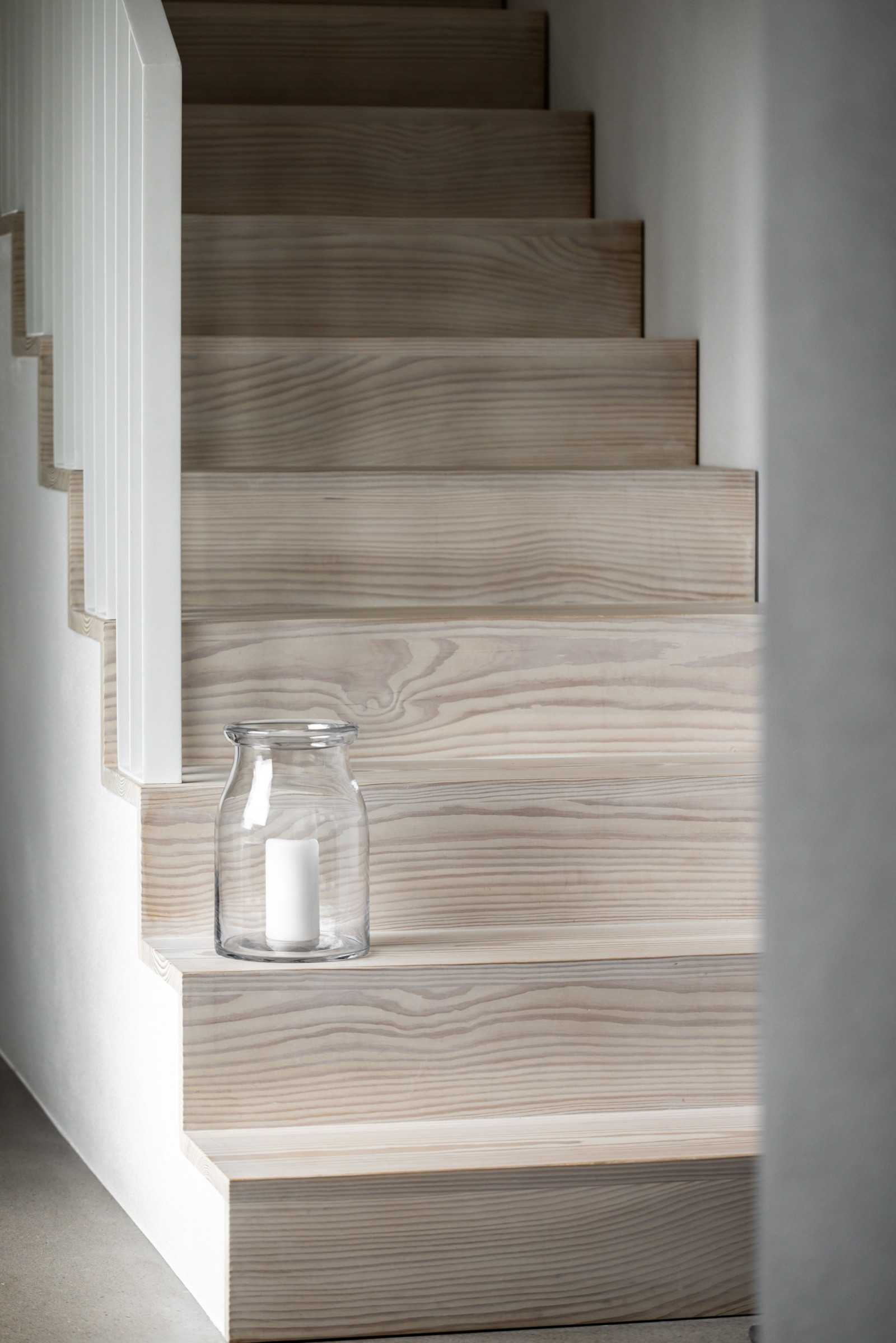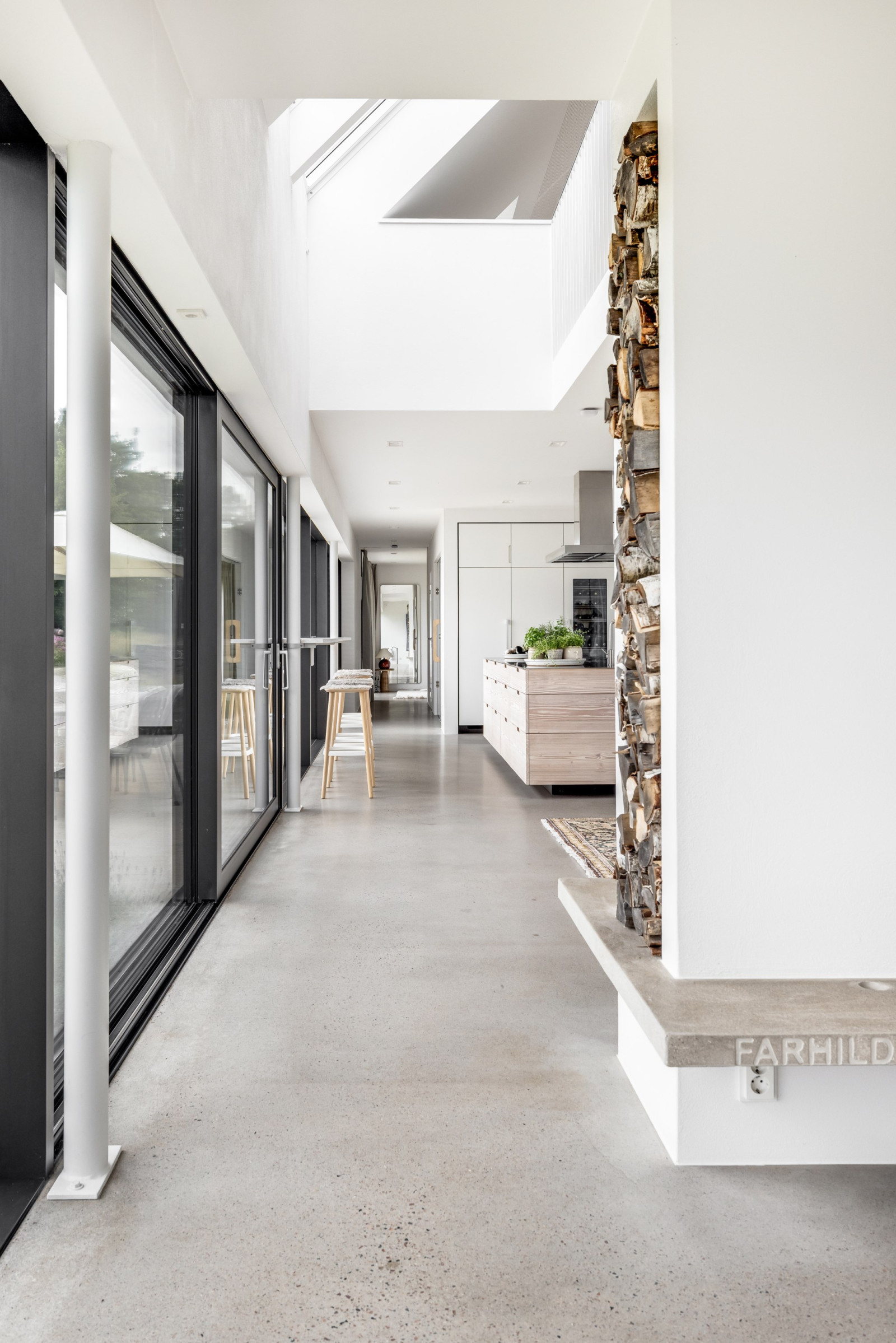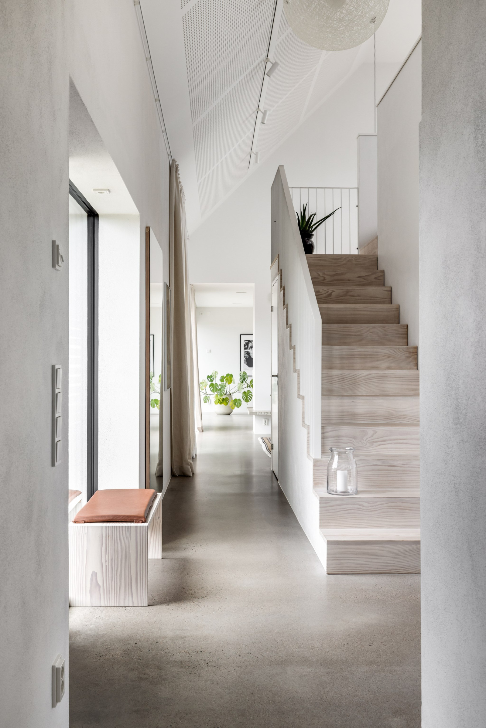 Interiören präglas av kompromisslös kvalitet. Ett platsbyggt kök med arbetsytor i rostfritt stål och utrustning från Miele skapar en stilren och professionell känsla. Specialdesignade badrumsinredningar och snickerier, tillsammans med slipade betonggolv på entréplan och plankgolv i 300 mm douglasgran, vitlutade och vitsåpade enligt klassisk metod, vittnar om omsorg för detaljer och material.