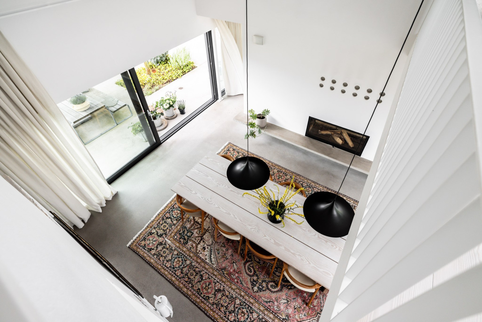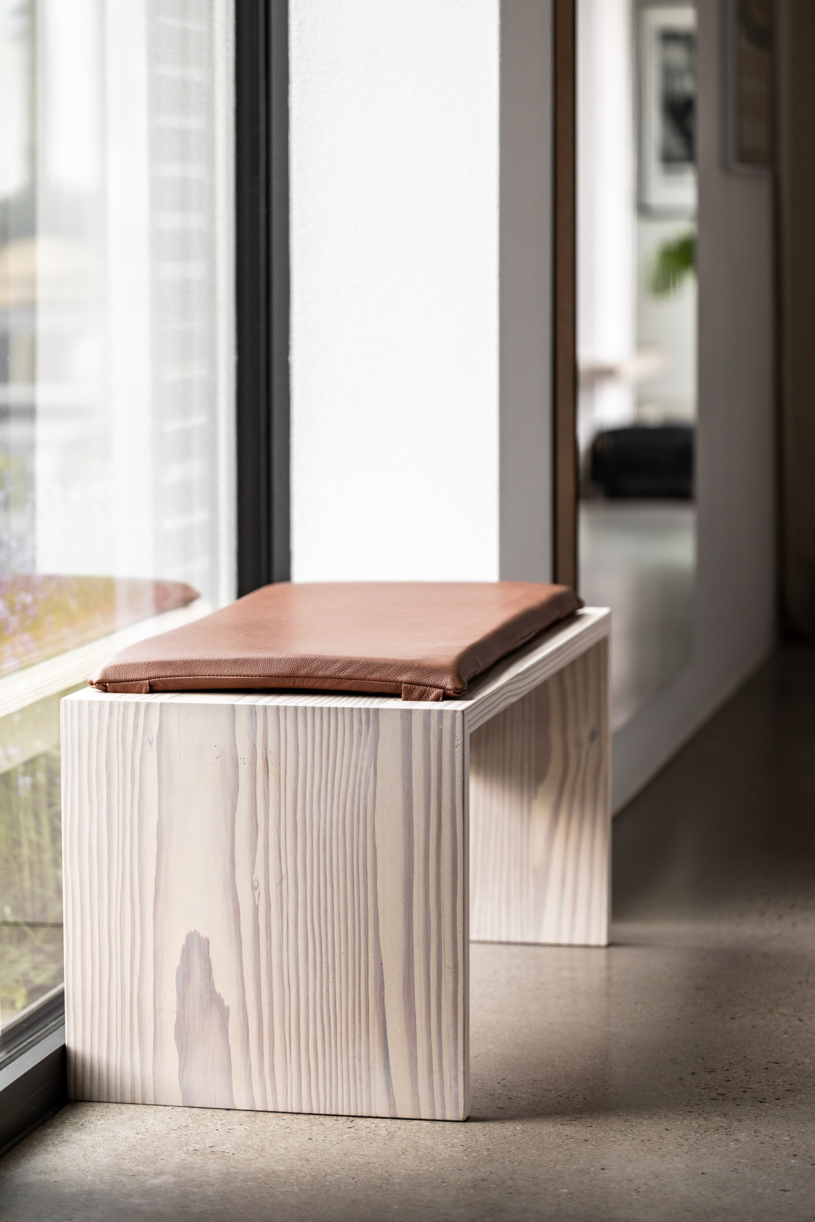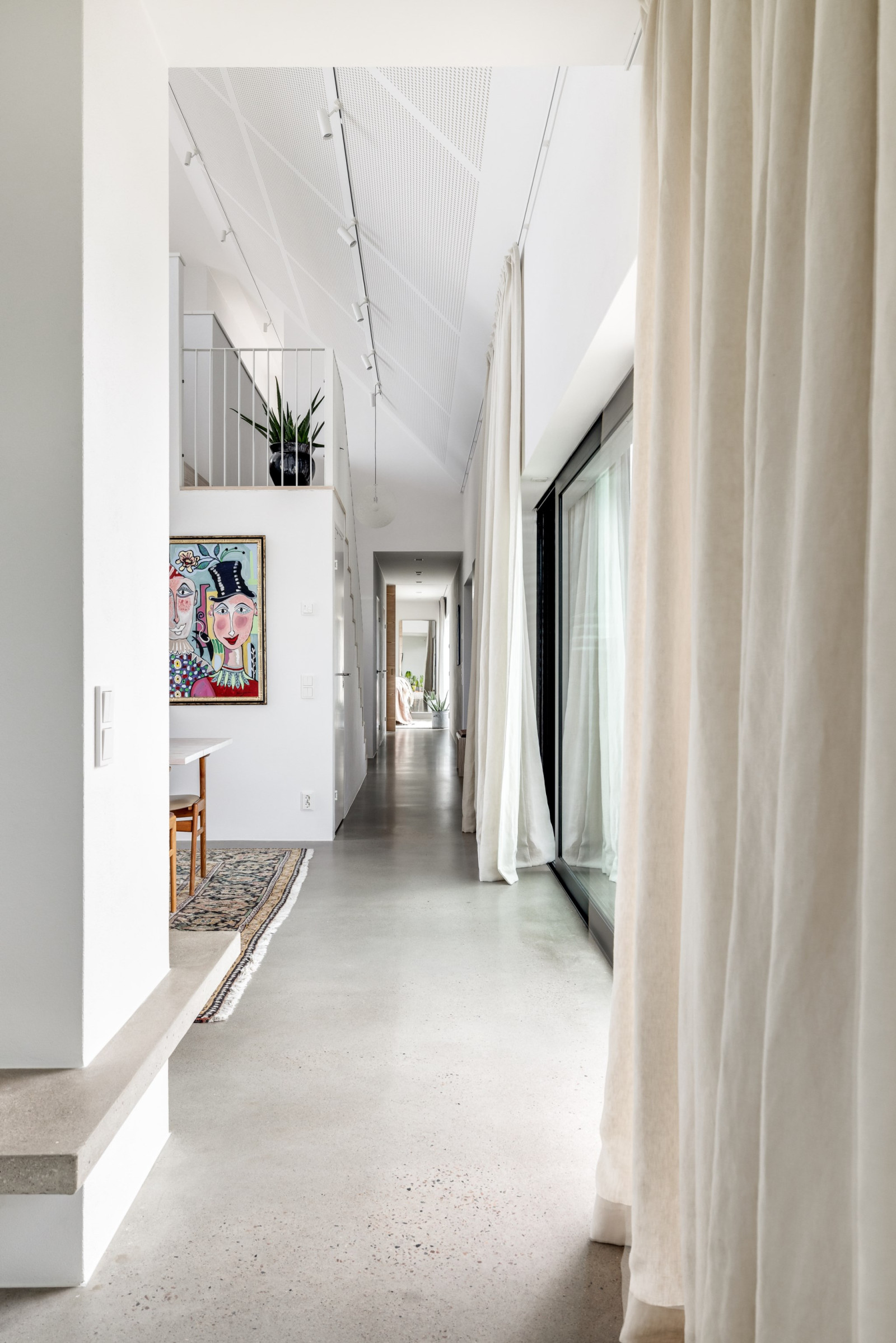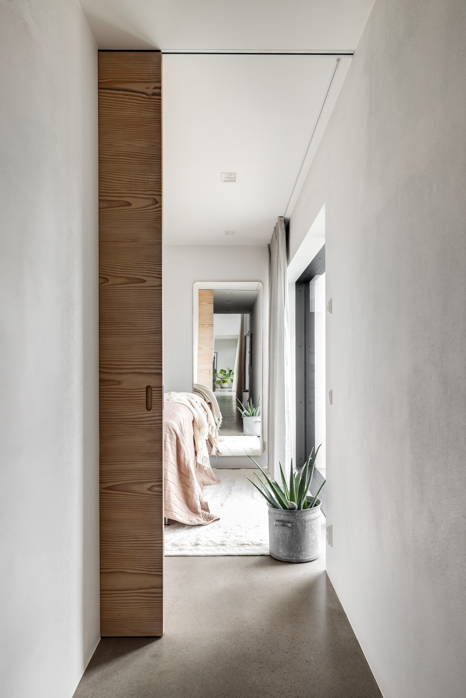 Interiören präglas av kompromisslös kvalitet. Ett platsbyggt kök med arbetsytor i rostfritt stål och utrustning från Miele skapar en stilren och professionell känsla. Specialdesignade badrumsinredningar och snickerier, tillsammans med slipade betonggolv på entréplan och plankgolv i 300 mm douglasgran, vitlutade och vitsåpade enligt klassisk metod, vittnar om omsorg för detaljer och material.