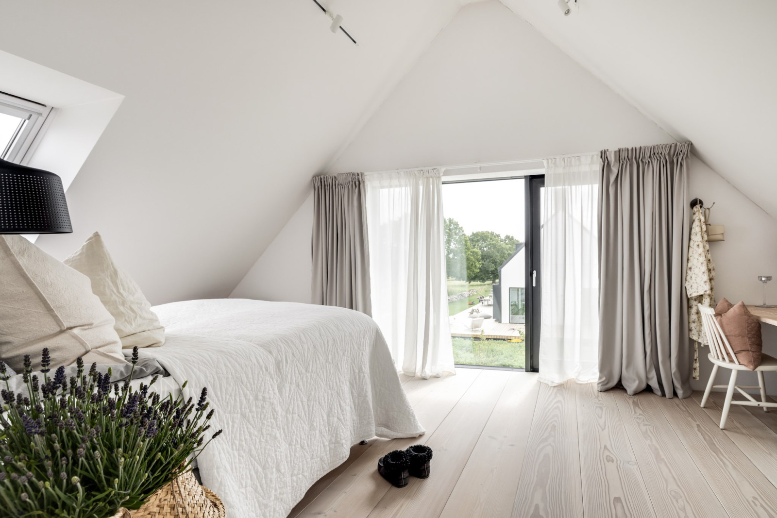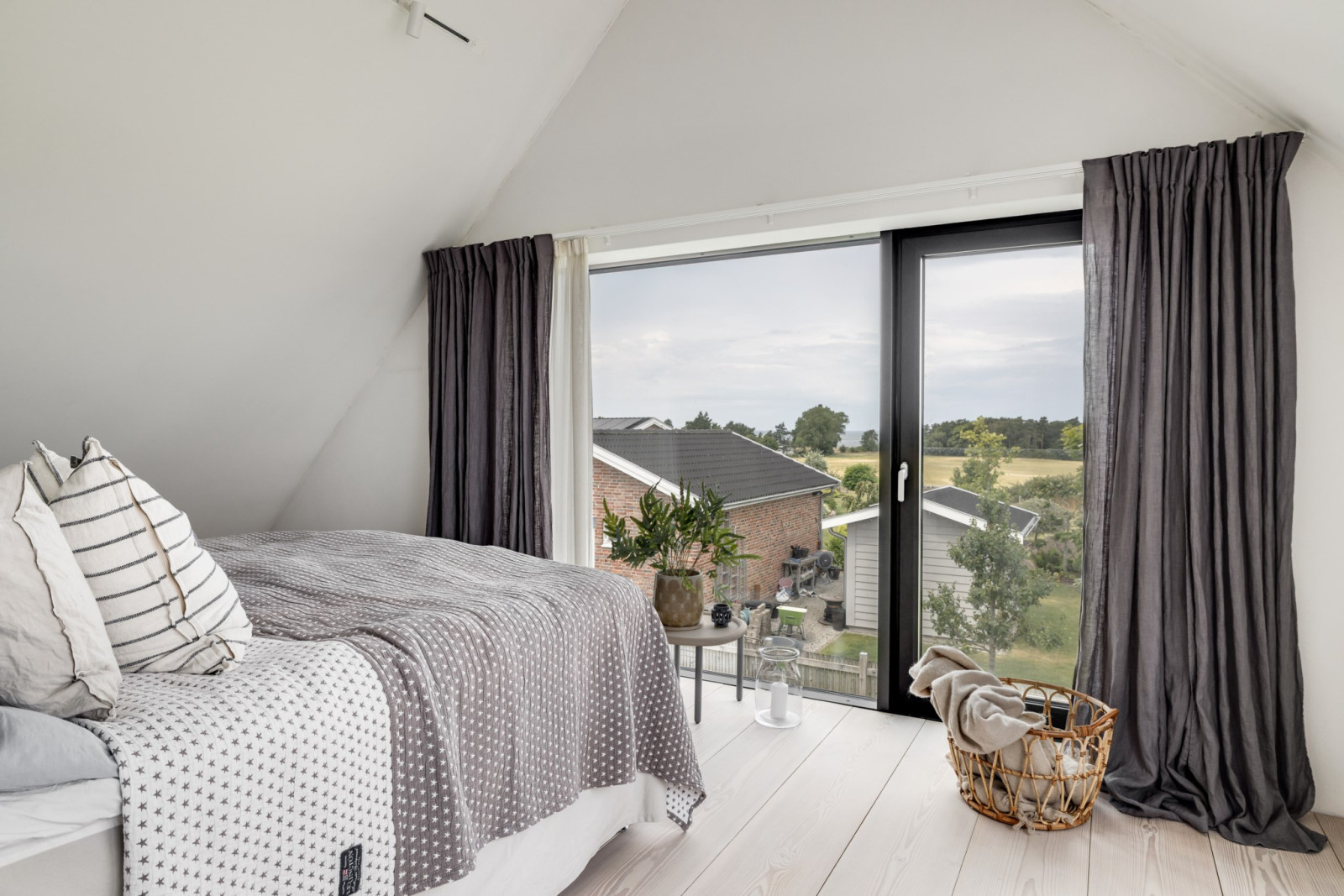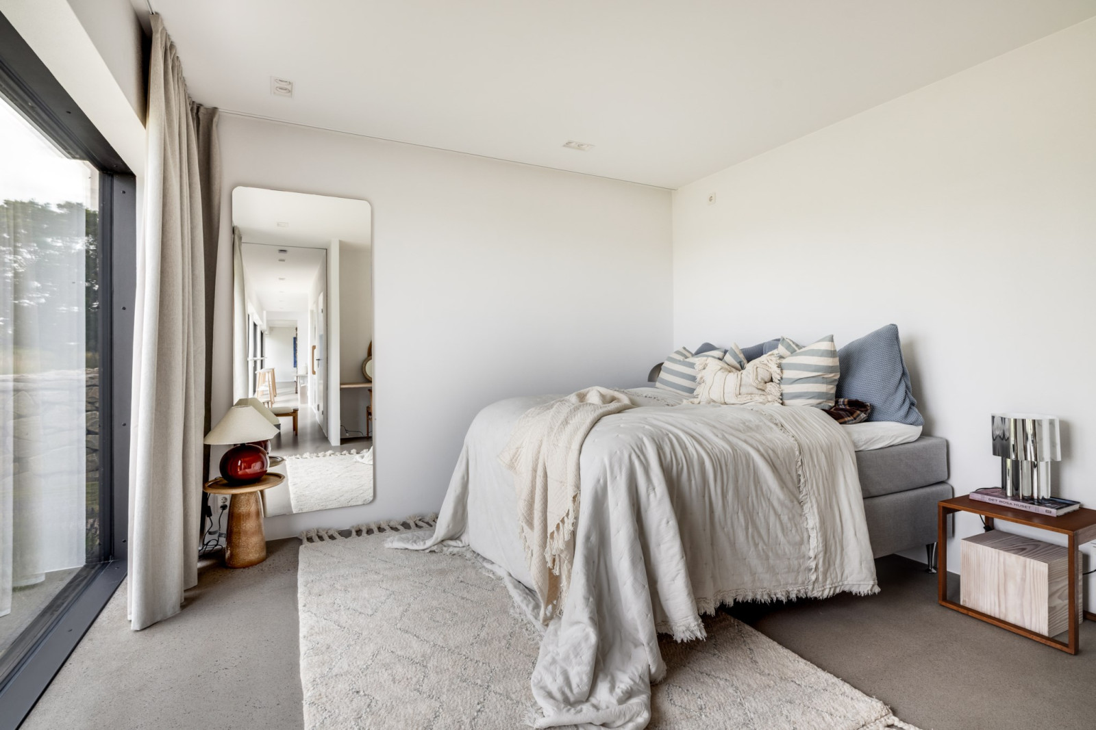 Trevligt sovrum med specialbyggd skjutdörr från golv till tak i douglasgran. Cirka 16 kvm, havsutsikt och utgång till uteplatsen.