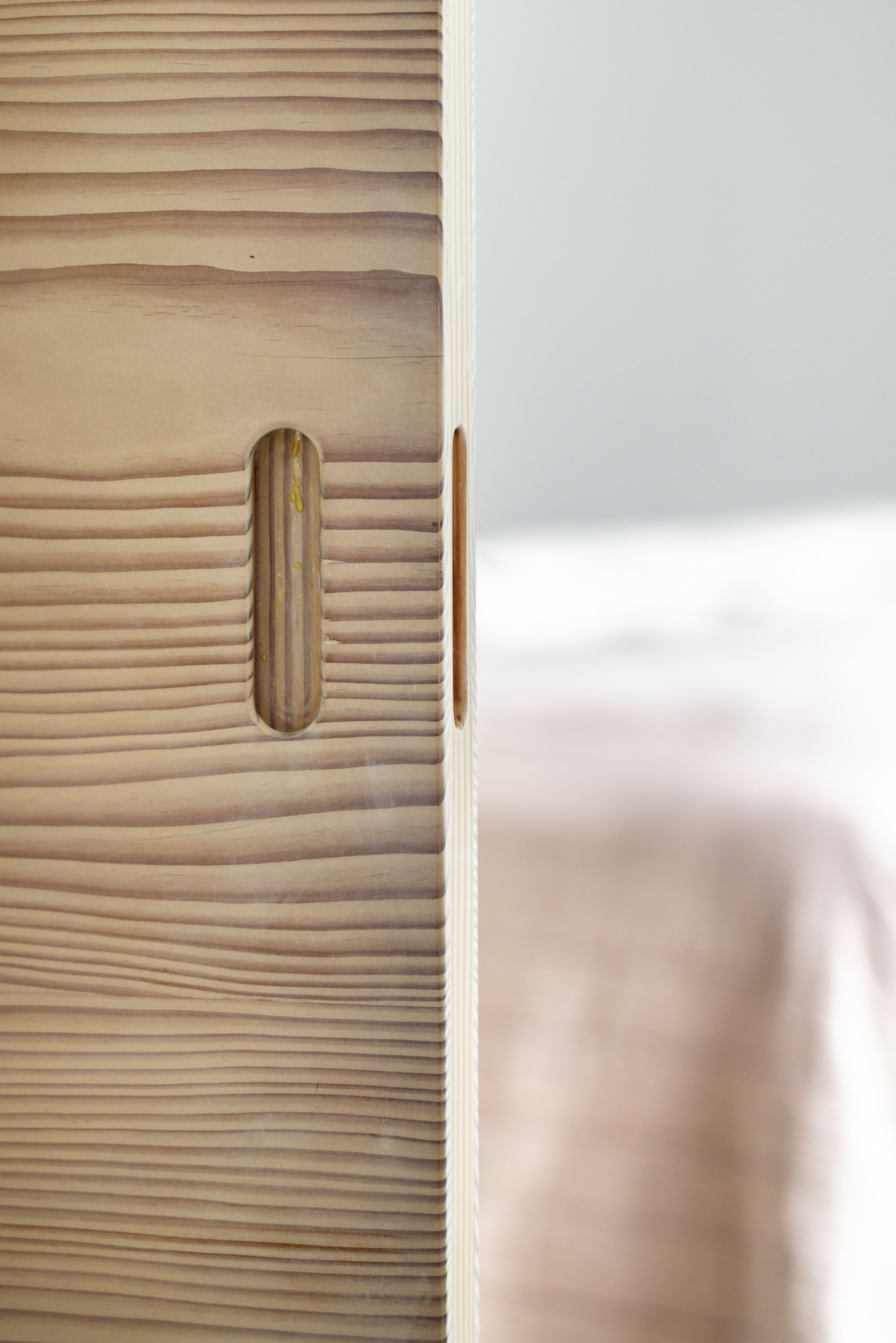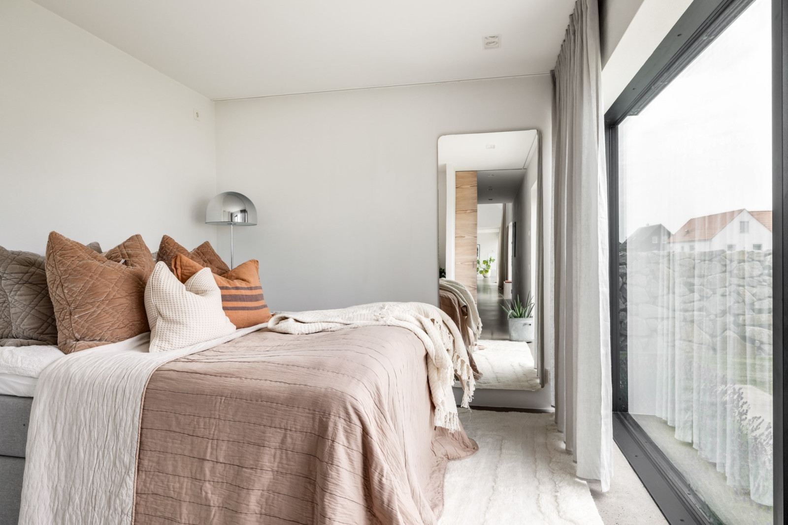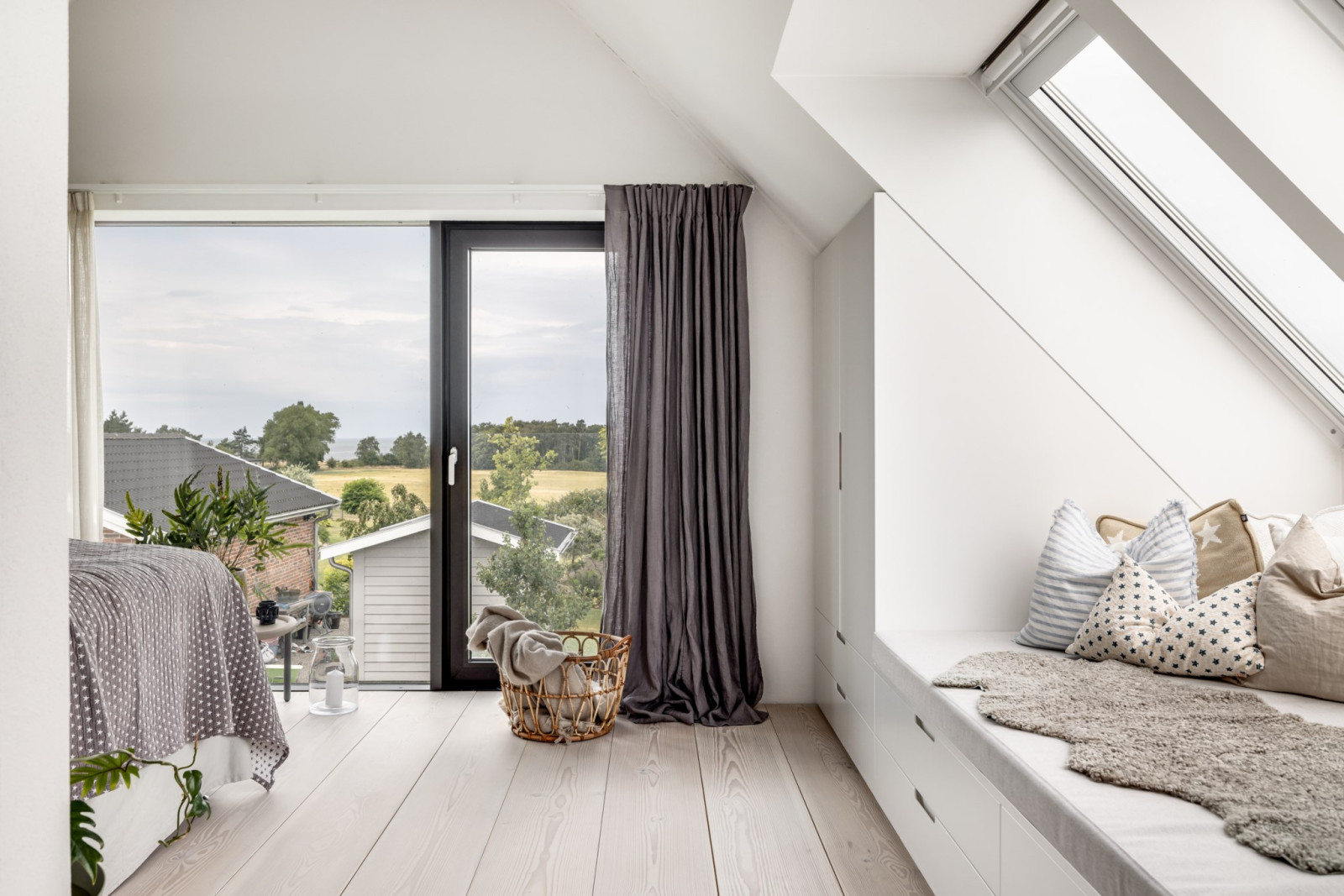 Trevligt sovrum med specialbyggd skjutdörr från golv till tak i douglasgran. Cirka 16 kvm, havsutsikt och utgång till uteplatsen.