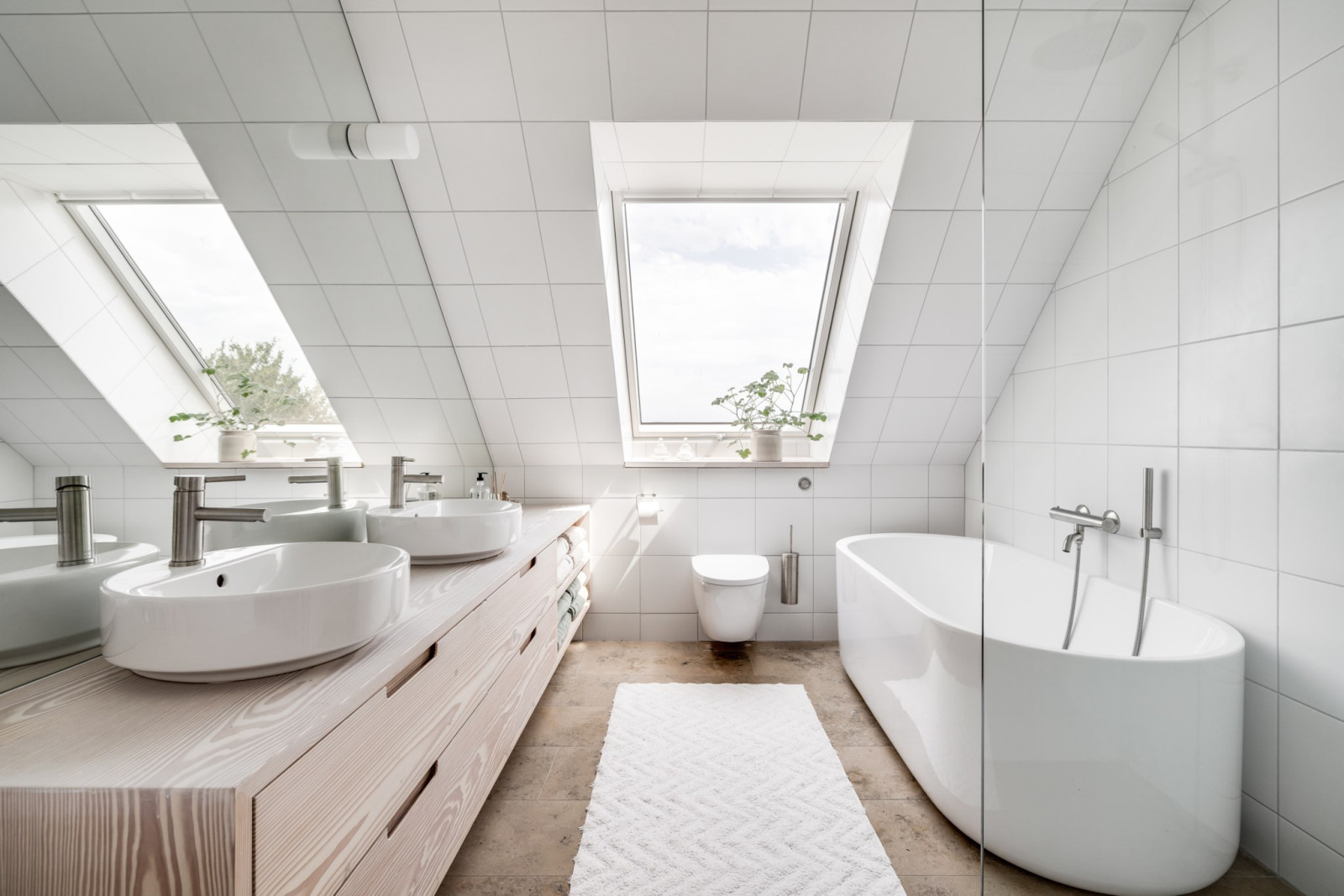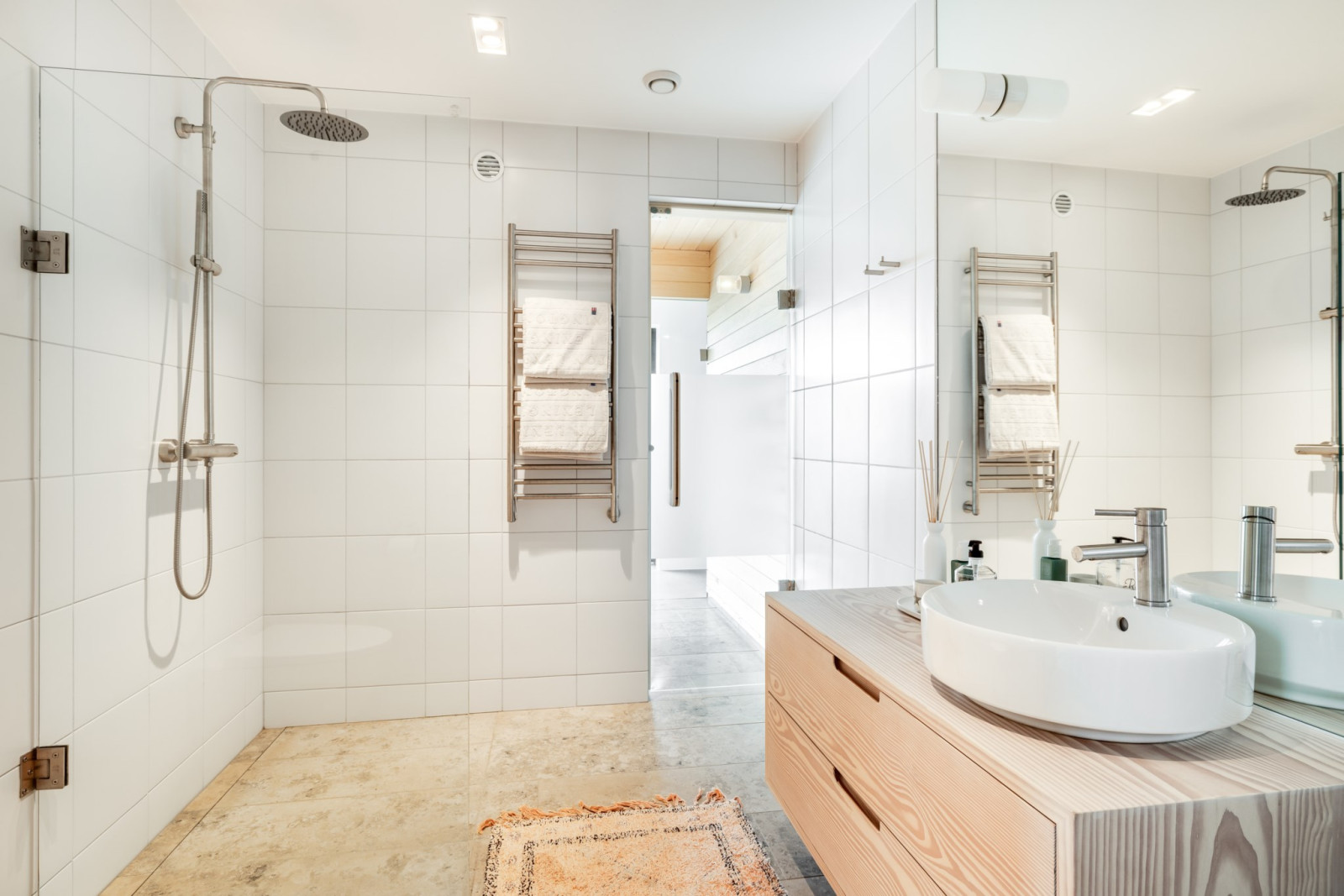 Smakfullt badrum i tidlös design. Platsbyggd inredning av samma höga kvalité som köket. Duschplats, wc och tvättställ. Underbar bastu i asp med obruten utsikt över fälten och Skälderviken. Utedusch utanför.