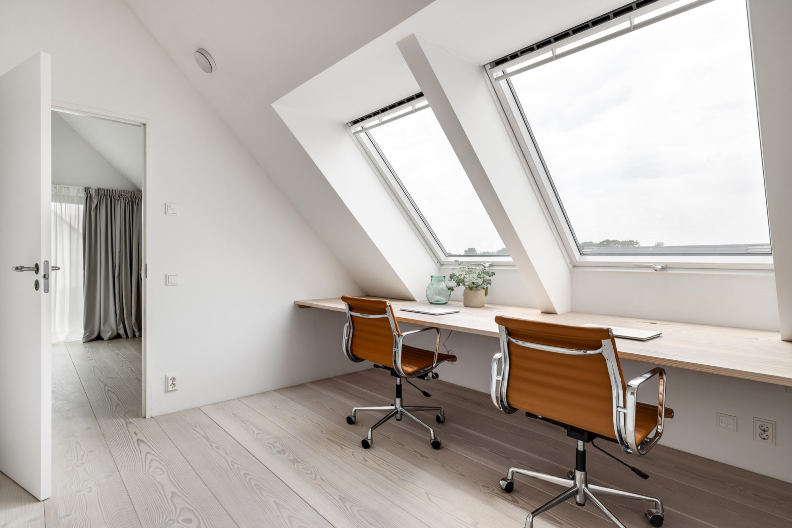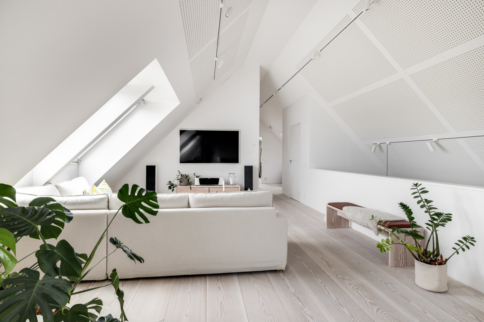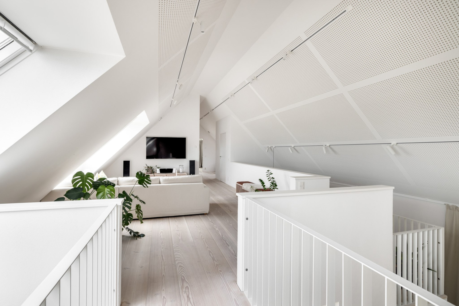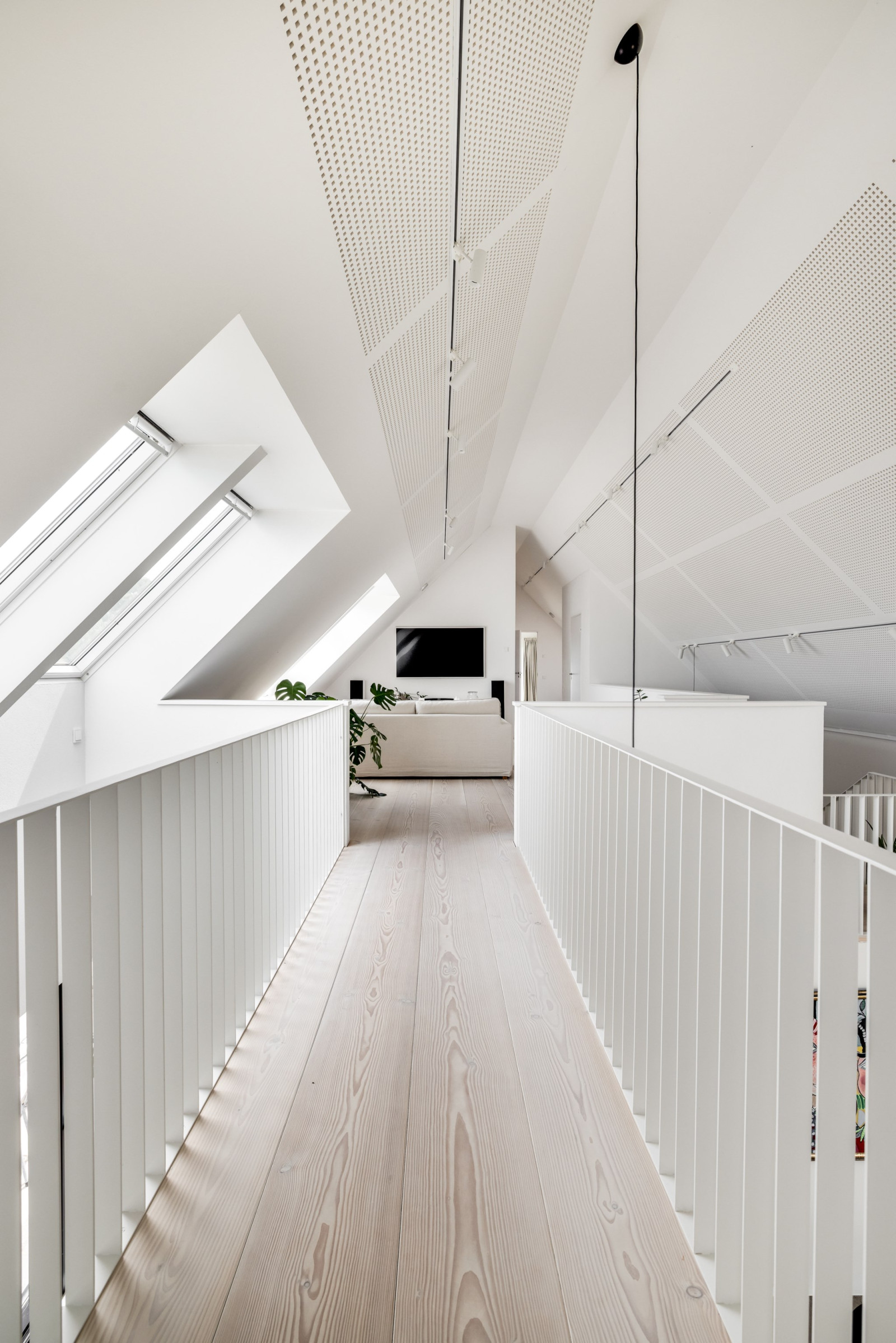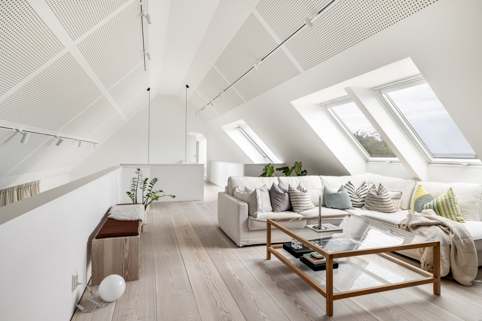 Ljust och luftigt allrum om cirka 34 kvm. Generöst med takfönster, öppet i nock och öppet ned till matrummet skapar en spännande känsla.