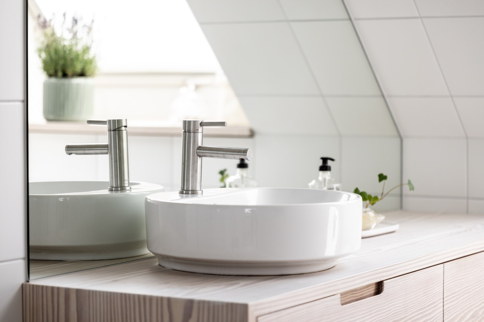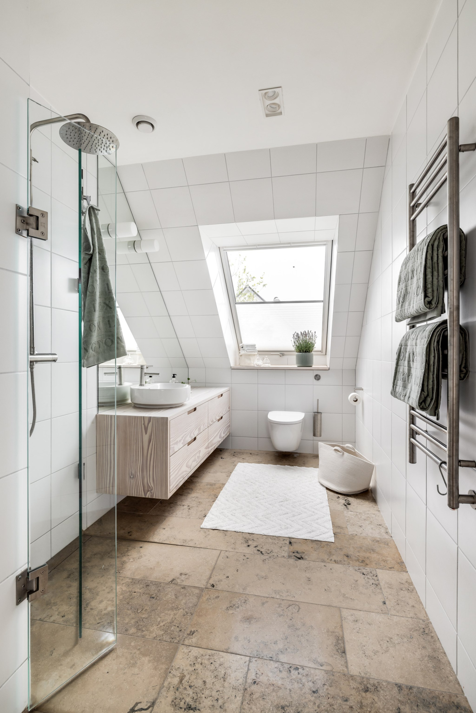 Smakfullt badrum i tidlös design. Platsbyggd inredning av samma höga kvalité som köket. Duschplats, wc och tvättställ.
