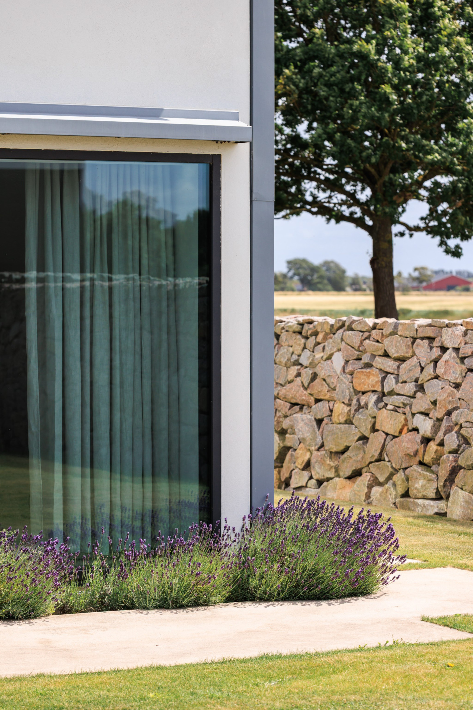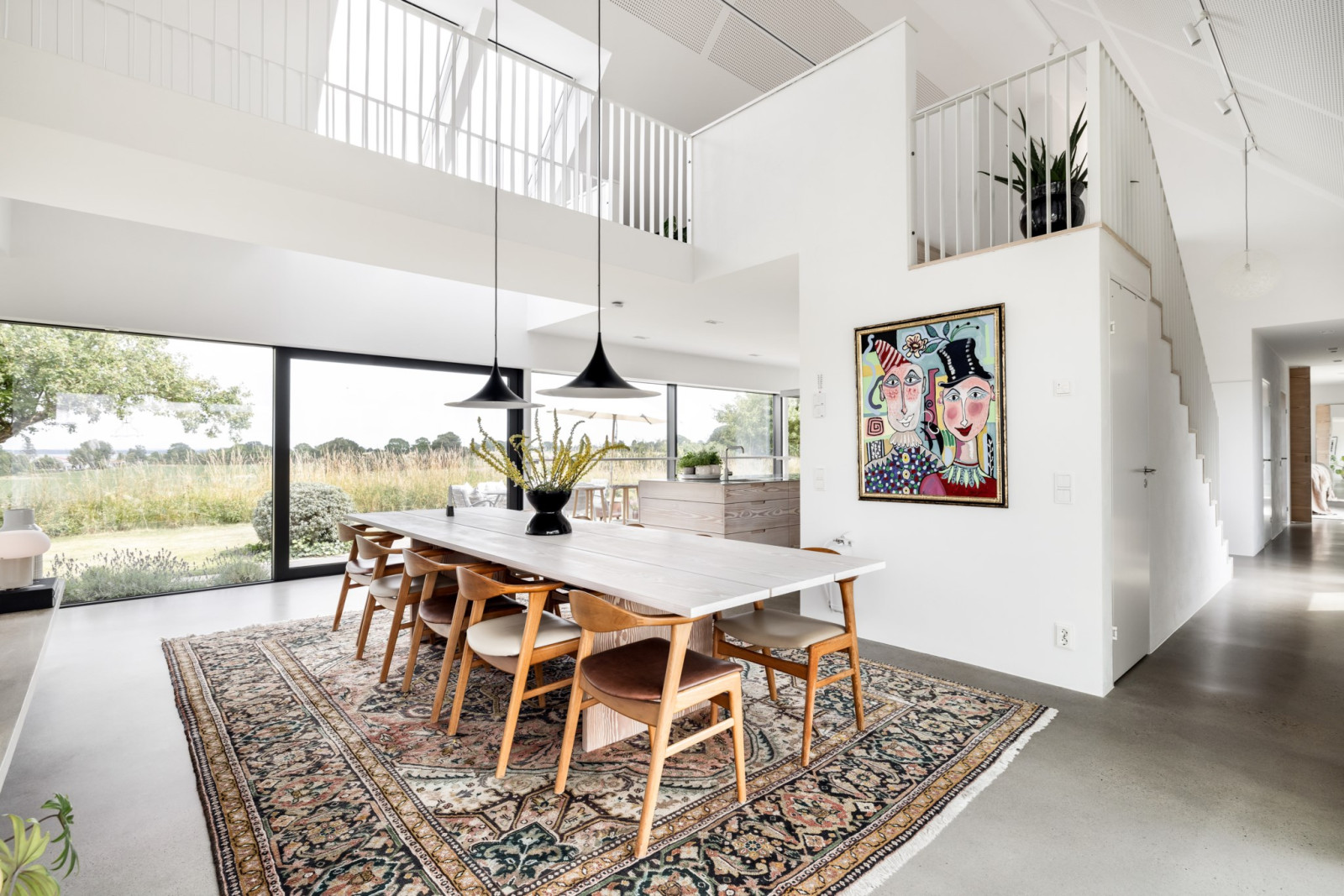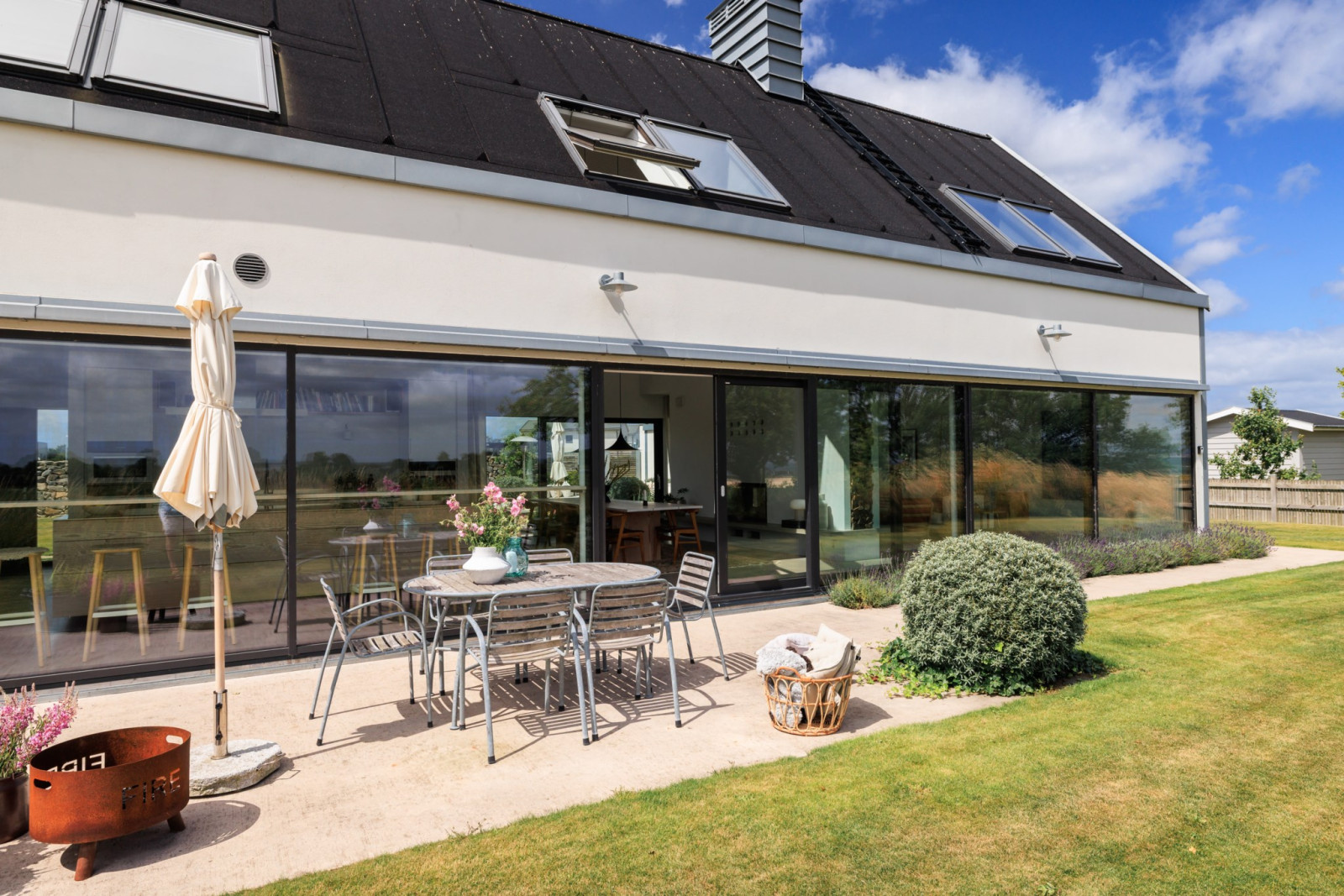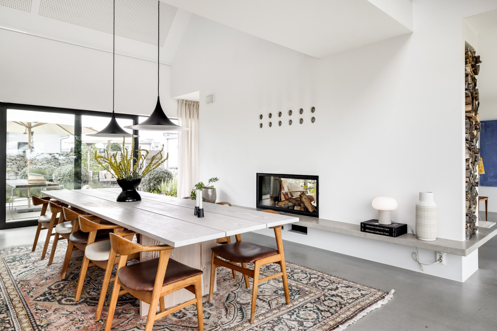 Generösa fönster- och skjutpartier från Schüco suddar ut gränsen mellan inne och ute och låter naturen bli en del av hemmet. Öppen planlösning med delvis takhöjd upp i nock och akustiktak skapar rymd och ett behagligt ljudklimat. Den specialdesignade eldstaden är extra bred och försedd med dubbla glas som ger en hemtrevlig känsla åt både matsalen och vardagsrummet.