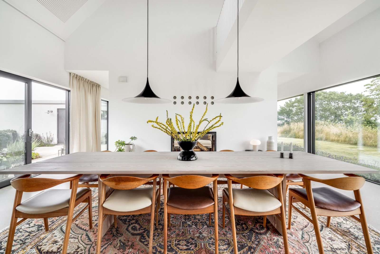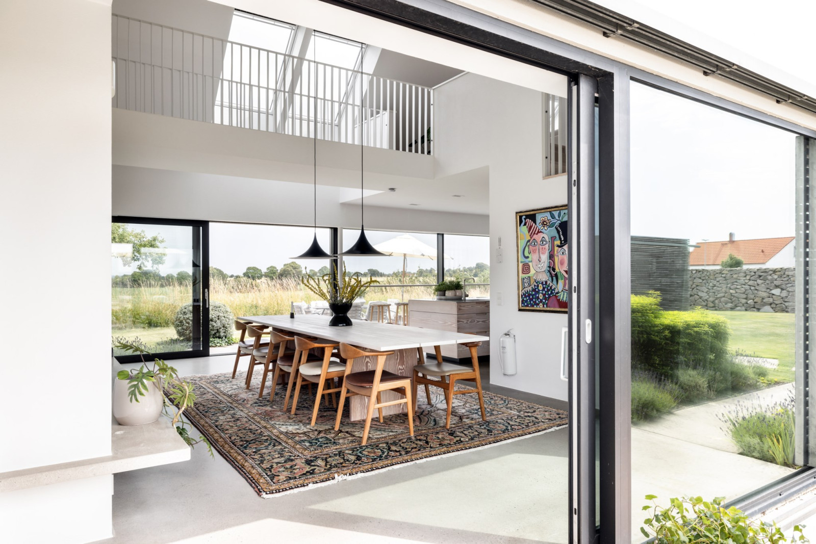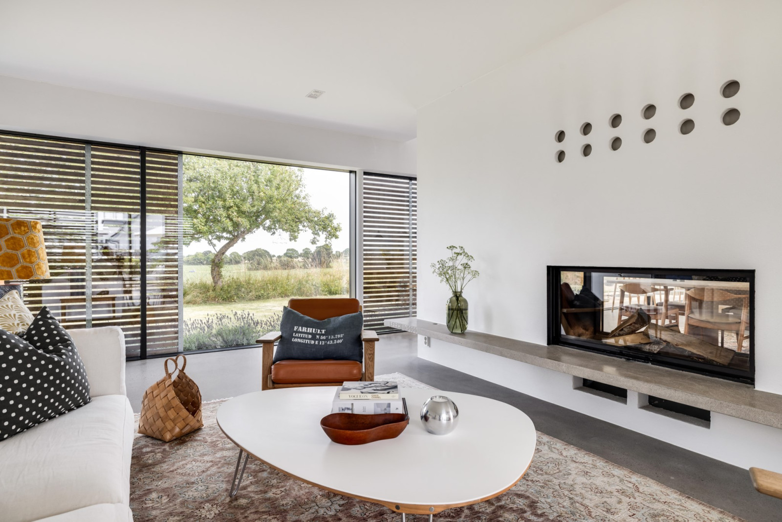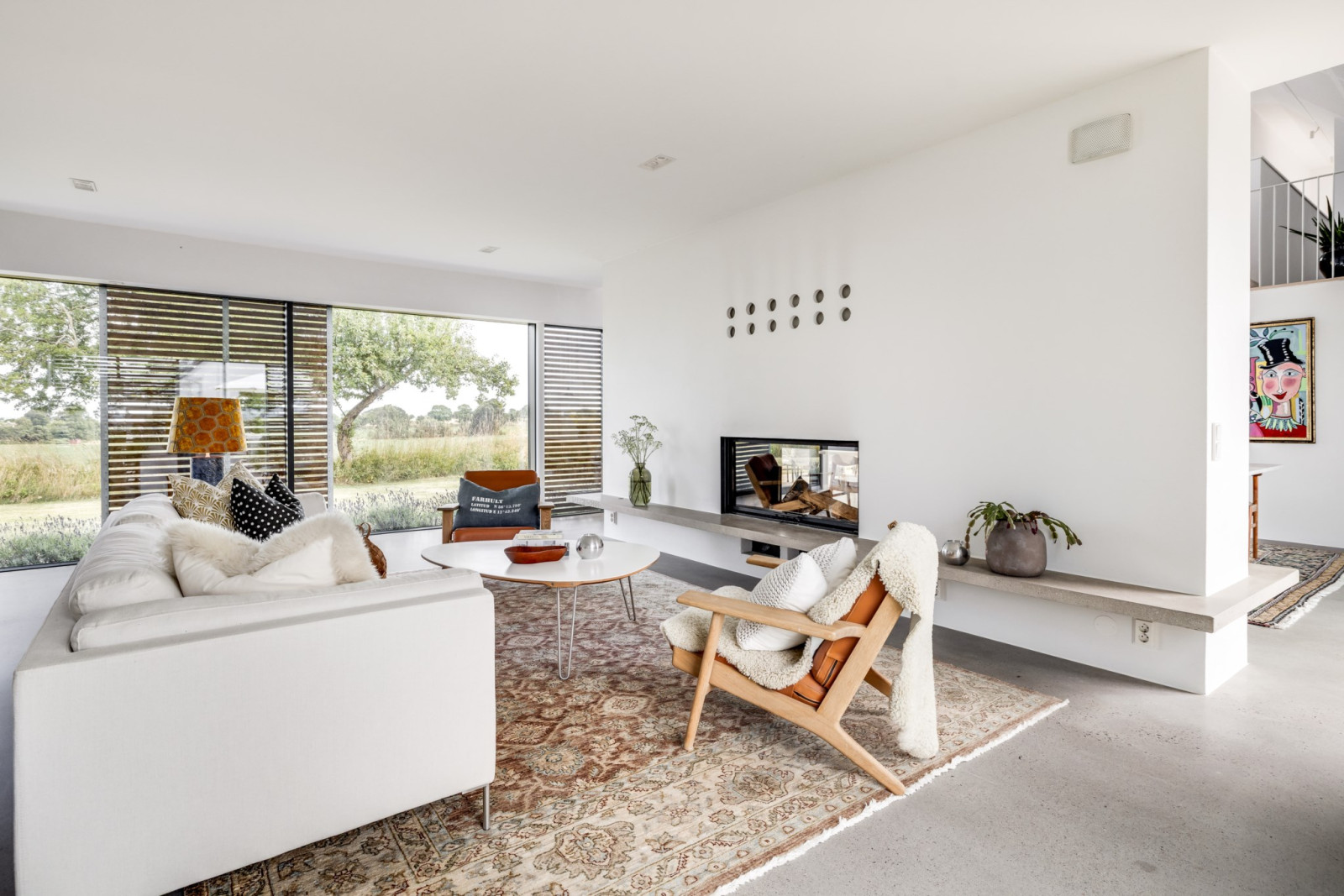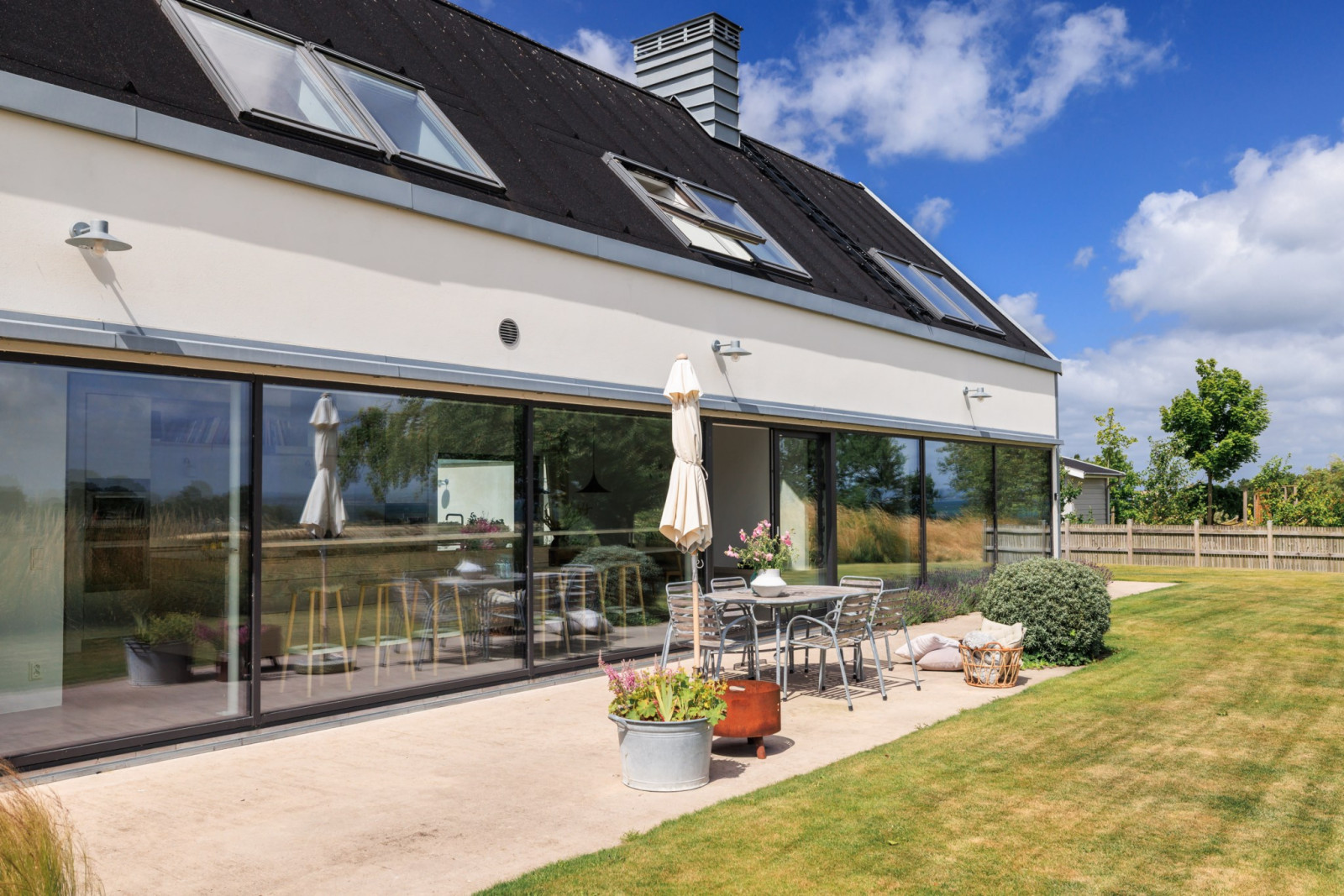 Generösa fönster- och skjutpartier från Schüco suddar ut gränsen mellan inne och ute och låter naturen bli en del av hemmet. Öppen planlösning med delvis takhöjd upp i nock och akustiktak skapar rymd och ett behagligt ljudklimat. Den specialdesignade eldstaden är extra bred och försedd med dubbla glas som ger en hemtrevlig känsla åt både matsalen och vardagsrummet.