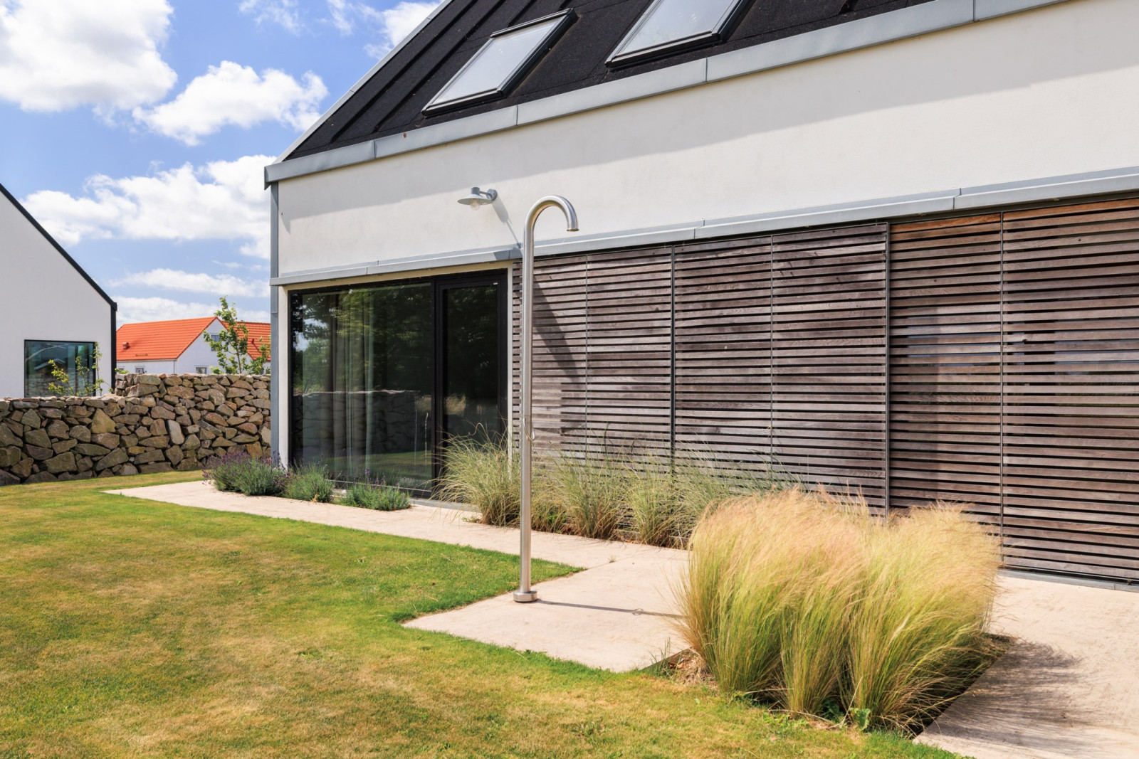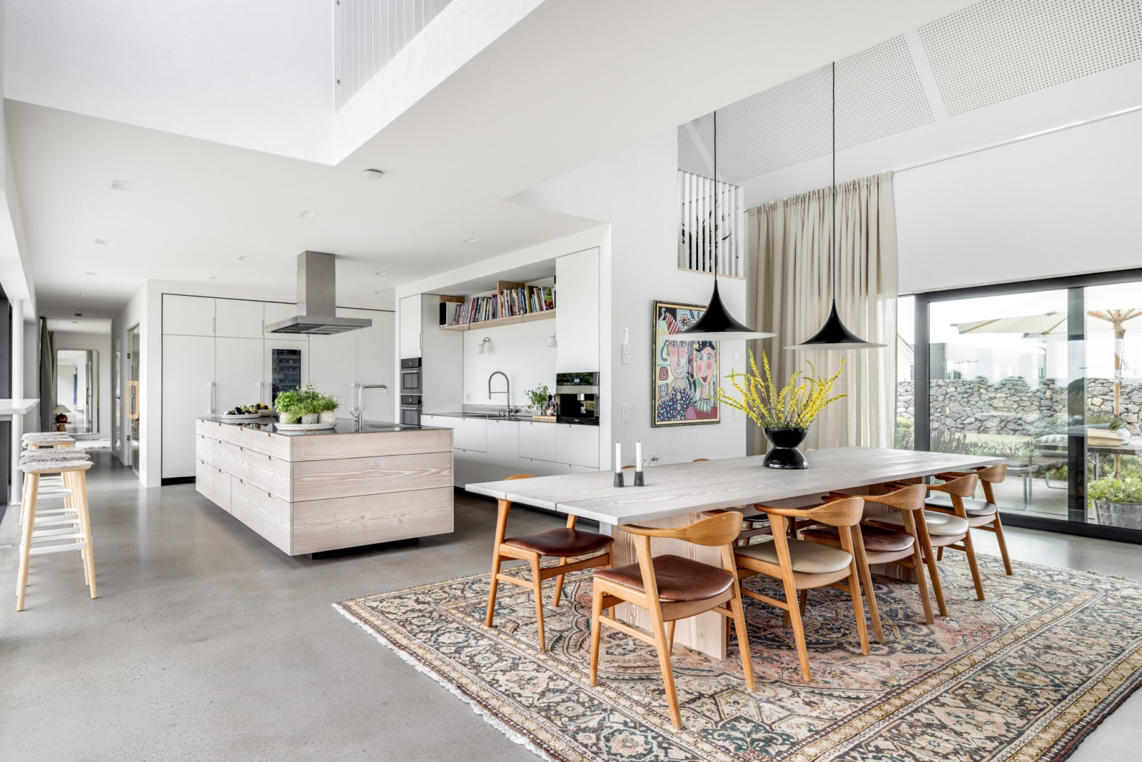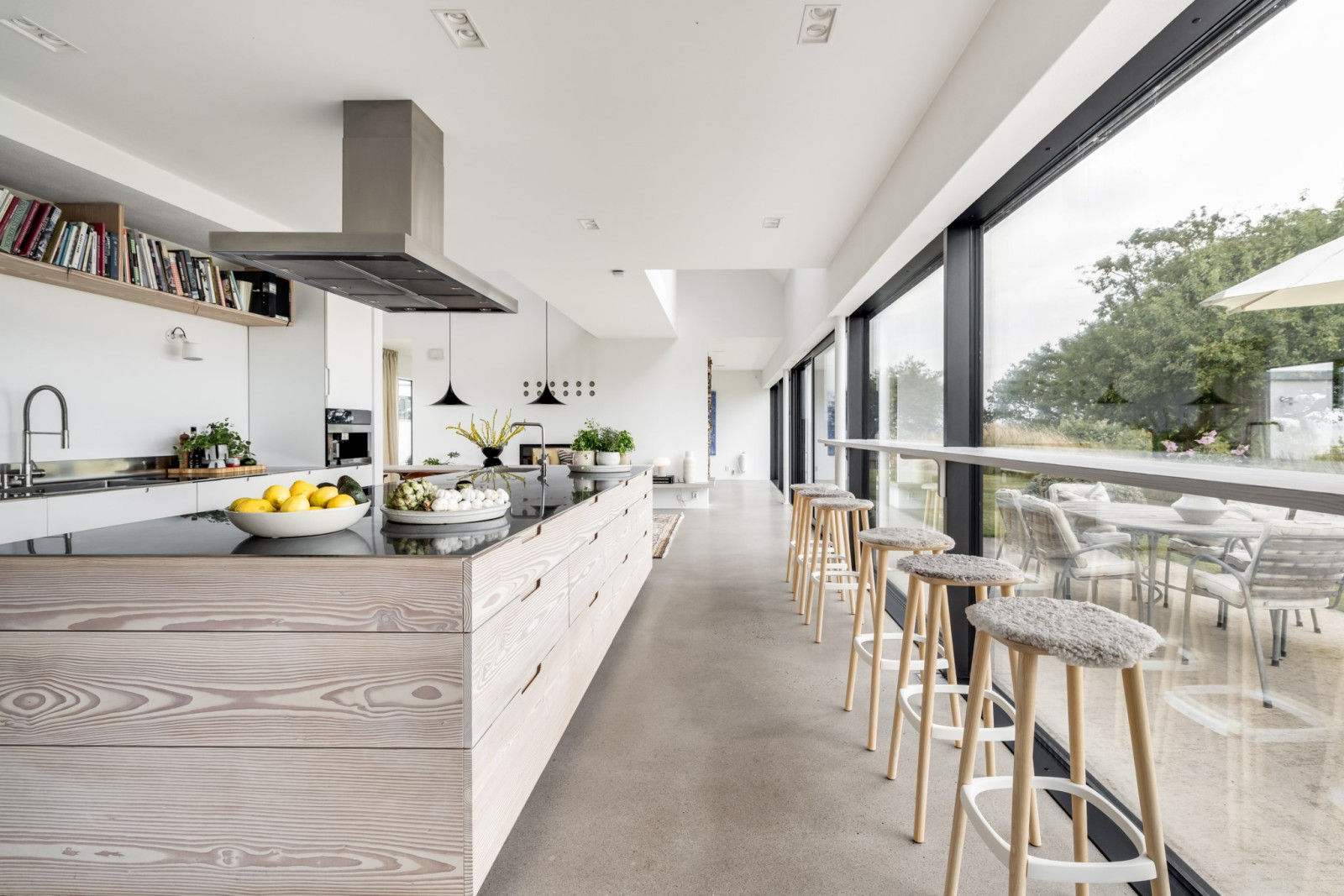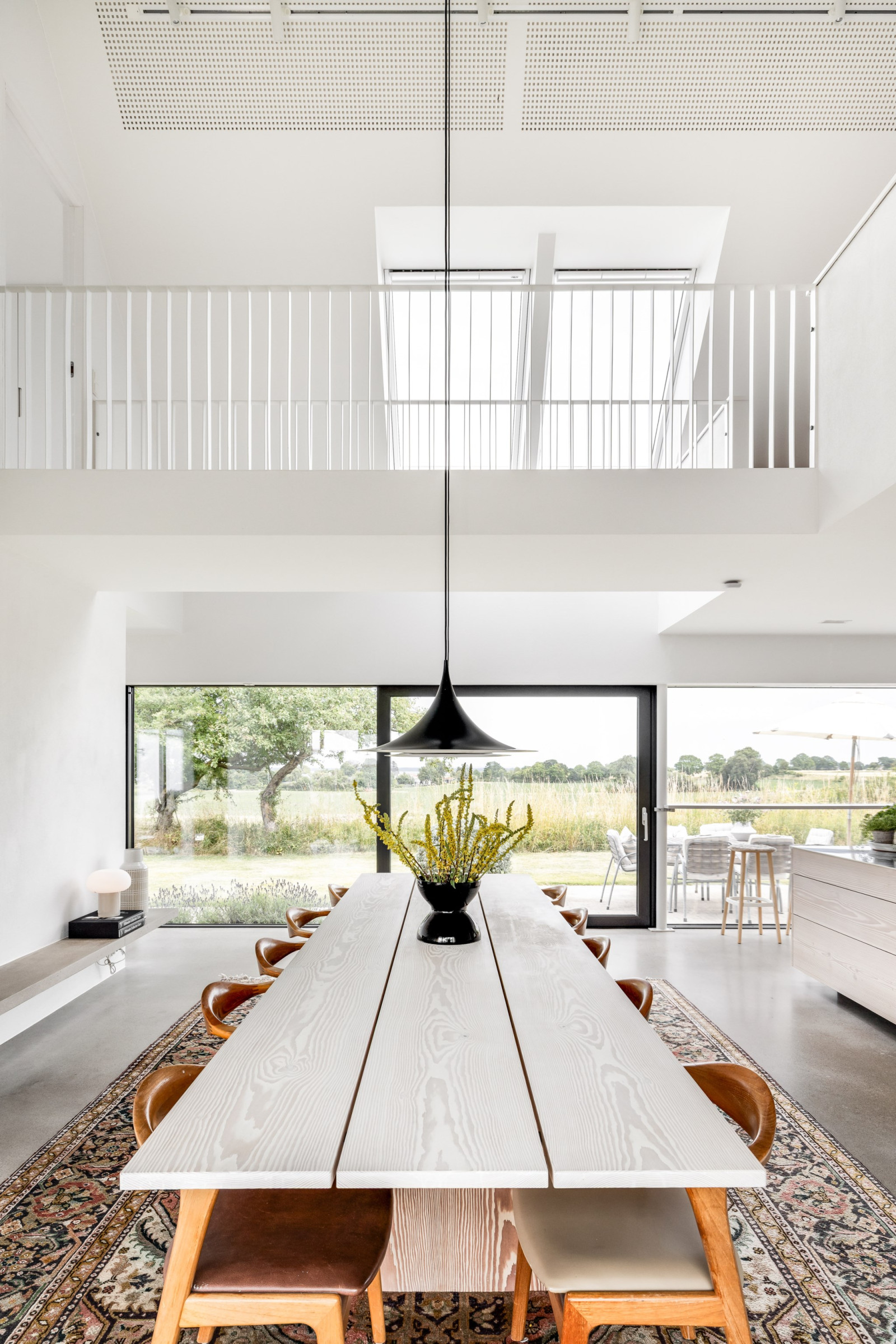 Generösa fönster- och skjutpartier från Schüco suddar ut gränsen mellan inne och ute och låter naturen bli en del av hemmet. Öppen planlösning med delvis takhöjd upp i nock och akustiktak skapar rymd och ett behagligt ljudklimat. Den specialdesignade eldstaden är extra bred och försedd med dubbla glas som ger en hemtrevlig känsla åt både matsalen och vardagsrummet.