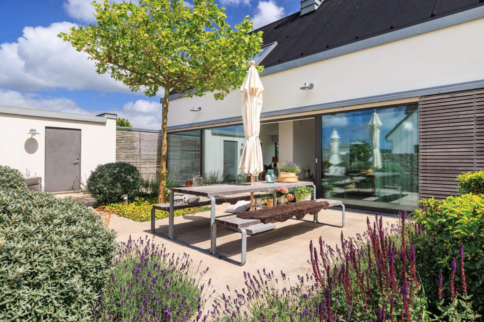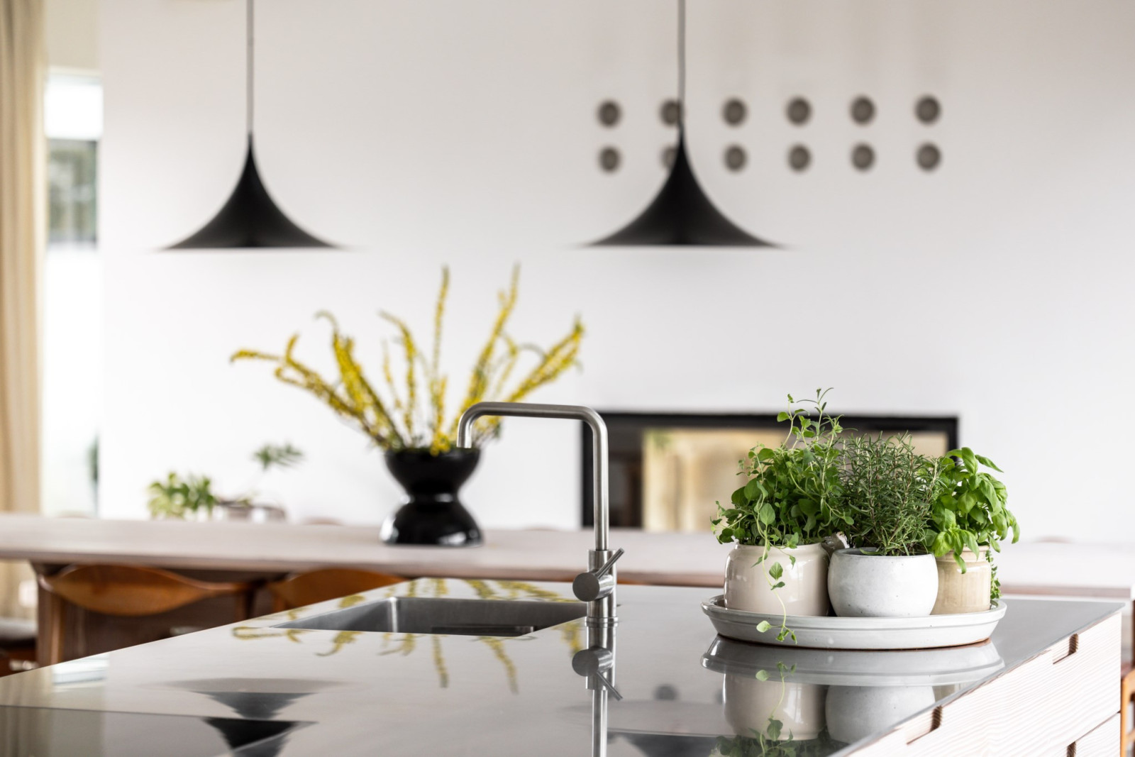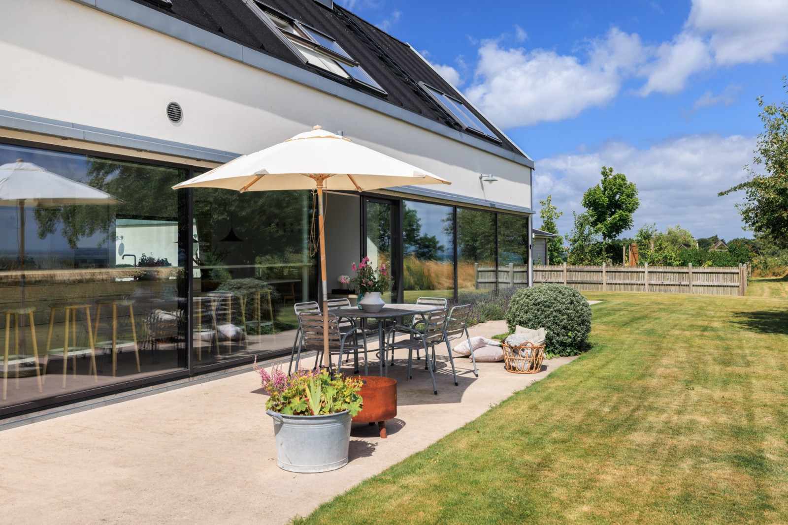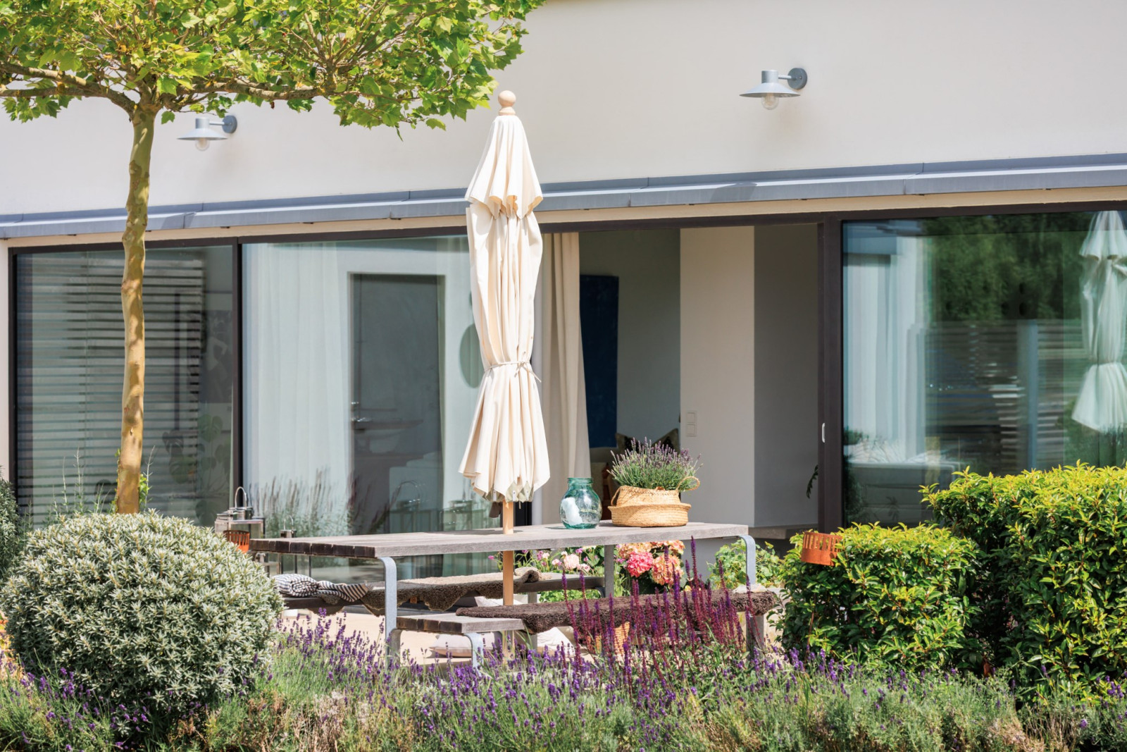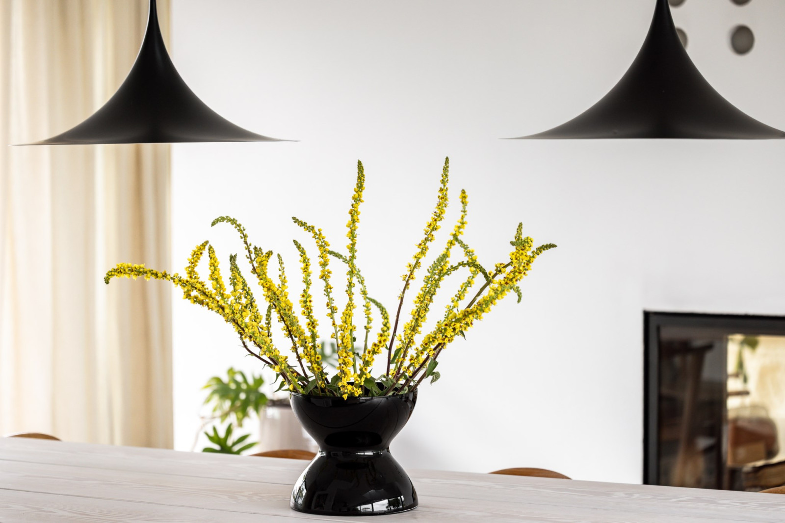 Generösa fönster- och skjutpartier från Schüco suddar ut gränsen mellan inne och ute och låter naturen bli en del av hemmet. Öppen planlösning med delvis takhöjd upp i nock och akustiktak skapar rymd och ett behagligt ljudklimat. Den specialdesignade eldstaden är extra bred och försedd med dubbla glas som ger en hemtrevlig känsla åt både matsalen och vardagsrummet.