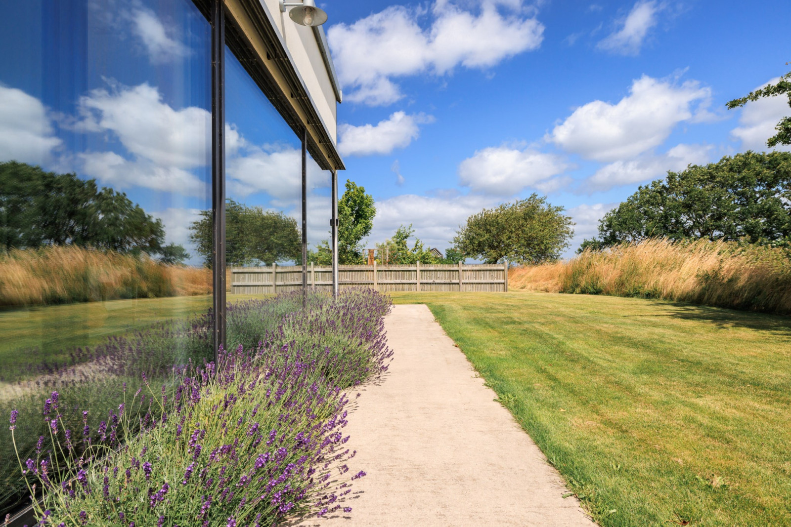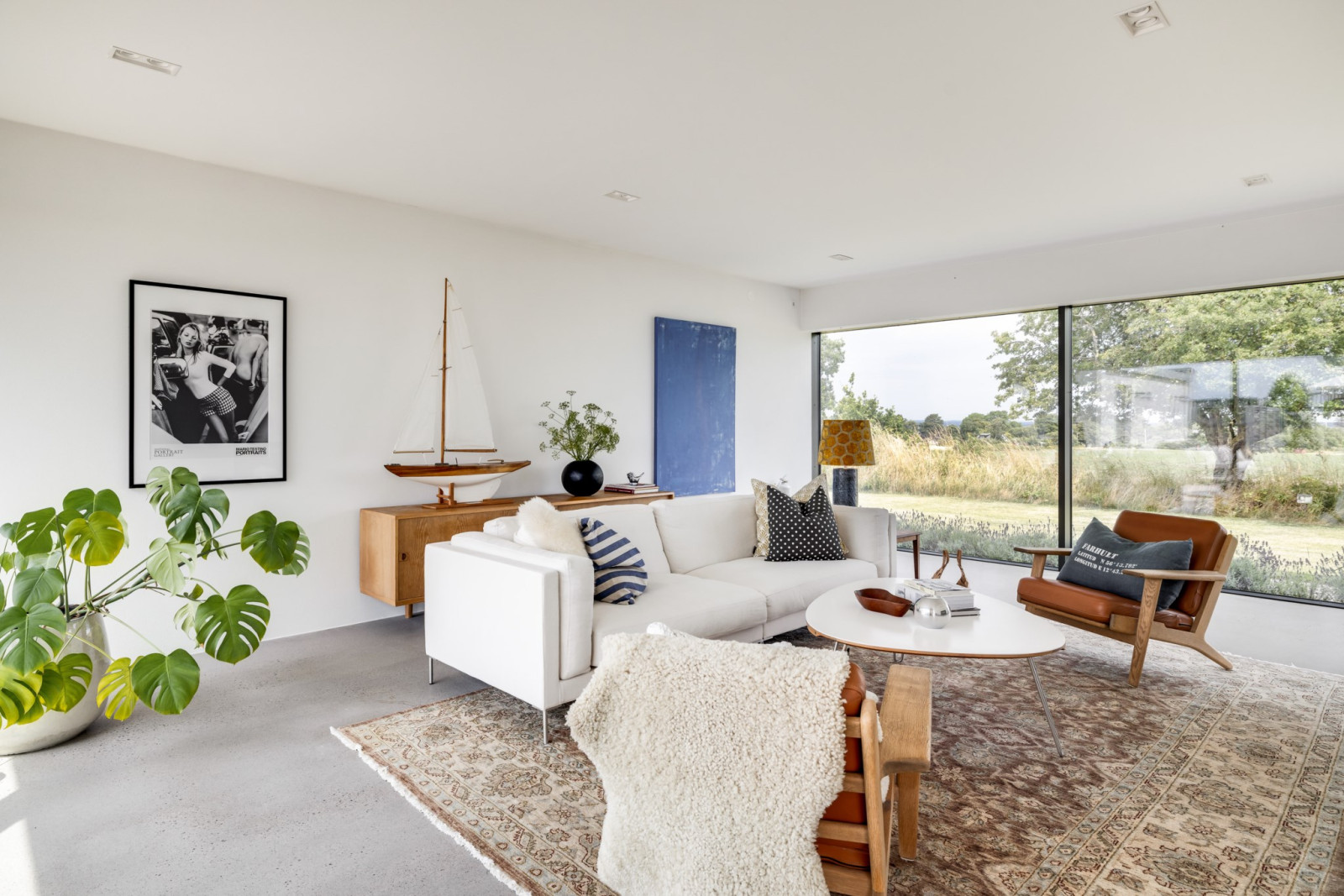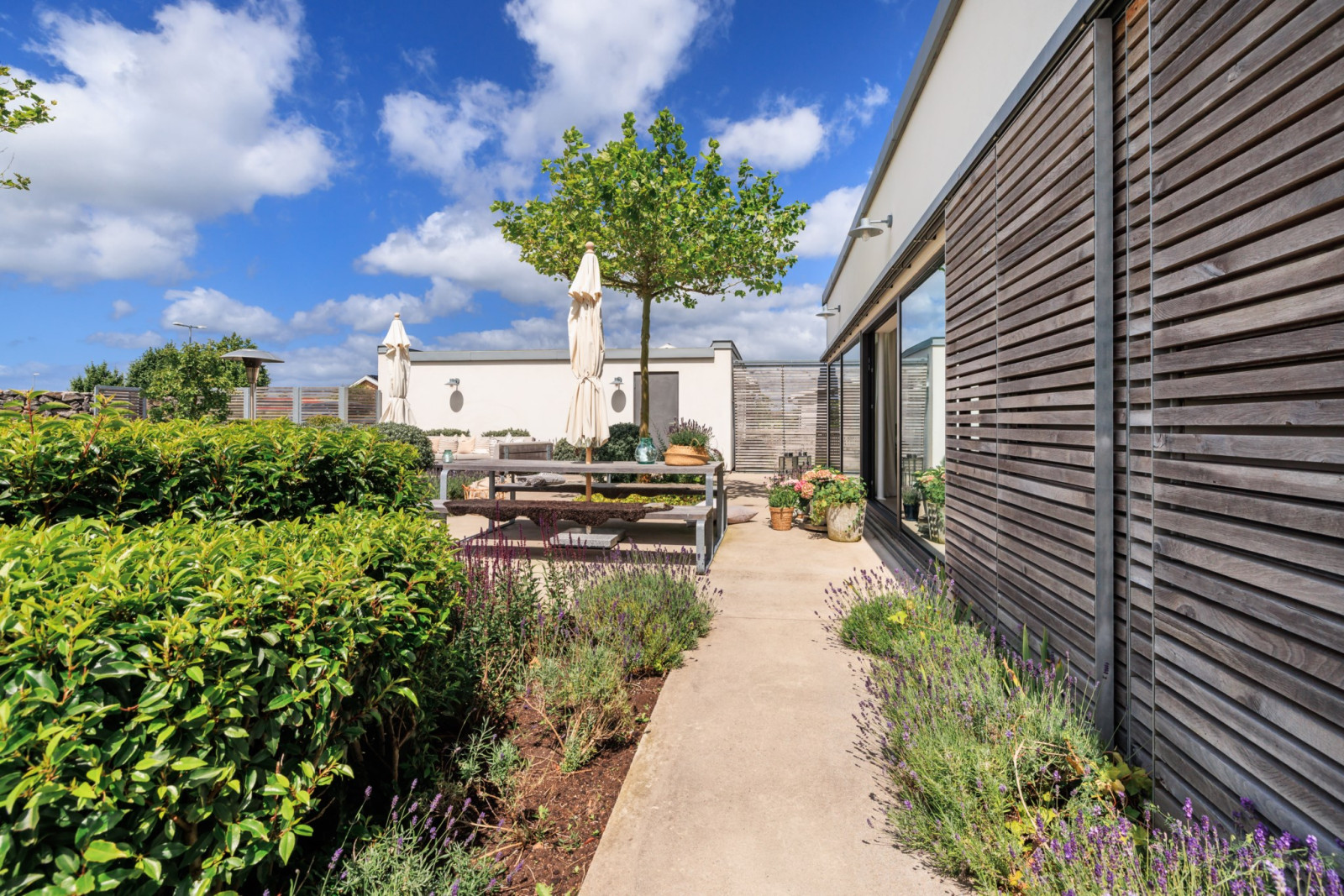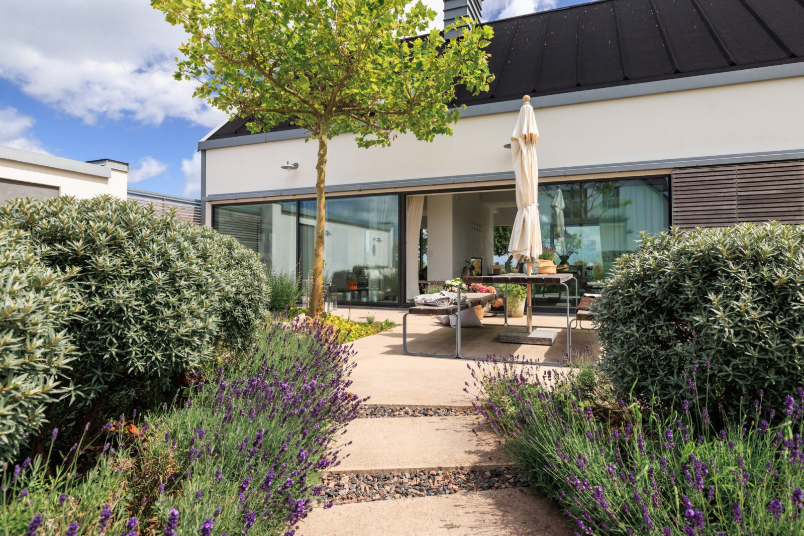 Generösa fönster- och skjutpartier från Schüco suddar ut gränsen mellan inne och ute och låter naturen bli en del av hemmet. Öppen planlösning med delvis takhöjd upp i nock och akustiktak skapar rymd och ett behagligt ljudklimat. Den specialdesignade eldstaden är extra bred och försedd med dubbla glas som ger en hemtrevlig känsla åt både matsalen och vardagsrummet.