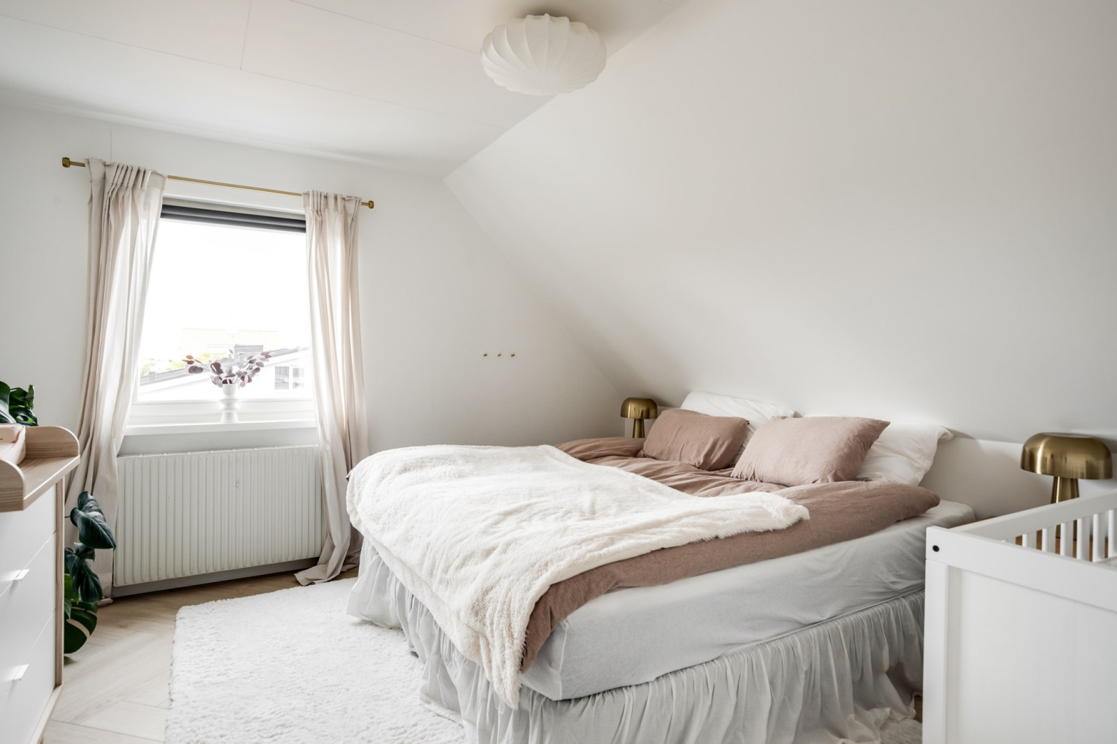 På entréplan finns två rogivande sovrum, båda med det fiskbenslagda golvet som löper vidare och skapar en enhetlig känsla i hemmet. Det större rummet erbjuder generös förvaring bakom stilrena skjutdörrsgarderober, medan det andra lämpar sig lika väl som barnrum, gästrum eller arbetsplats. Båda rummen präglas av en stillsam atmosfär och smakfulla materialval