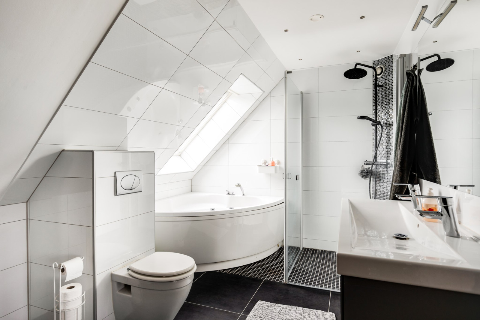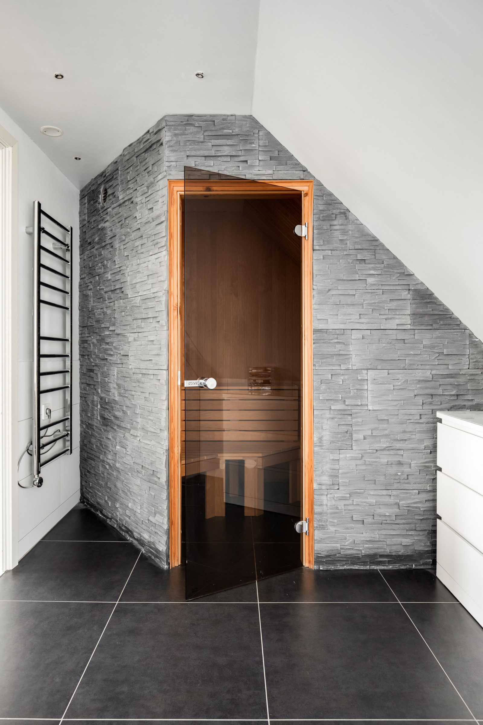 Badrummet på övre plan bjuder på en lyxig känsla med kakel och klinker i tidlös svartvitt kontrast. Här finns både en generös duschhörna med glasväggar och ett inbjudande hörnbadkar – perfekt för avkoppling. Den välplanerade bastun adderar en extra dos av vardagslyx. Ett badrum där varje detalj bidrar till en känsla av välbefinnande och exklusiv ro. Utrustat med tvättställskommod med dubbla kranar, spotlights, handdukstork och golvvärme.