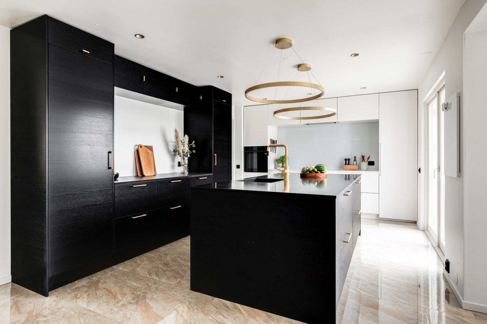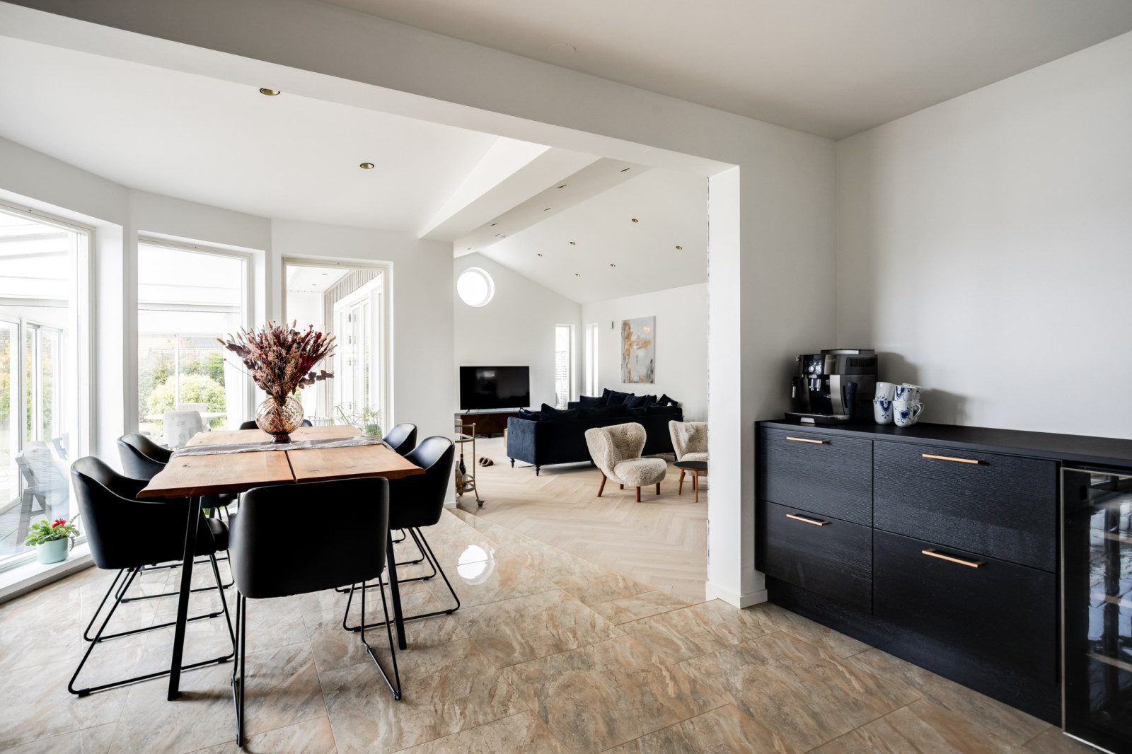 Köket är ett stilrent danskt designkök från Multiform och Epoq där form och funktion samspelar i perfekt balans. Den generösa köksön bjuder in till både umgänge och matlagning, medan den smart planerade förvaringen ger plats åt allt du behöver – och lite till. En separat kaffestation adderar en lyxig vardagsdetalj och gör morgonrutinen till en stund att se fram emot. Här flödar ljuset in och det öppna sambandet mot matplatsen skapar en social och inbjudande atmosfär. Utgång genom pardörrar till uteplats med eftermiddags och kvällssol.