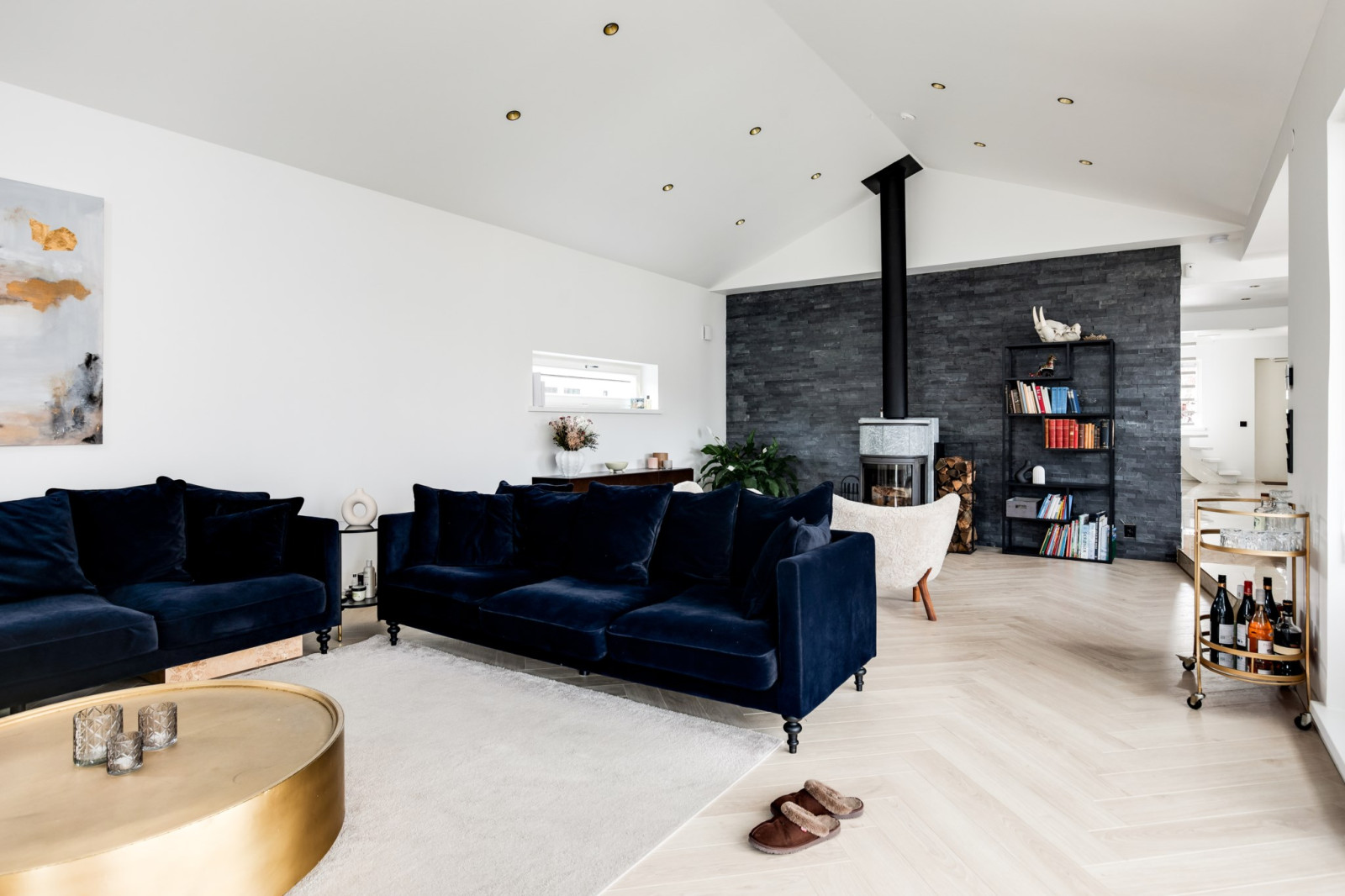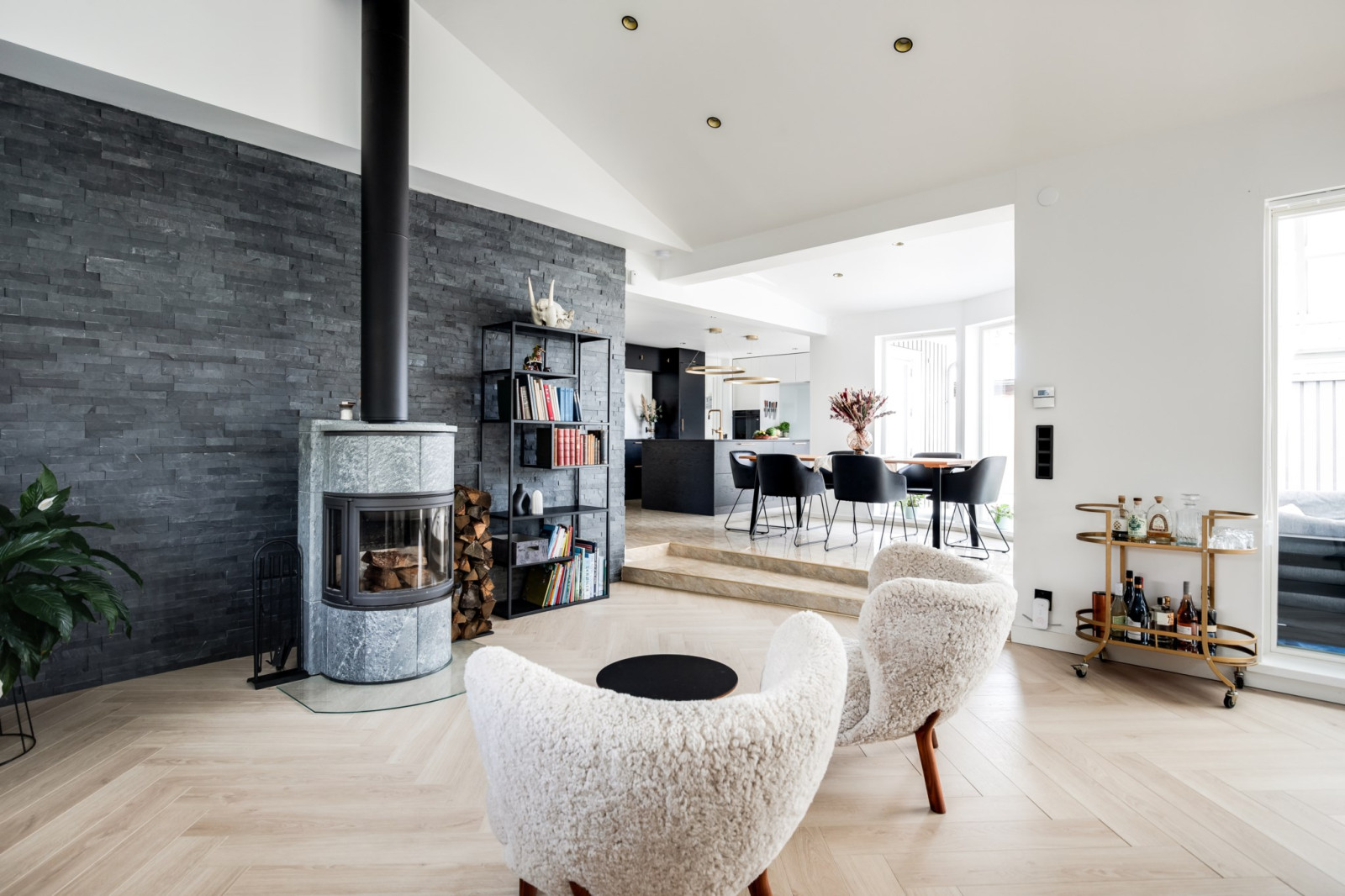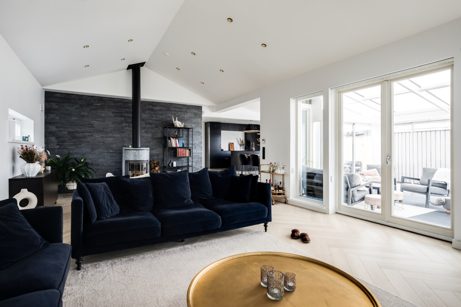 Från köket fortsätter hemmet, med två trappsteg ner, vidare mot det generösa vardagsrummet – en plats skapad för både avkoppling och umgänge. Det moderna fiskbenslagda golvet ger rummet karaktär och tidlös elegans, medan eldstaden skapar en självklar mittpunkt under årets kallare dagar. Det öppna rummet med tak upp i nock ger en härlig känsla av rymd och ljus, och via altandörrarna nås det inbjudande uterummet som förlänger säsongen långt in på året. En storslagen sällskapsyta där vardag och fest möts i perfekt harmoni.