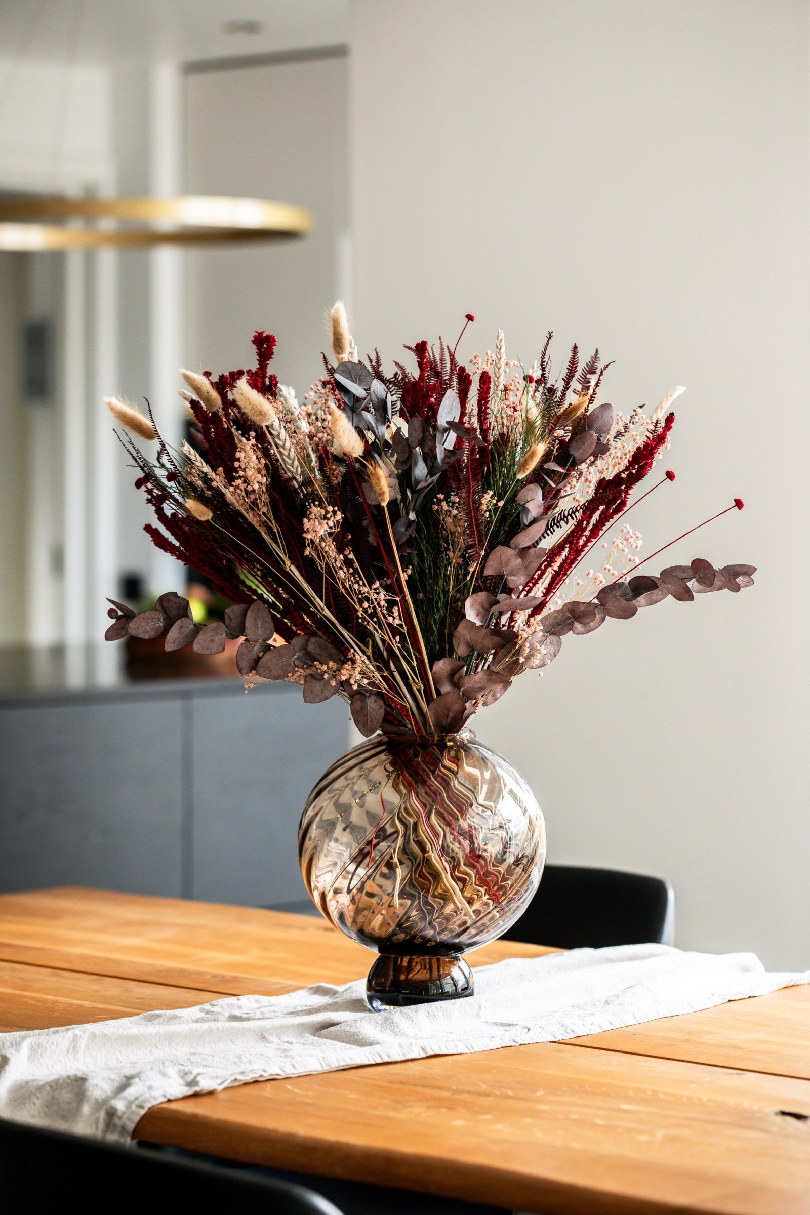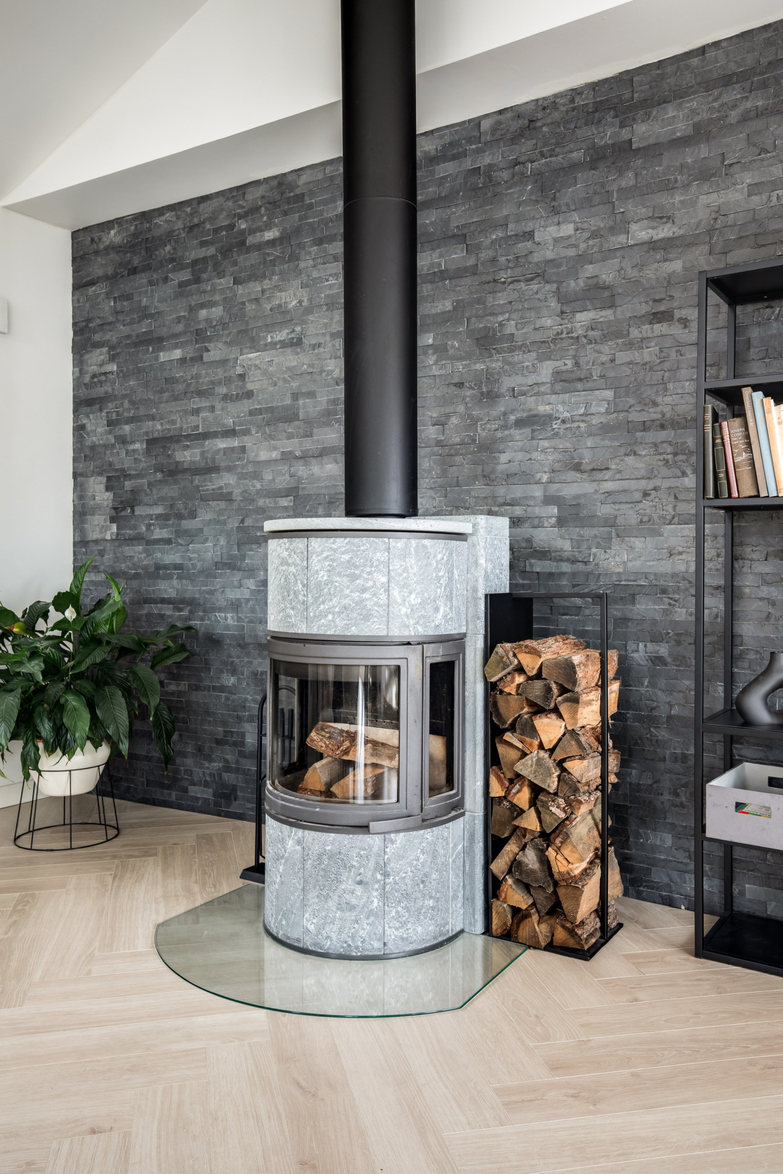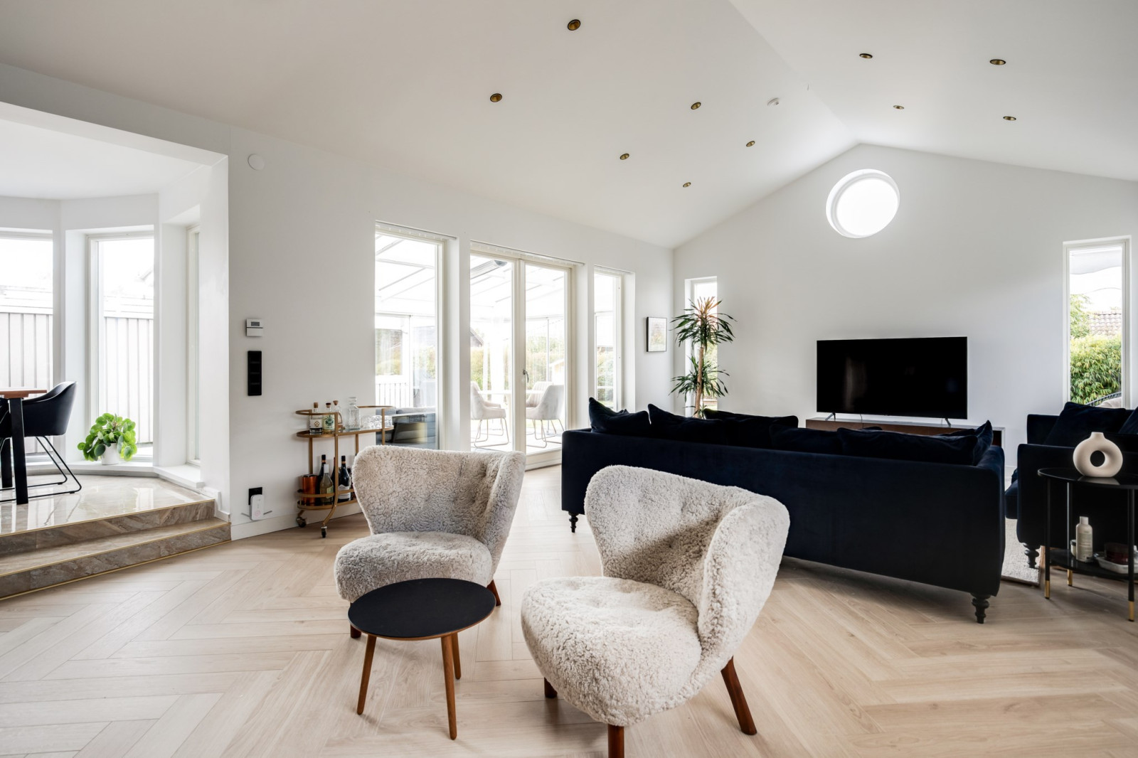 Från köket fortsätter hemmet, med två trappsteg ner, vidare mot det generösa vardagsrummet – en plats skapad för både avkoppling och umgänge. Det moderna fiskbenslagda golvet ger rummet karaktär och tidlös elegans, medan eldstaden skapar en självklar mittpunkt under årets kallare dagar. Det öppna rummet med tak upp i nock ger en härlig känsla av rymd och ljus, och via altandörrarna nås det inbjudande uterummet som förlänger säsongen långt in på året. En storslagen sällskapsyta där vardag och fest möts i perfekt harmoni.