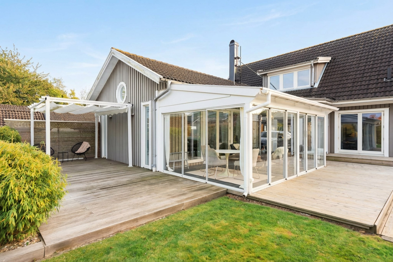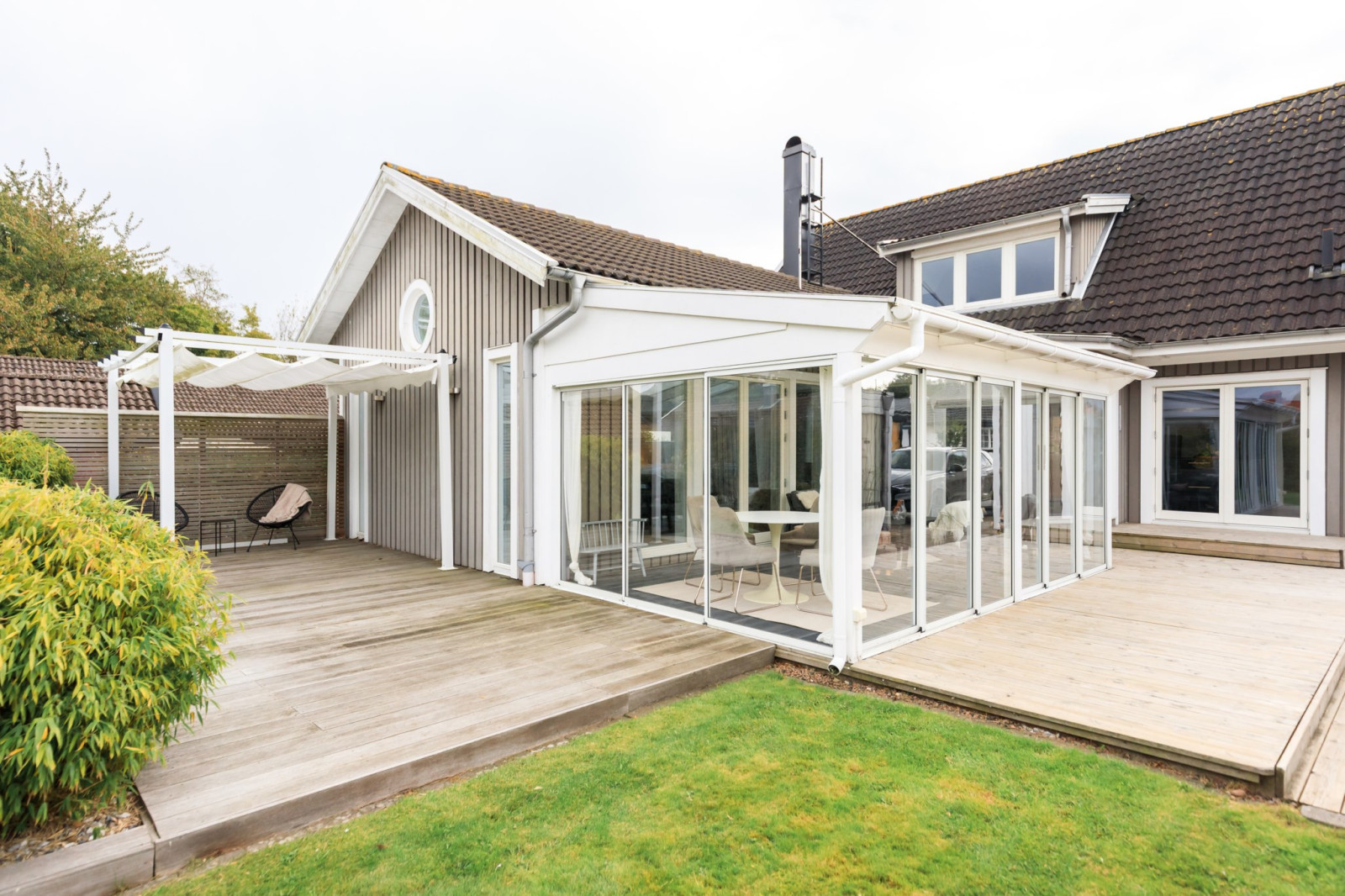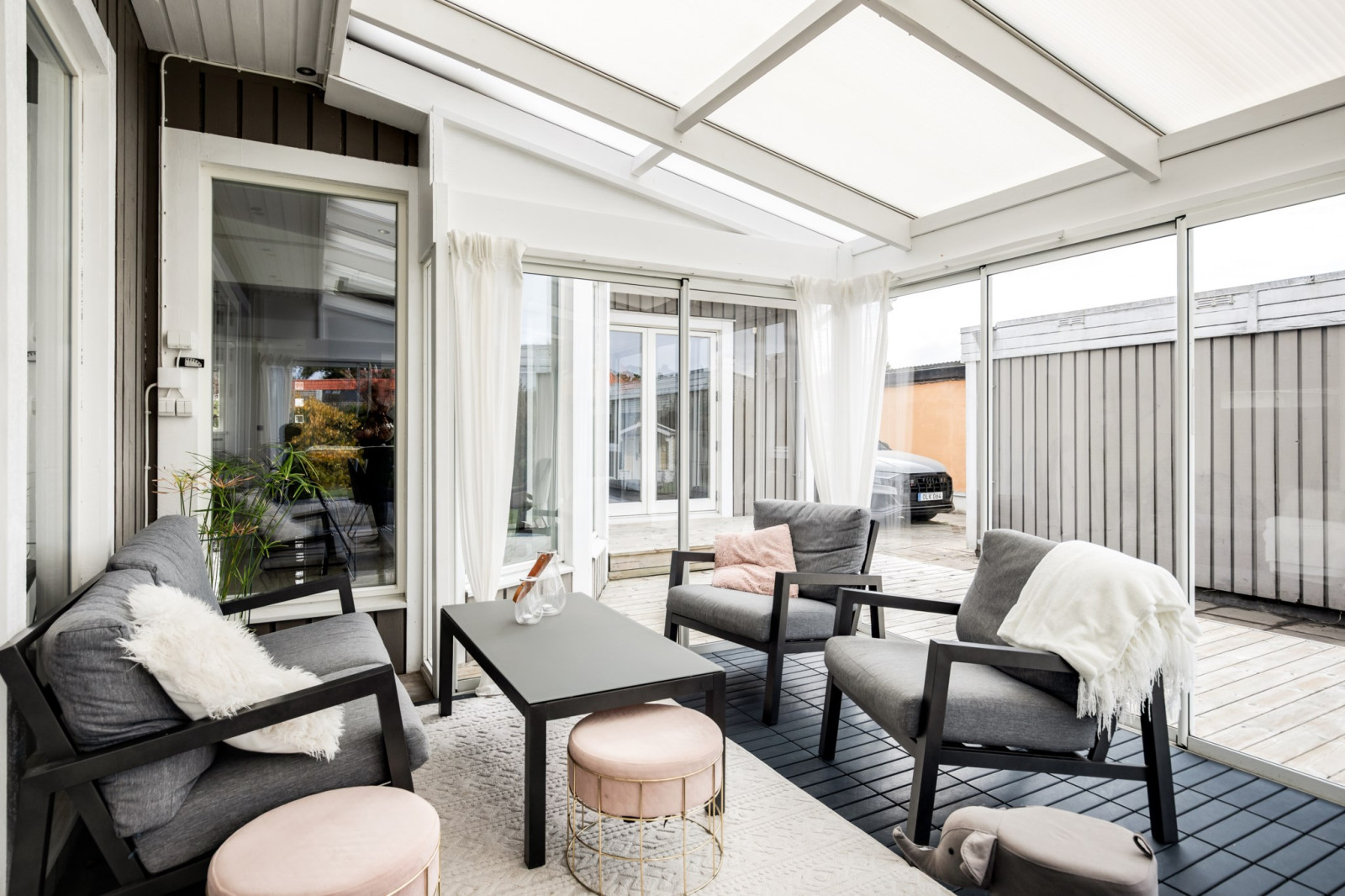 Det inglasade uterummet blir en naturlig förlängning av vardagsrummet – en plats att njuta av oavsett årstid. Här ryms både middagar och stilla stunder, omgiven av grönska och ljus. De generösa glaspartierna kan öppnas upp från alla håll, vilket suddar ut gränsen mellan ute och inne och skapar en luftig, trivsam atmosfär. Ett rum att leva i – från tidig vår till sen höst