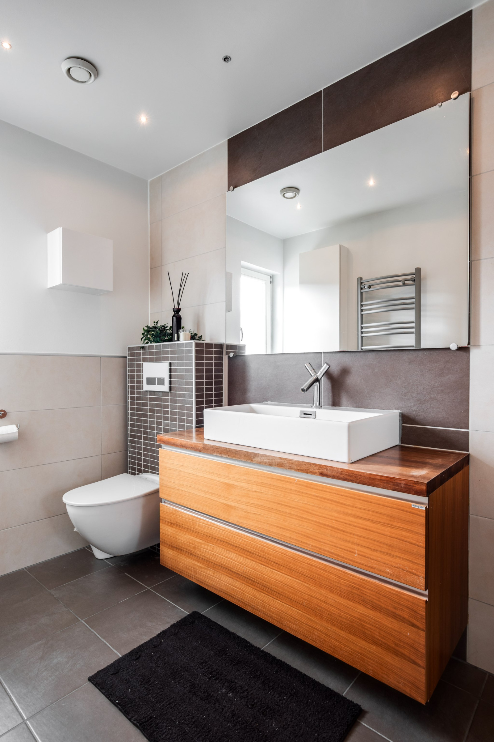 Duschrummet nås smidigt från hallen och präglas av en harmonisk färgskala med kakel och klinker i sobra toner. Här samspelar funktion och estetik på ett självklart sätt – från den stilfulla träkommoden till den generösa duschhörnan med glasdörrar. Utrustat med handdukstork, spotlights samt vattenburen golvvärme.