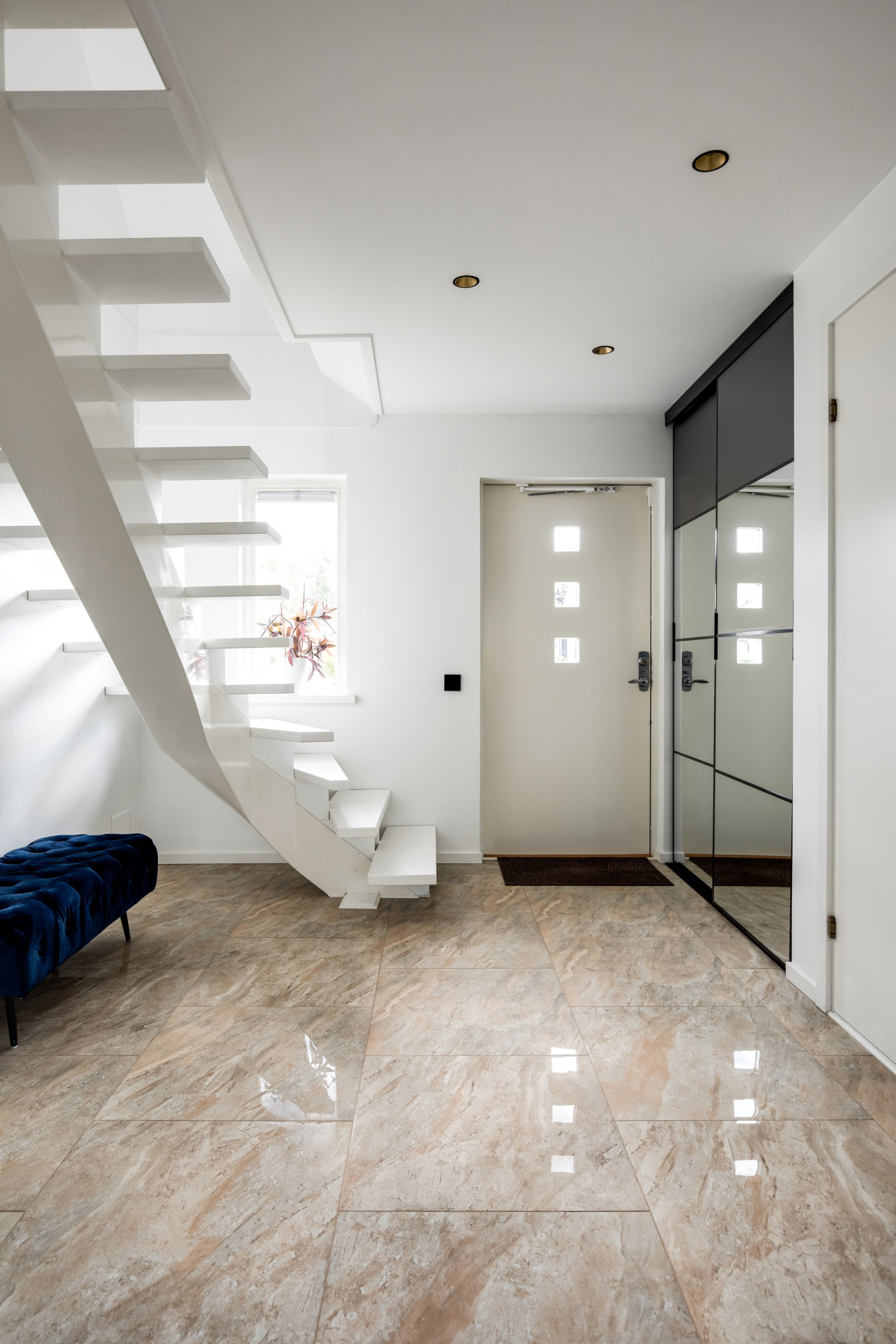Redan i hallen möts du av en inbjudande känsla av rymd och harmoni. Det exklusiva klinkergolvet löper elegant vidare in i köket och binder samman ytorna på ett smakfullt sätt. Stilrena skjutdörrsgarderober ger generös förvaring och ett lugnt, genomtänkt uttryck. Här öppnar huset upp sig – en försmak av den ljusa och luftiga helhet som väntar längre in.