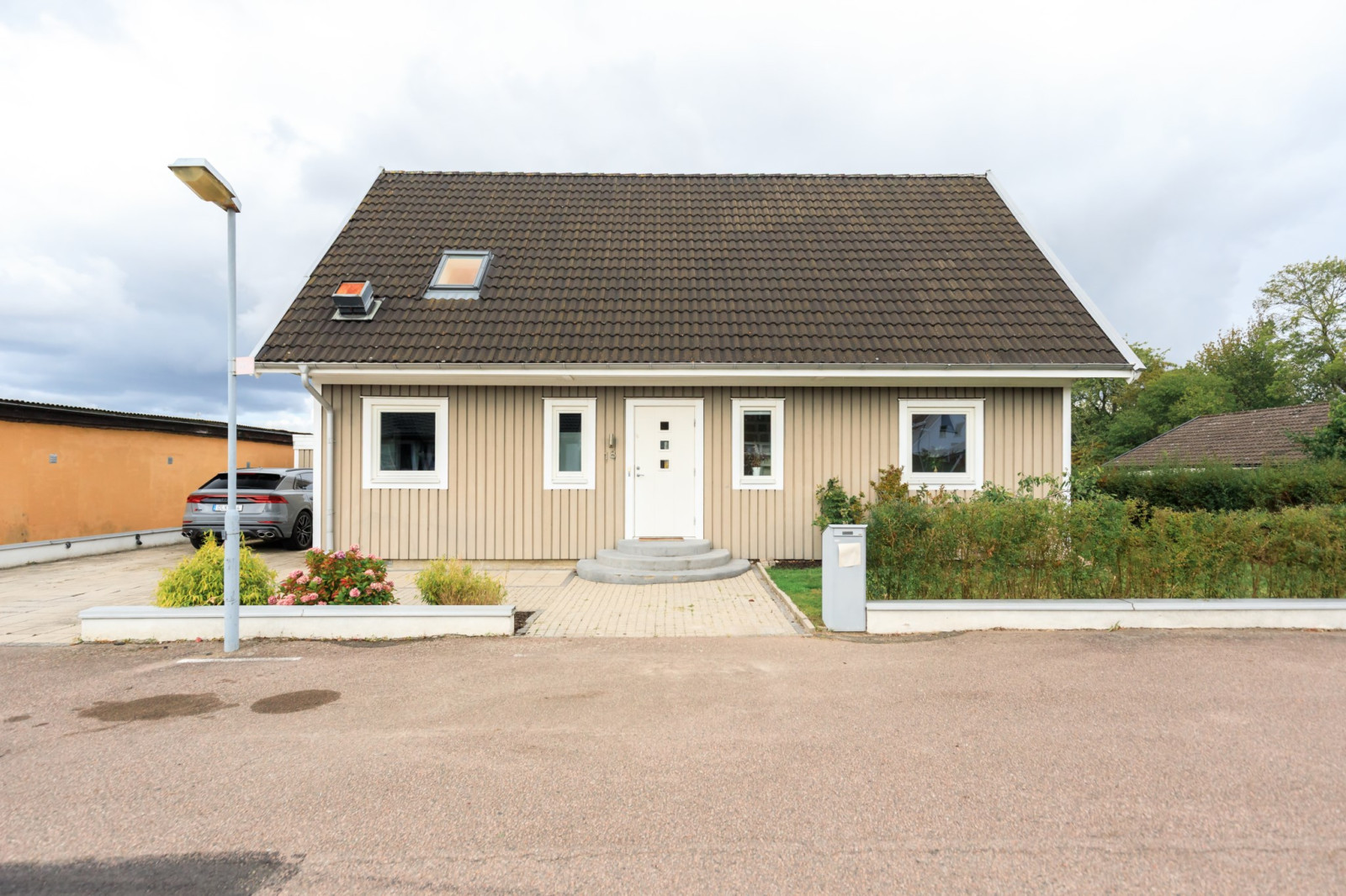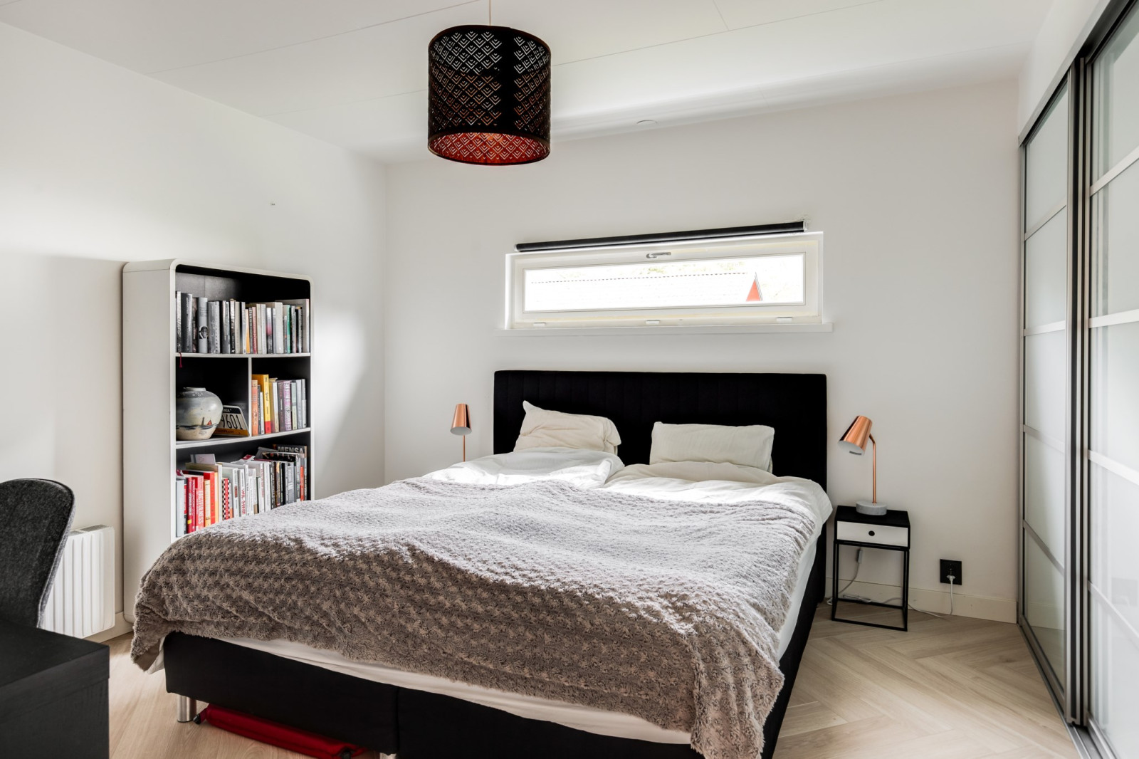 På övre plan väntar tre rymliga sovrum, varav ett generöst master bedroom med plats för både vila och förvaring i rymlig klädkammare. Fiskbenslagt golv löper genom hela våningsplanet och skapar en känsla av sammanhang och kvalitet.