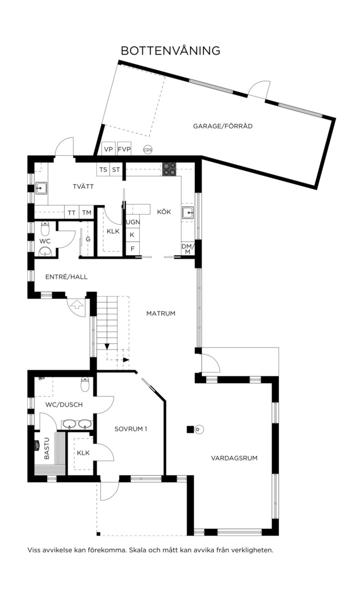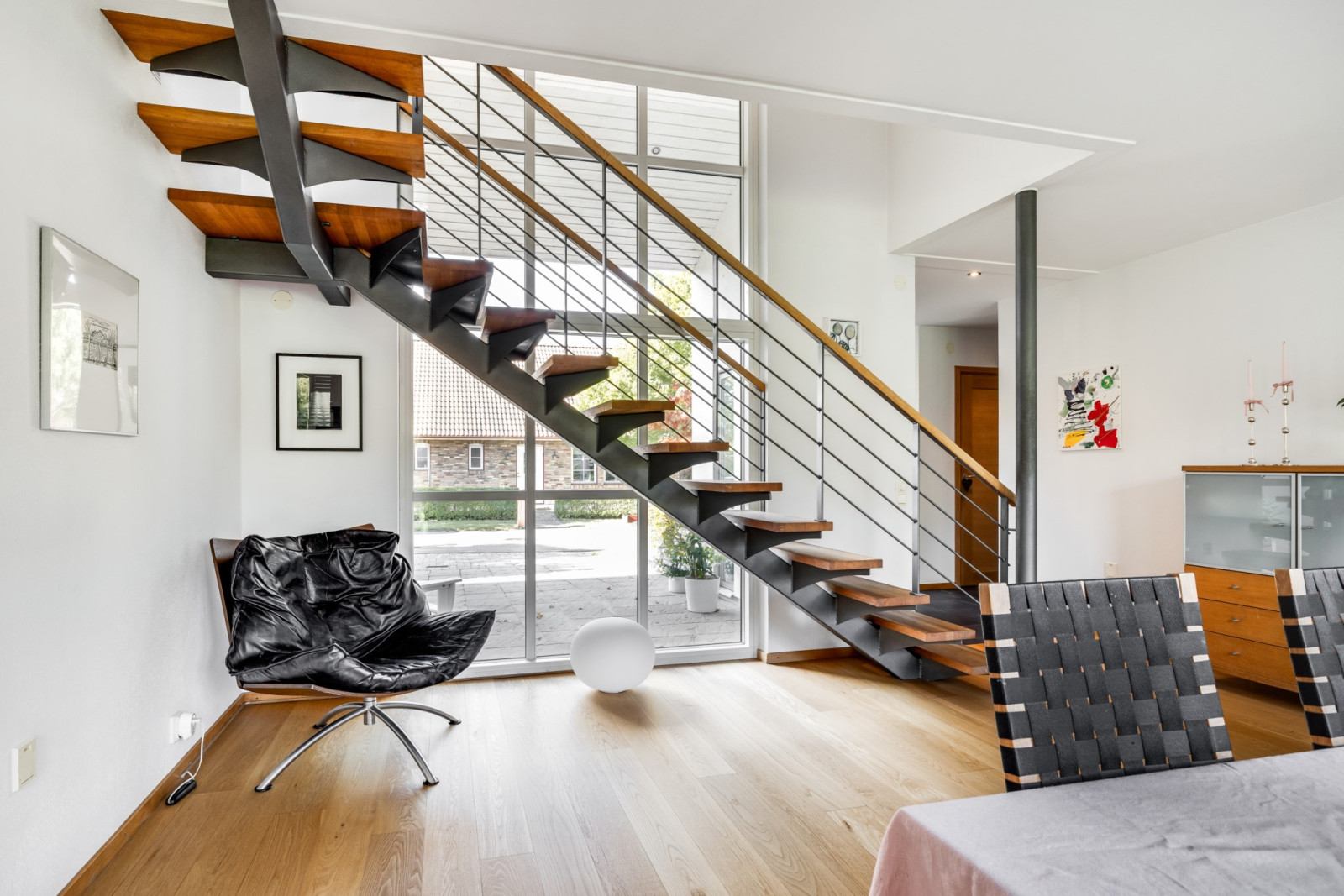 Ekparkettgolv. Utgång till trädgård och uteplats. Trappa upp.