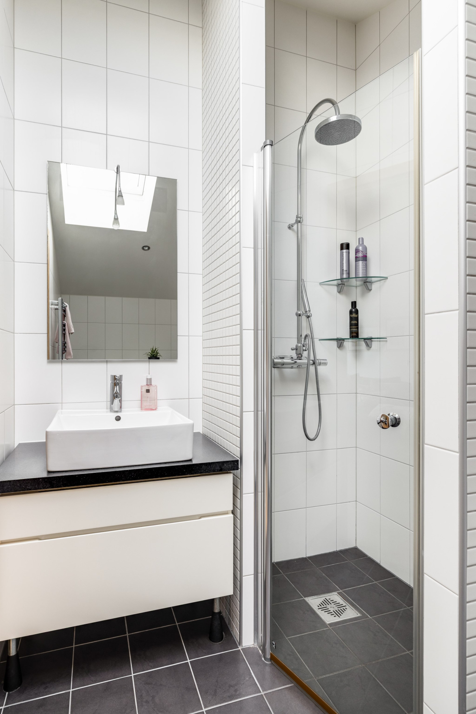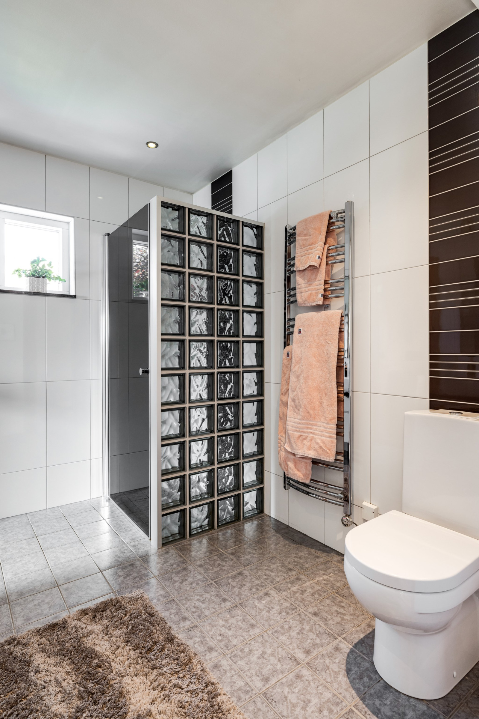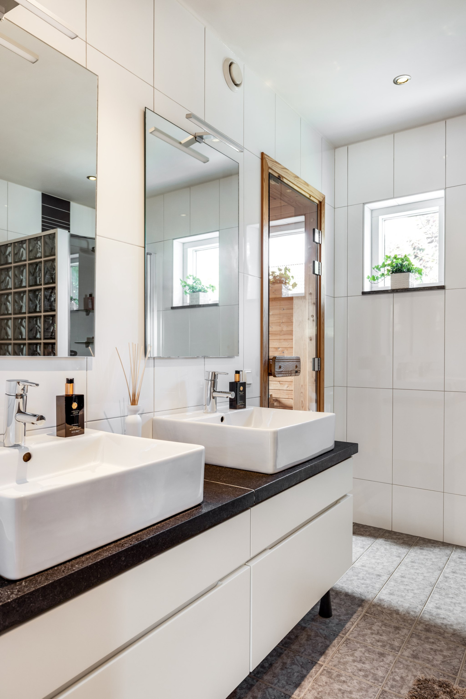 Kakel och klinkergolv. Kommod med dubbelhandfat, dusch, wc-stol, handduksvärmare. Infälld belysning i tak. Bastu med fönster och glasdörr.