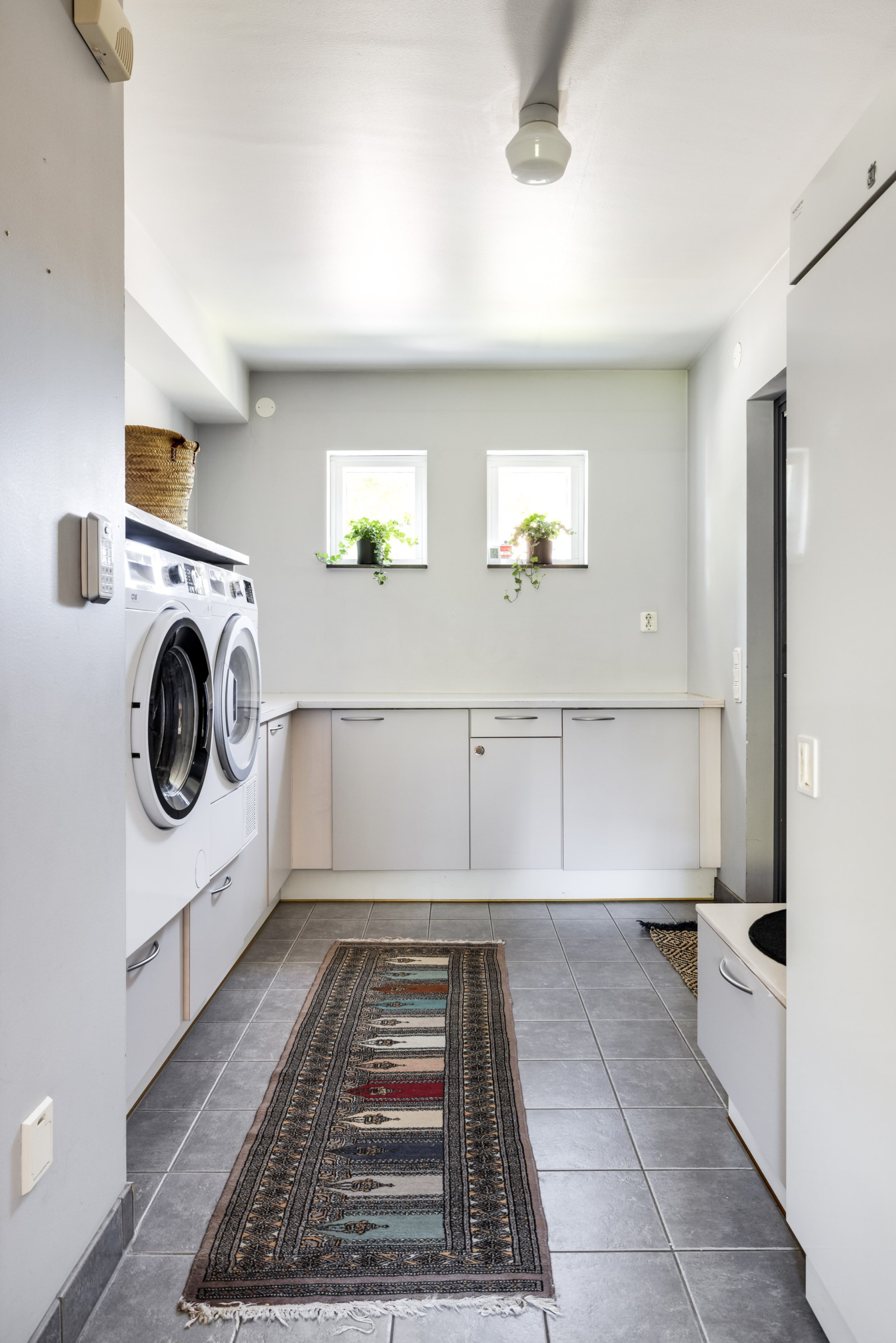 Klinkergolv. Skåpsinredning och klädkammare. Bänkskiva i laminat med vask. Tvättmaskin (Cylinda -21), torktumlare (Cylinda -22), torkskåp (Electrolux -05). Infälld belysning i tak. Utgång mot biluppställningsplats.
