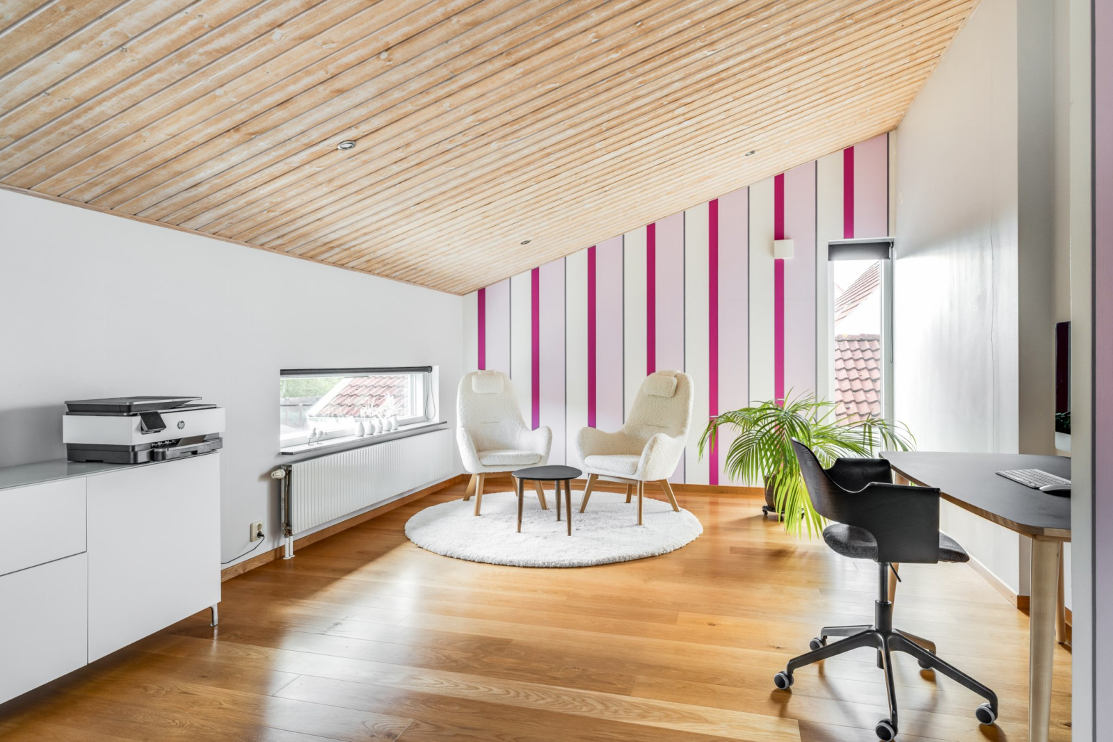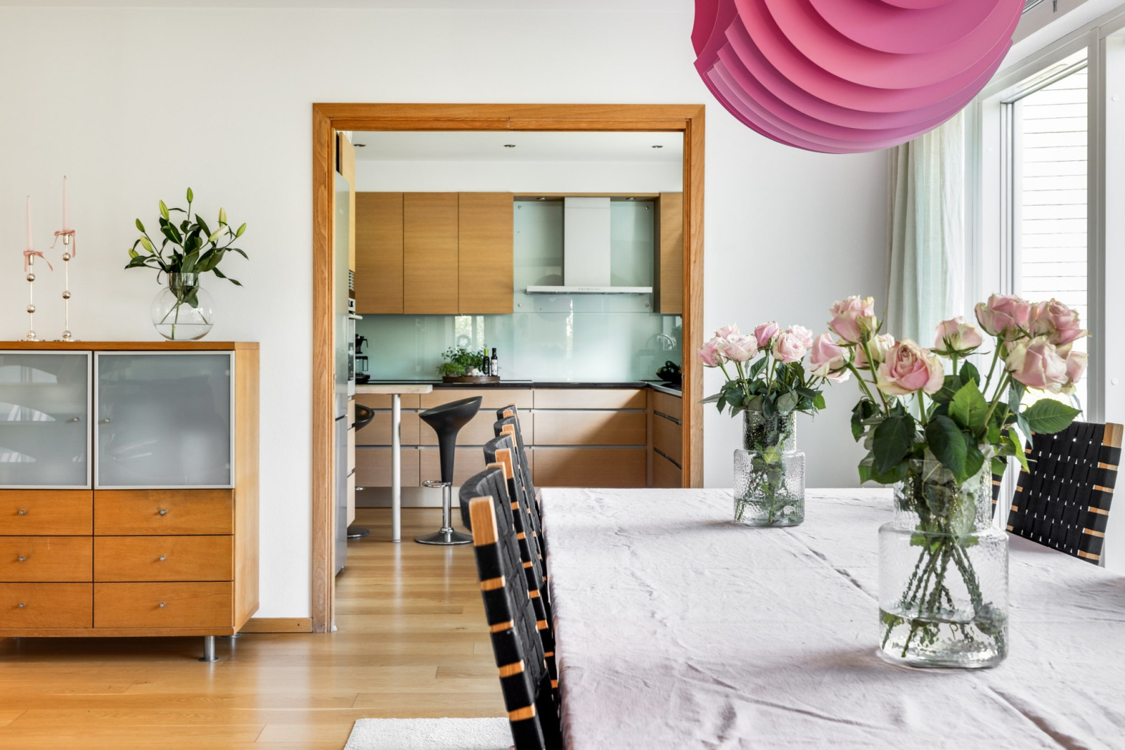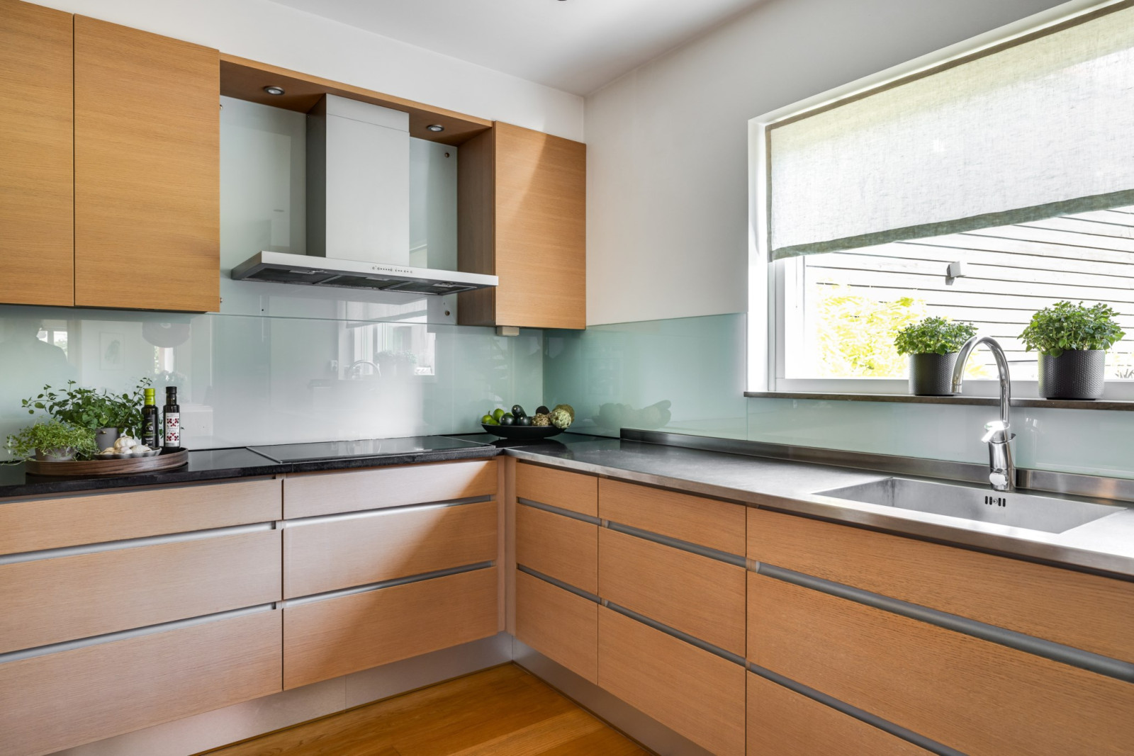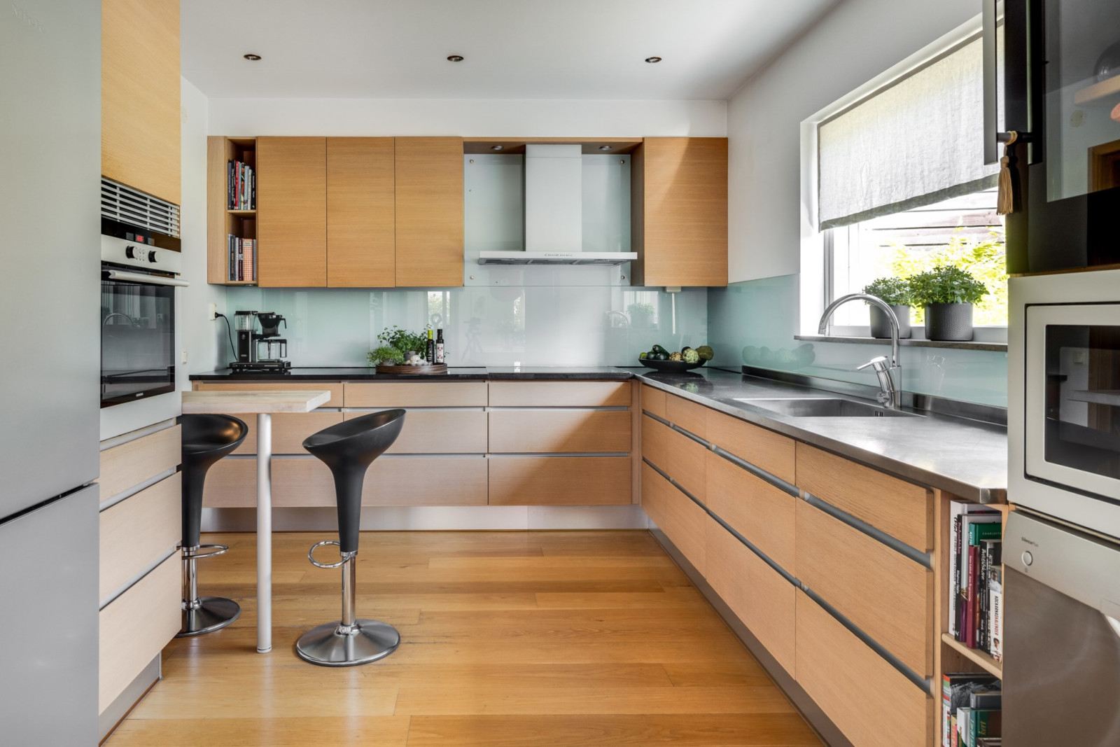 Ekparkettgolv. Infälld belysning i tak