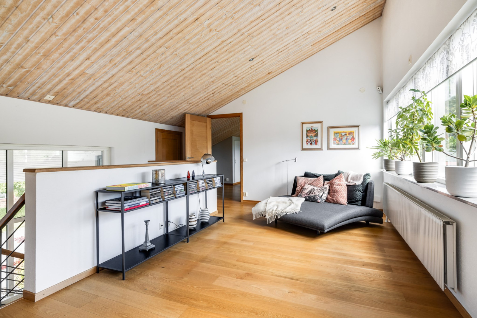 Ekparkettgolv. Kamin. Infälld belysning i tak. Platsbyggt bokhylla.