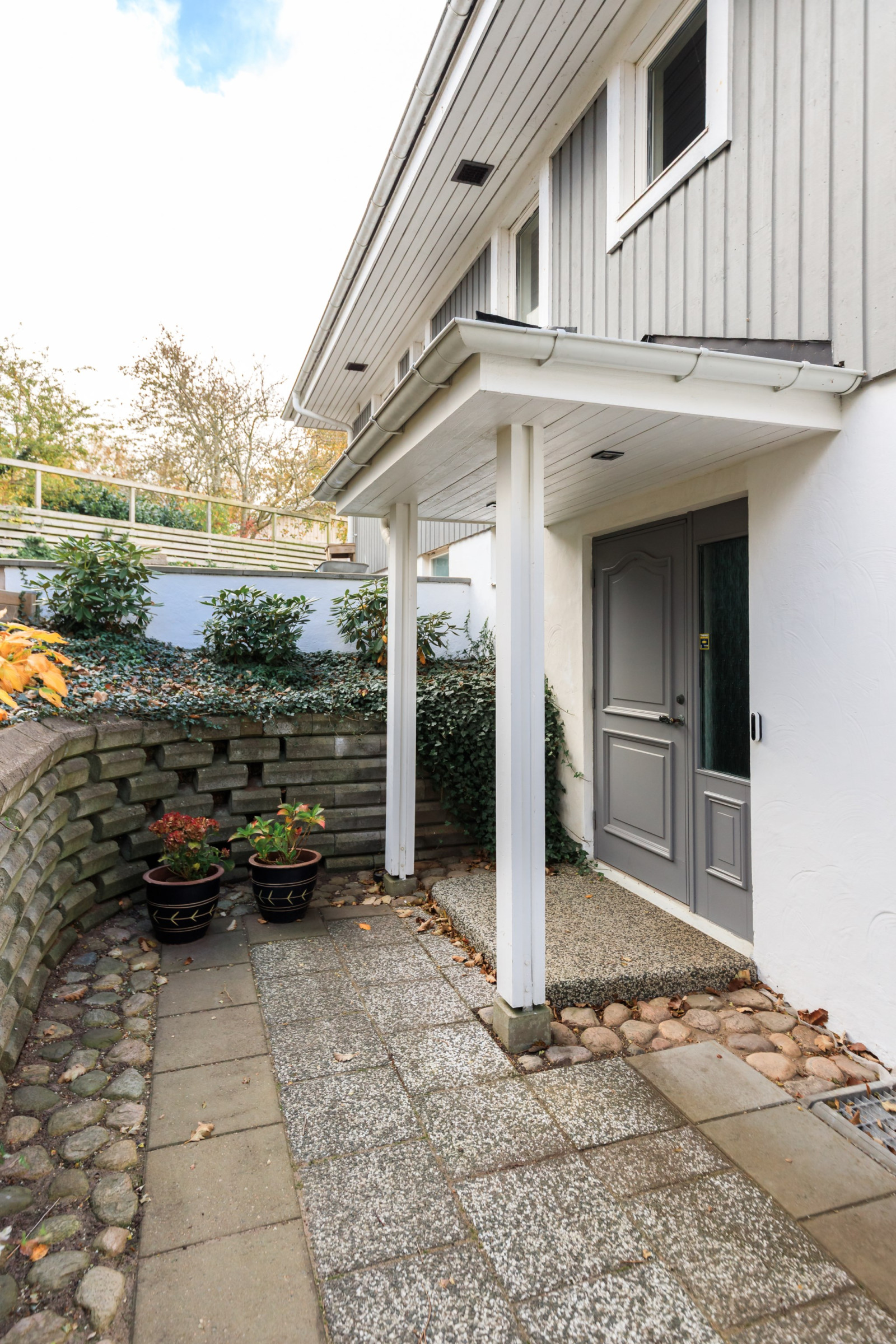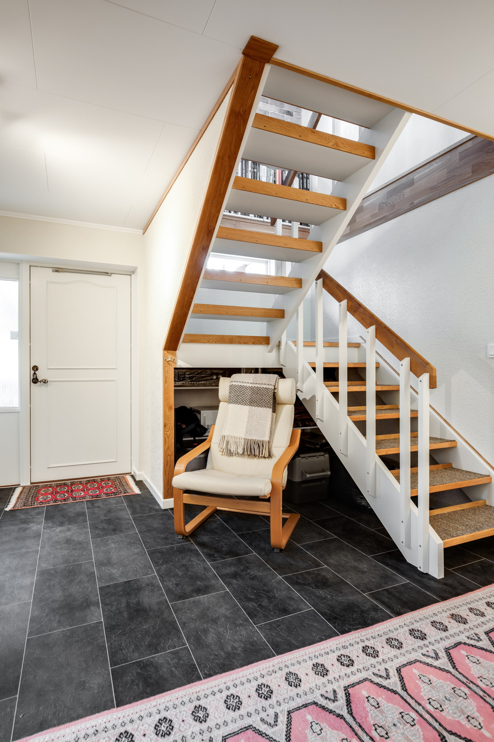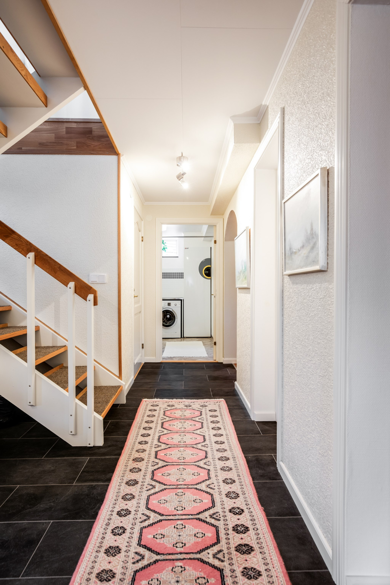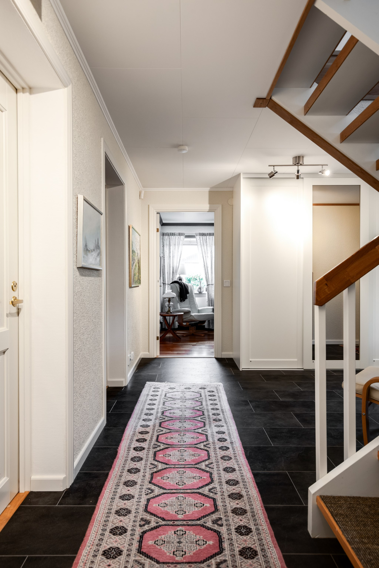 Renovering av hall/entré på sutterängplan med uppsättning av tegelvägg, ommålning samt ny sisalmatta i trappan. Ändring av planlösning genom borttagning av vägg samt nytt golv, Bjelin Nadura komposit. Nya garderober med skjutdörrar för förvaring av ytterkläder och skor.